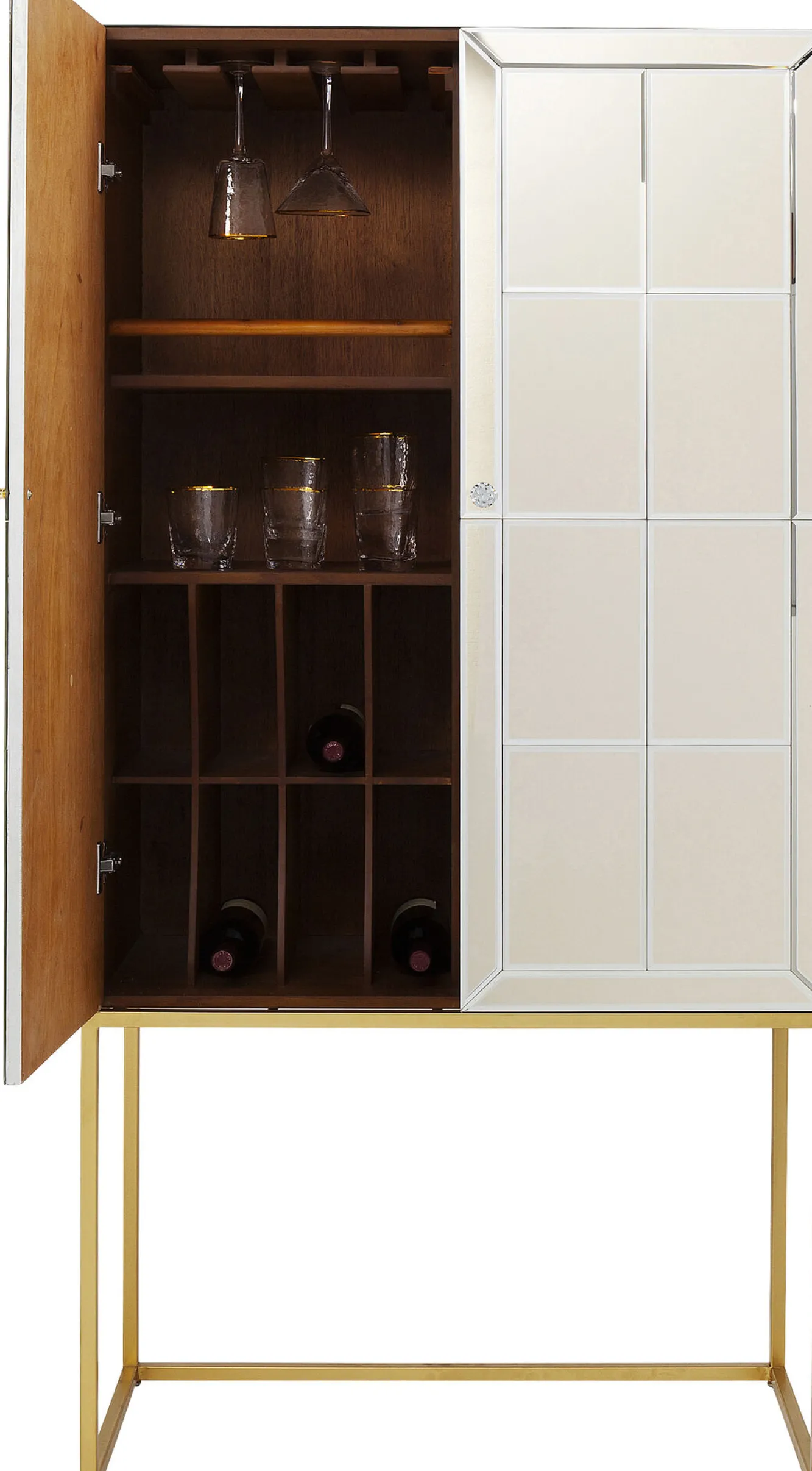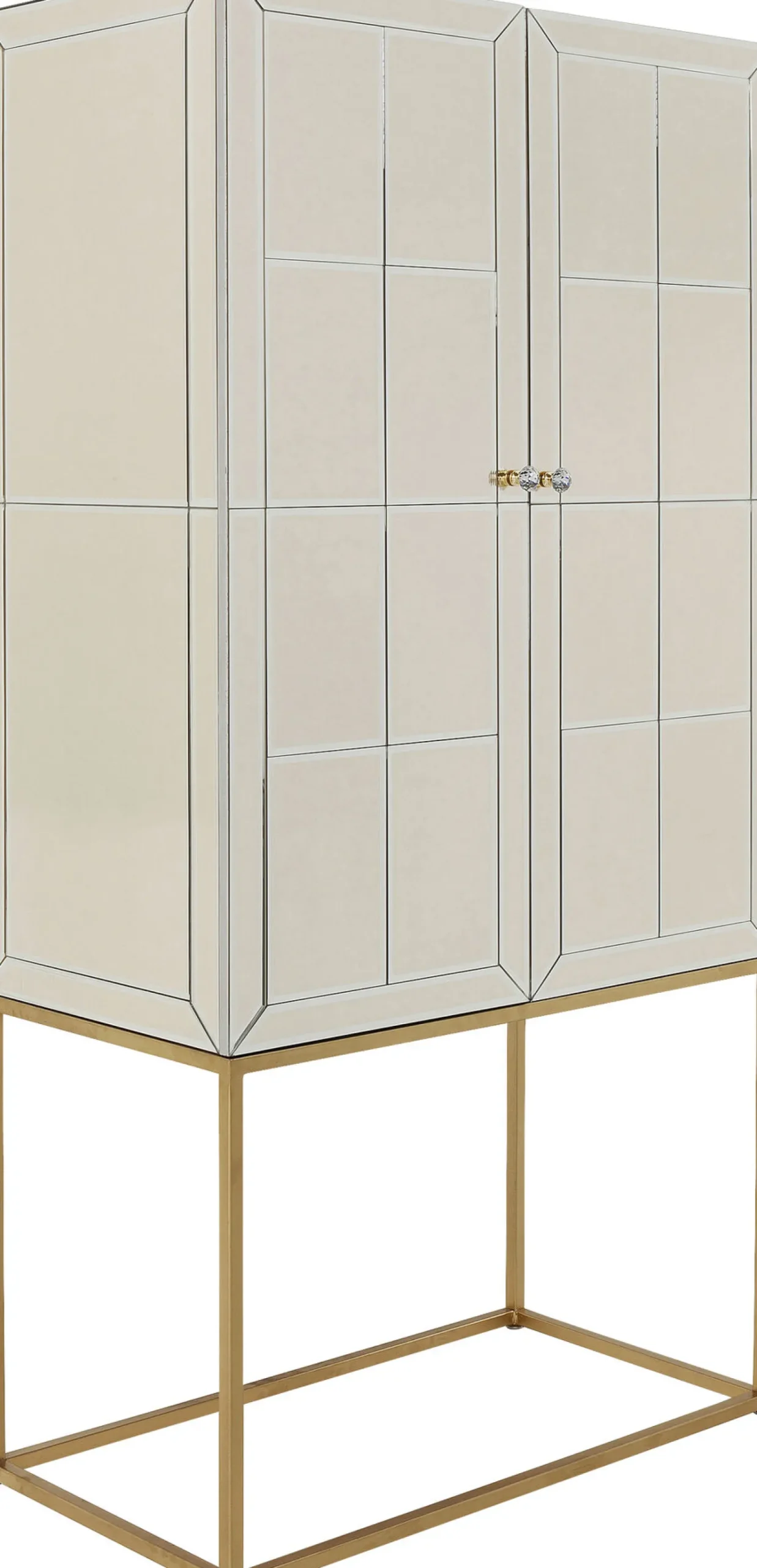 Seria nowoczesnych mebli ze szkła w stylu glamour Luxury oferuje szeroki wybór wyposażenia wnętrz – tutaj złota komoda z funkcją barku.
