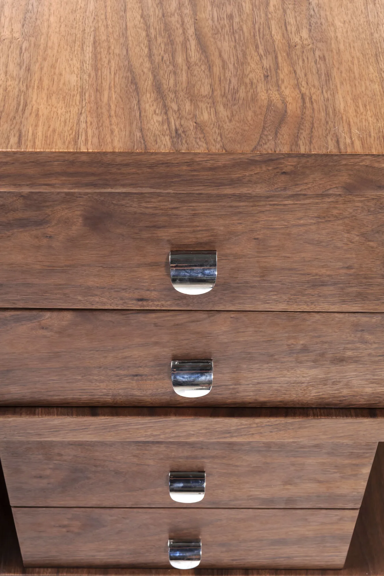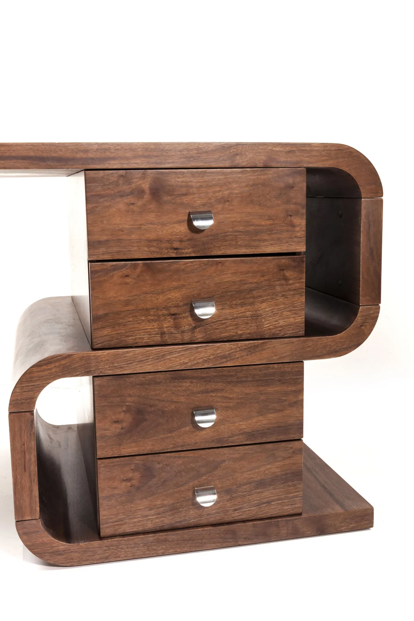 To klasyczne drewniane biurko w stylu vintage sygnowane jest podpisem, skorej do stylistycznych ekstrawagancji, firmy KARE. Wizjonerska niemiecka marka, ikona nowoczesnego designu, znakomicie opanowała trudną sztukę łączenia ekscentryzmu i umiaru. Tutaj łączy szacunek do tradycji ze współczesną funkcjonalnością. Prezentowany model o finezyjnym kształcie wniesie do wnętrza elegancję, harmonię, jak i silnie tchnący nostalgią walor emocjonalny. Ubrany w kolor orzecha włoskiego jawi się szlachetnie i stylowo. Dzięki ponadczasowemu wzornictwu, takie biurko z 4 szufladami doskonale będzie współpracować z rozmaitymi nurtami aranżacyjnymi.