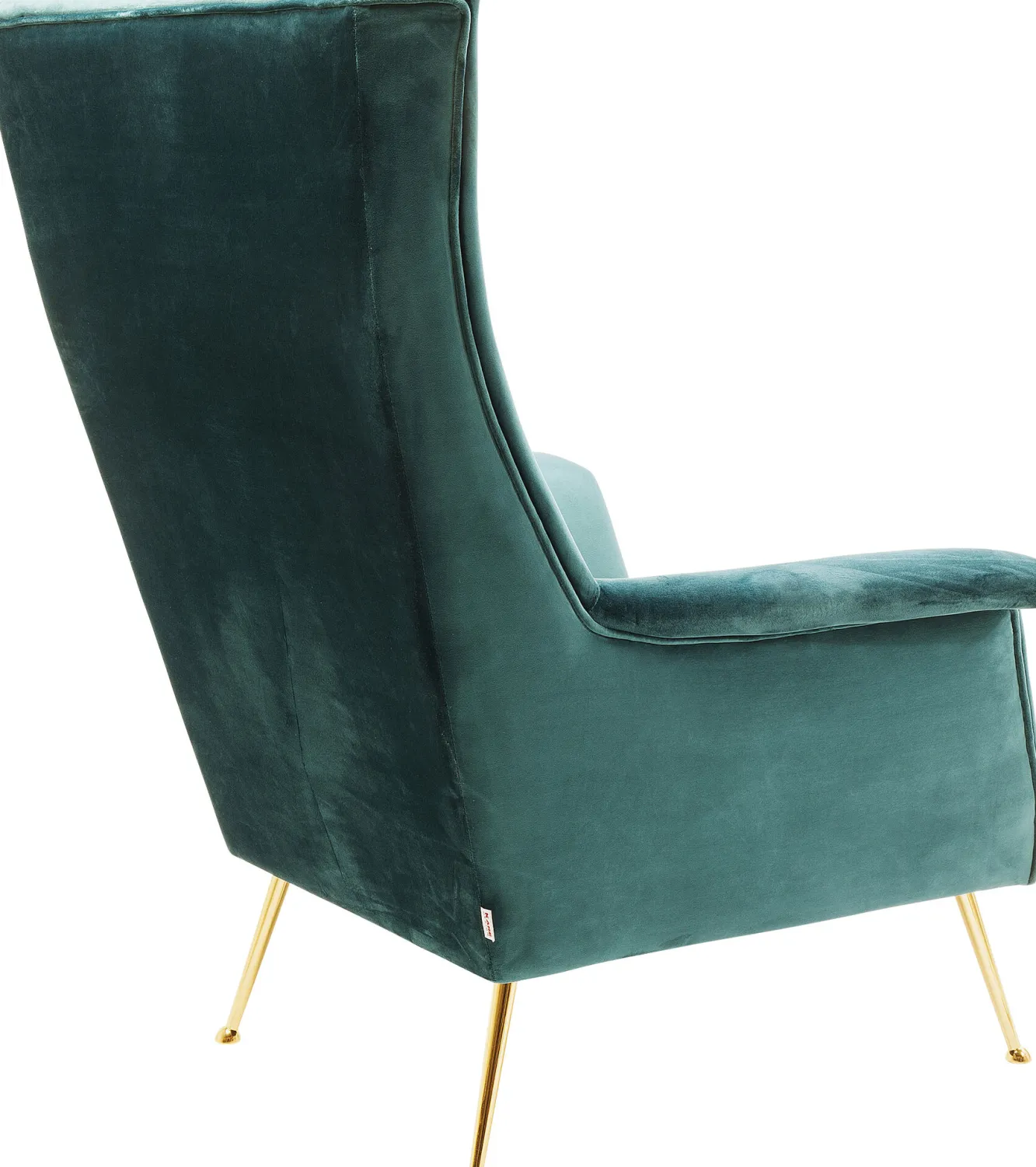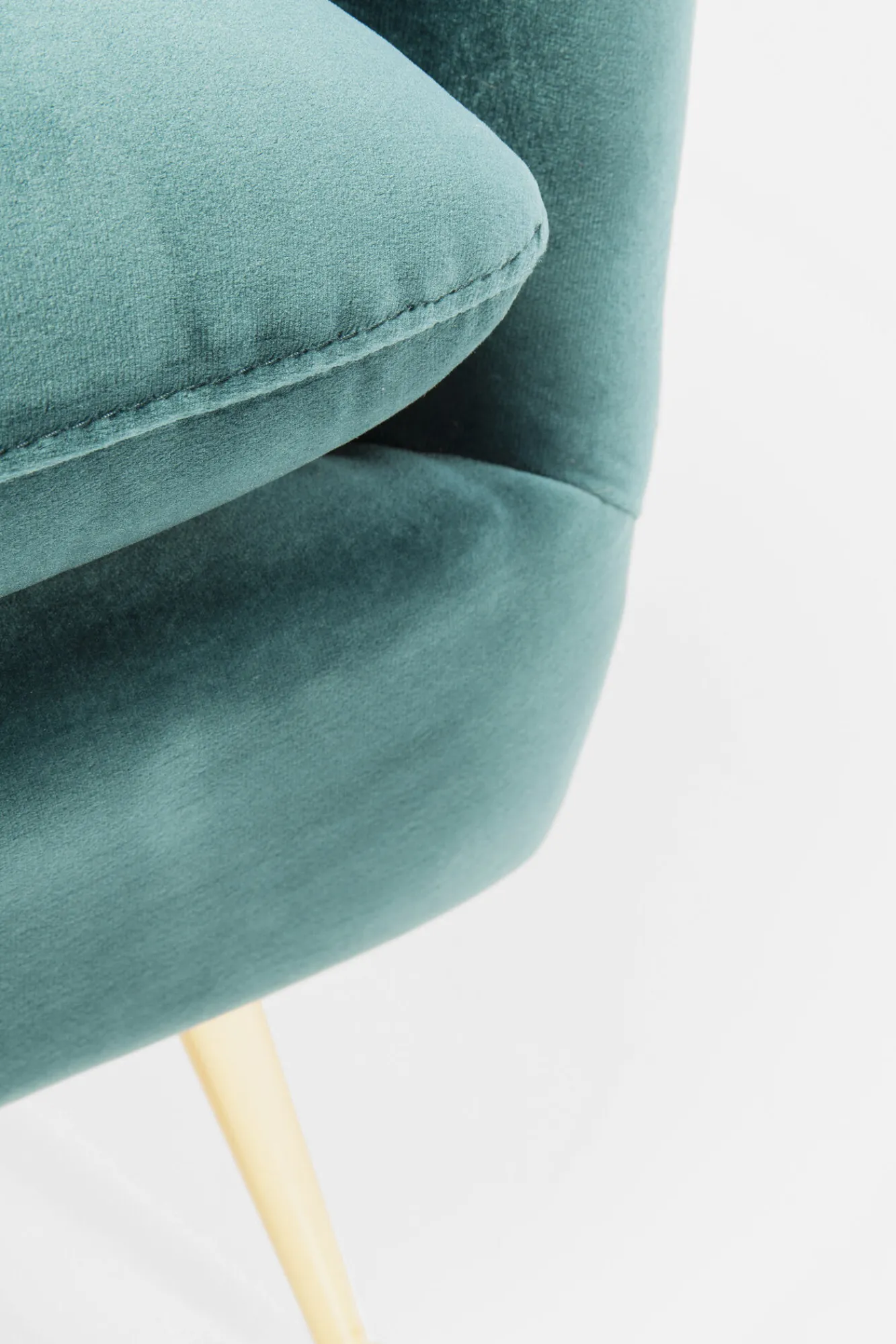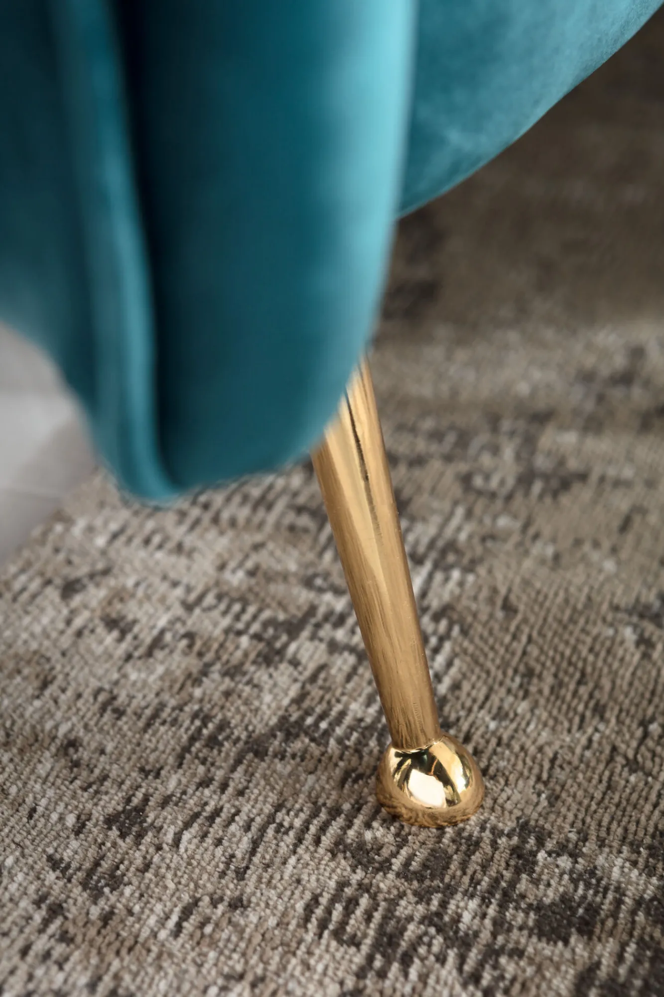 Nowoczesny tapicerowany fotel w stylu glamour Vegas Forever dostępny jest w kilku wariantach kolorystycznych – tutaj fotel welurowy turkusowy na złotych nóżkach.