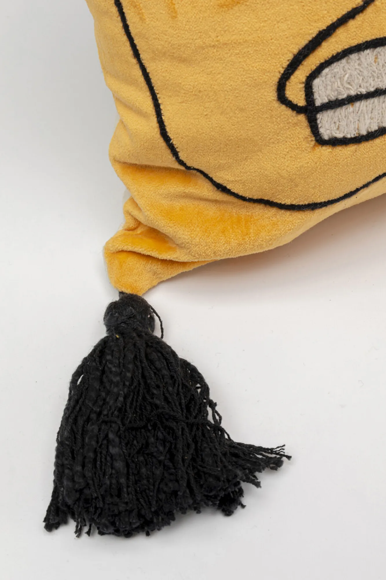 Poduszka dekoracyjna żółta z frędzlami 60×35 cm twarze artystyczne