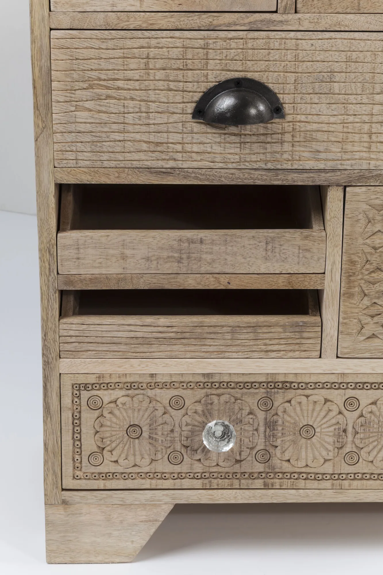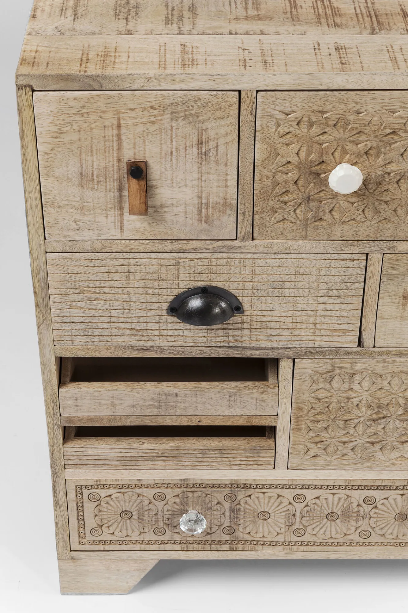 Nowoczesna komoda drewniana w stylu prowansalskim z kolekcji Puro oczaruje Was od pierwszego wejrzenia. Dołącza do naszej oferty za sprawą wizjonerskiej firmy KARE. Niemiecka marka to designerski kameleon – świetnie odnajduje się w każdej wnętrzarskiej estetyce, zarówno przy minimalistycznych, jak i spektakularnych rozwiązaniach aranżacyjnych. Tutaj dostajemy bezpretensjonalny, naturalny design i misterne wzornictwo. Prezentowana komoda z 10 szufladami wykonana została z egzotycznego drewna mango, charakteryzującego się przytulną kolorystyką i wyraźnie zaznaczonym rysunkiem słojów. Stylowe zdobienia, eklektyczne detale i ponadczasowe piękno drewna stanowią dla tej komody kanwę szerokich aranżacyjnych możliwości.