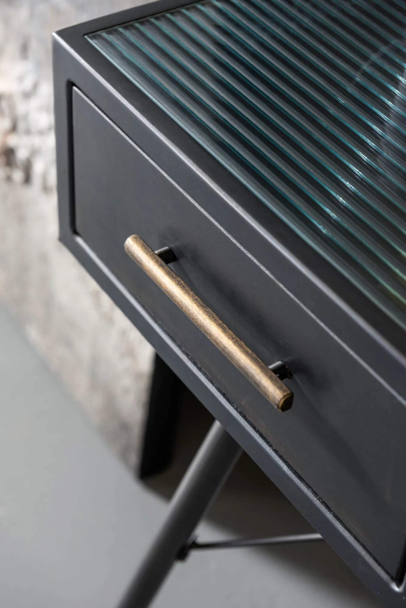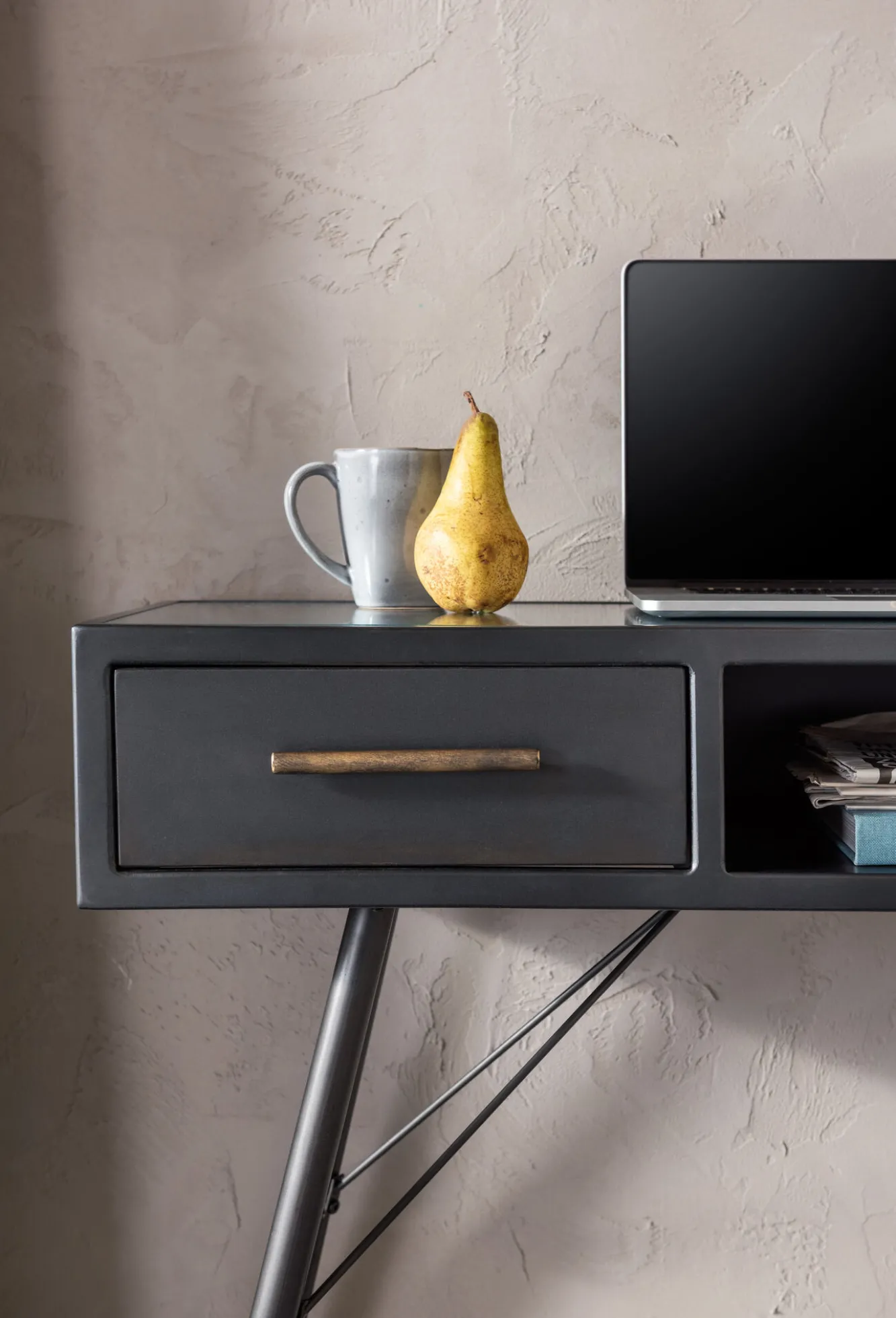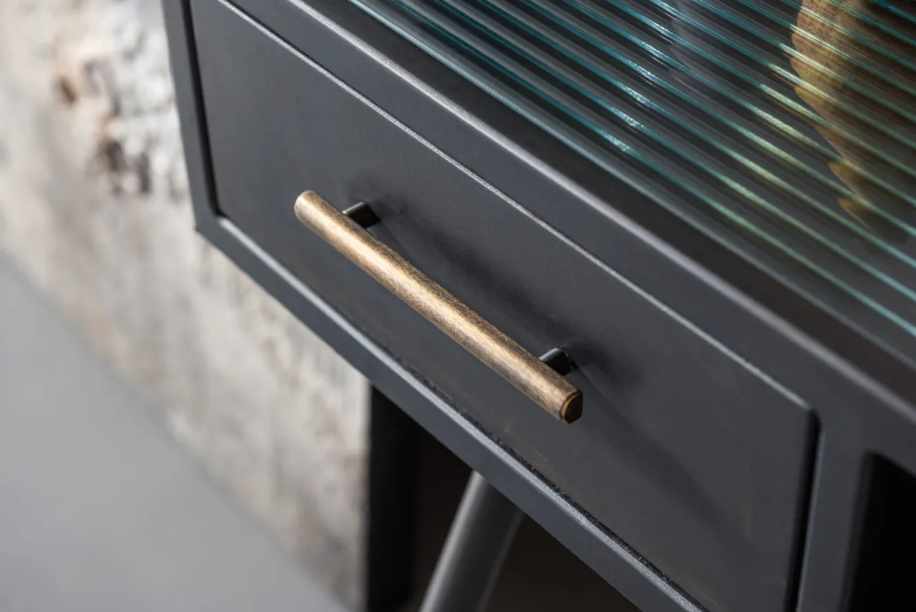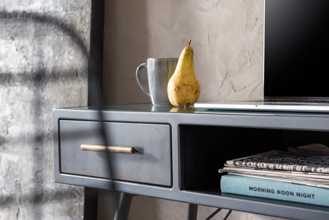 Seria nowoczesnych mebli w stylu industrialnym La Gomera oferuje szeroki wybór modeli – tutaj grafitowa konsola vintage o wymiarach (szerokość x wysokość x głębokość): 120x76x38 cm.