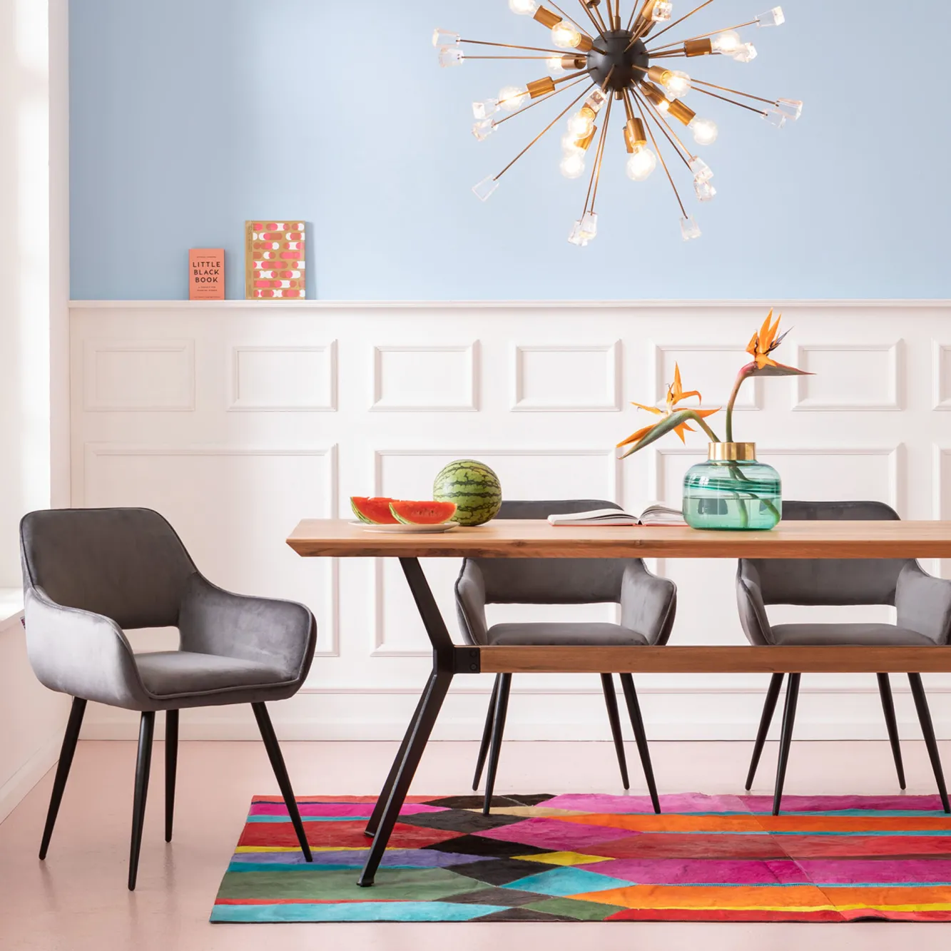 Nowoczesne krzesła z podłokietnikami w stylu skandynawskim San Francisco oferują szeroki wybór wariantów kolorystycznych – tutaj szare krzesło tapicerowane na stalowych czarnych nogach.