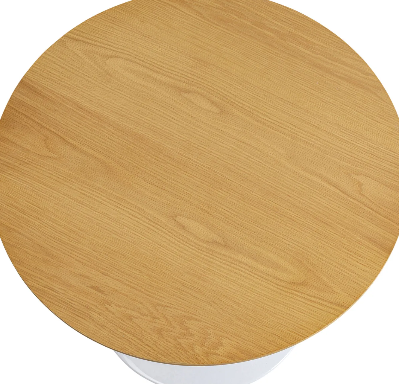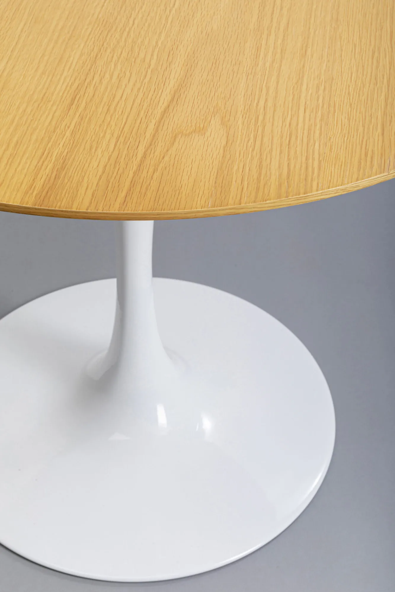 Kolekcja nowoczesnych okrągłych stołów w stylu skandynawskim Invitation Set oferuje szeroki wybór wariantów – tutaj stół z okrągłym blatem o średnicy 90 cm w kolorze naturalnym i nodze ze stali cynkowanej w kolorze białym.