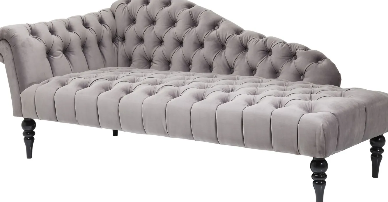 Pikowany szezlong z aksamitu w kolorze szarym na drewnianych nogach, w stylu glamour. Produkt marki Kare Design.