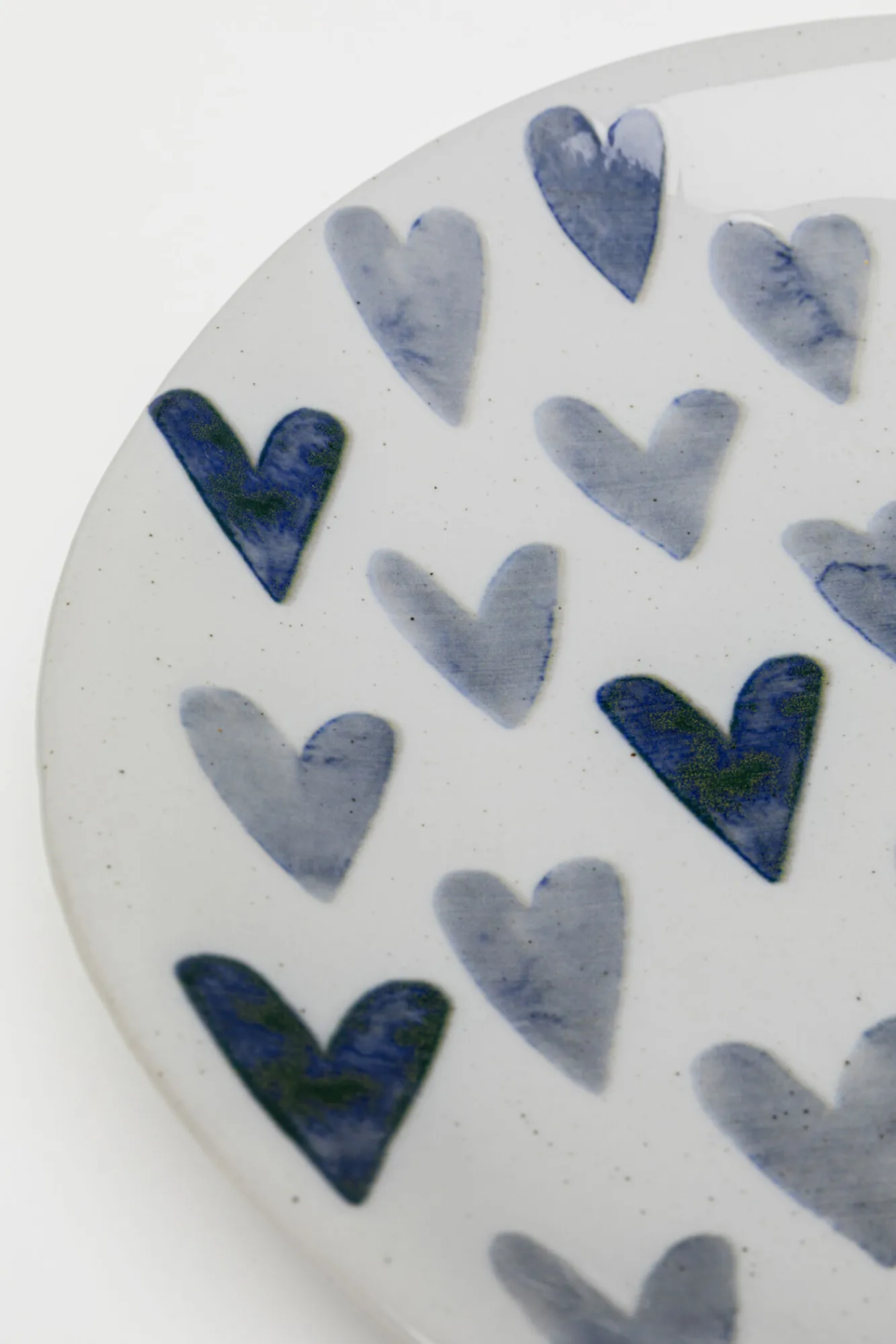 Talerz obiadowy motyw niebieskich serc Ø28 cm Materiał: kamionka szkliwiona.Produkty wykonane z kamionki mogą nieznac…
