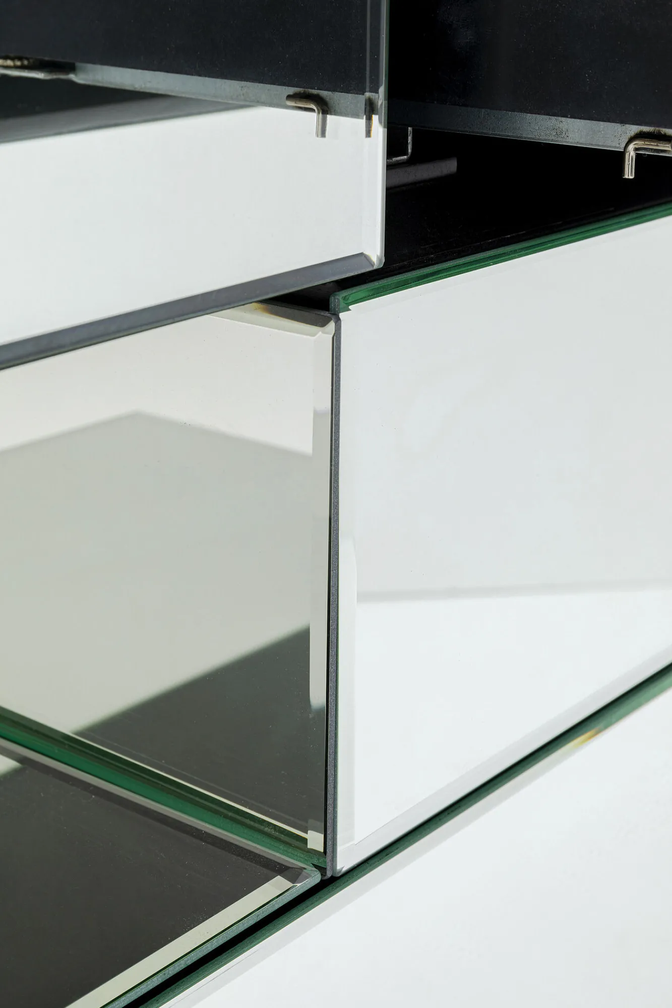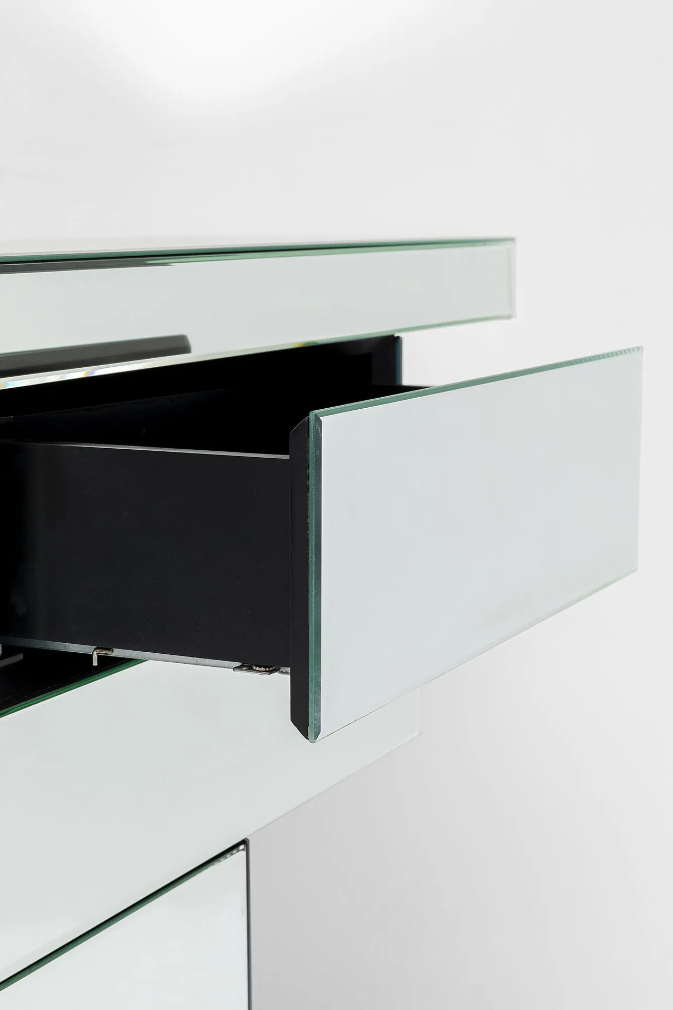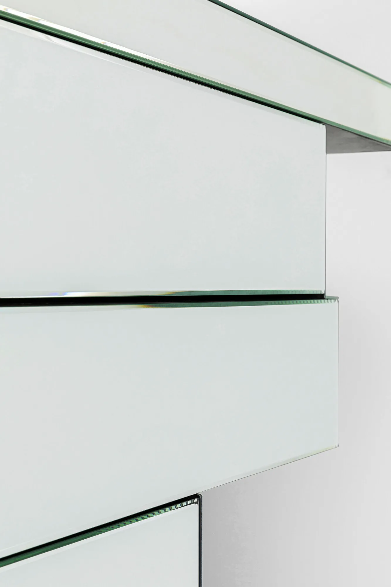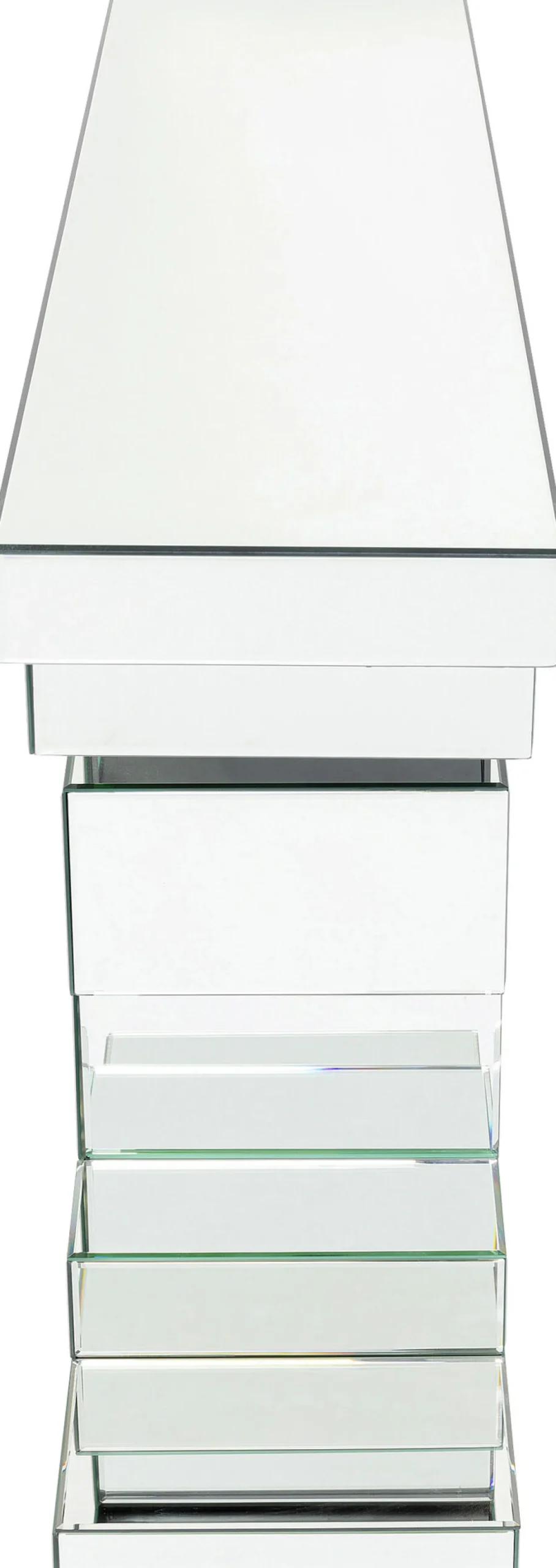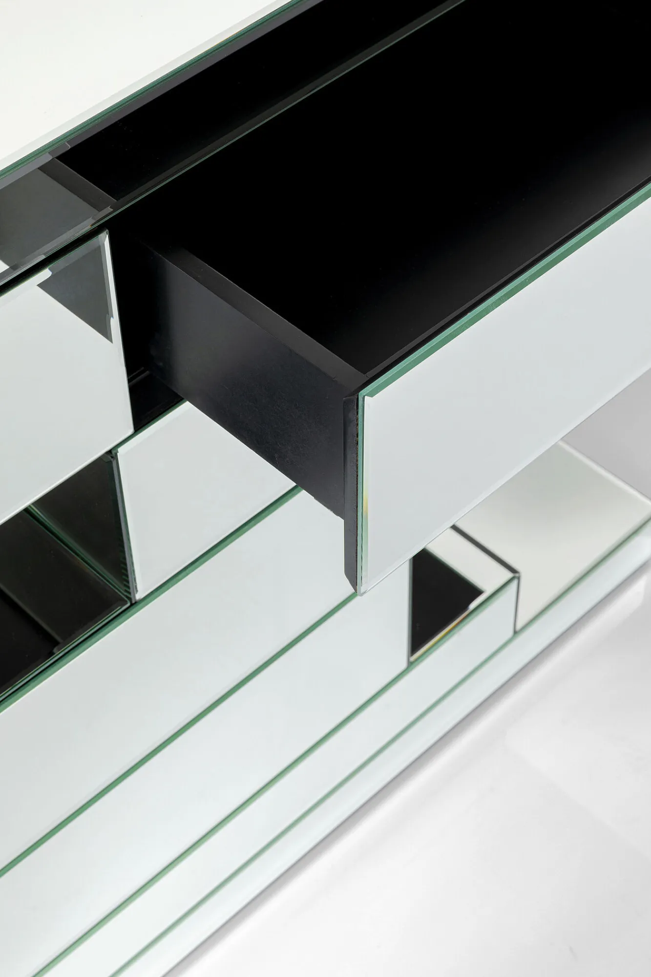 Czy to sztuka? Czy możemy tego użyć? Otóż i to, i to. Ta awangardowa szklana konsola w stylu glamour składająca się z 7 lustrzanych bloków, tworzy stół i pełen blasku i czystego luksusu eksponat. Dołącza do naszej oferty za sprawą wizjonerskiej firmy KARE. Niemiecka marka od ponad trzech dekad odnosi sukcesy w odkrywaniu ikon stylu, rozwijaniu nowych trendów i innowacyjności w projektowaniu. Ten fenomenalny model zaskoczy Was nie tylko nieoczywistym designem, ale i nieoczekiwaną funkcjonalnością. Prawie 1,5 metrowy blat, a na dodatek 3 szuflady – co za dobrodziejstwo! Prezentowana konsola szklana dedykowana jest w szczególności tym wnętrzom, w których mile widziana jest ekskluzywna estetyka.