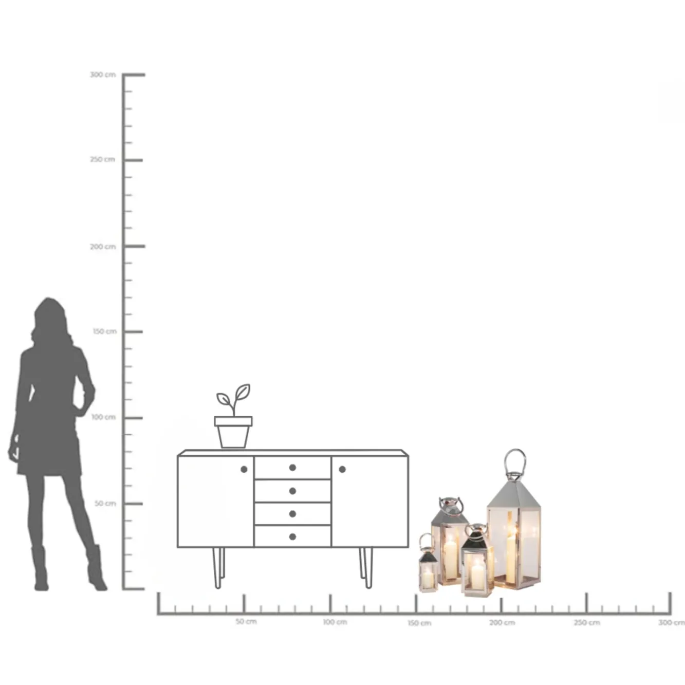 Latarenki Giardino (4-set) srebrneGiardino Latarenki (4/Set) Wymiary największej latarenki: 71 x 24 x 23 cm