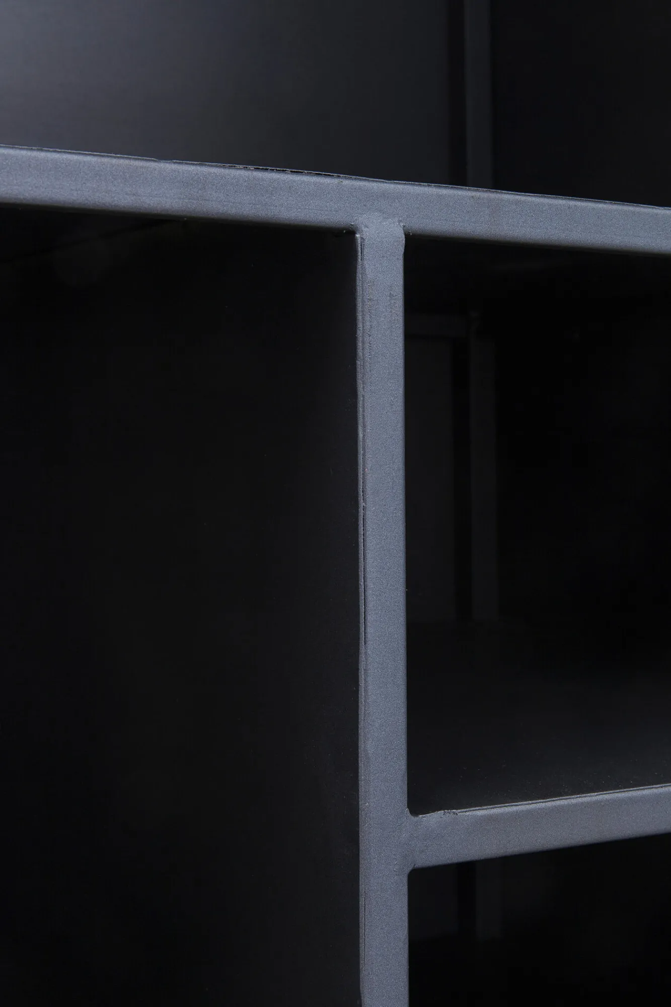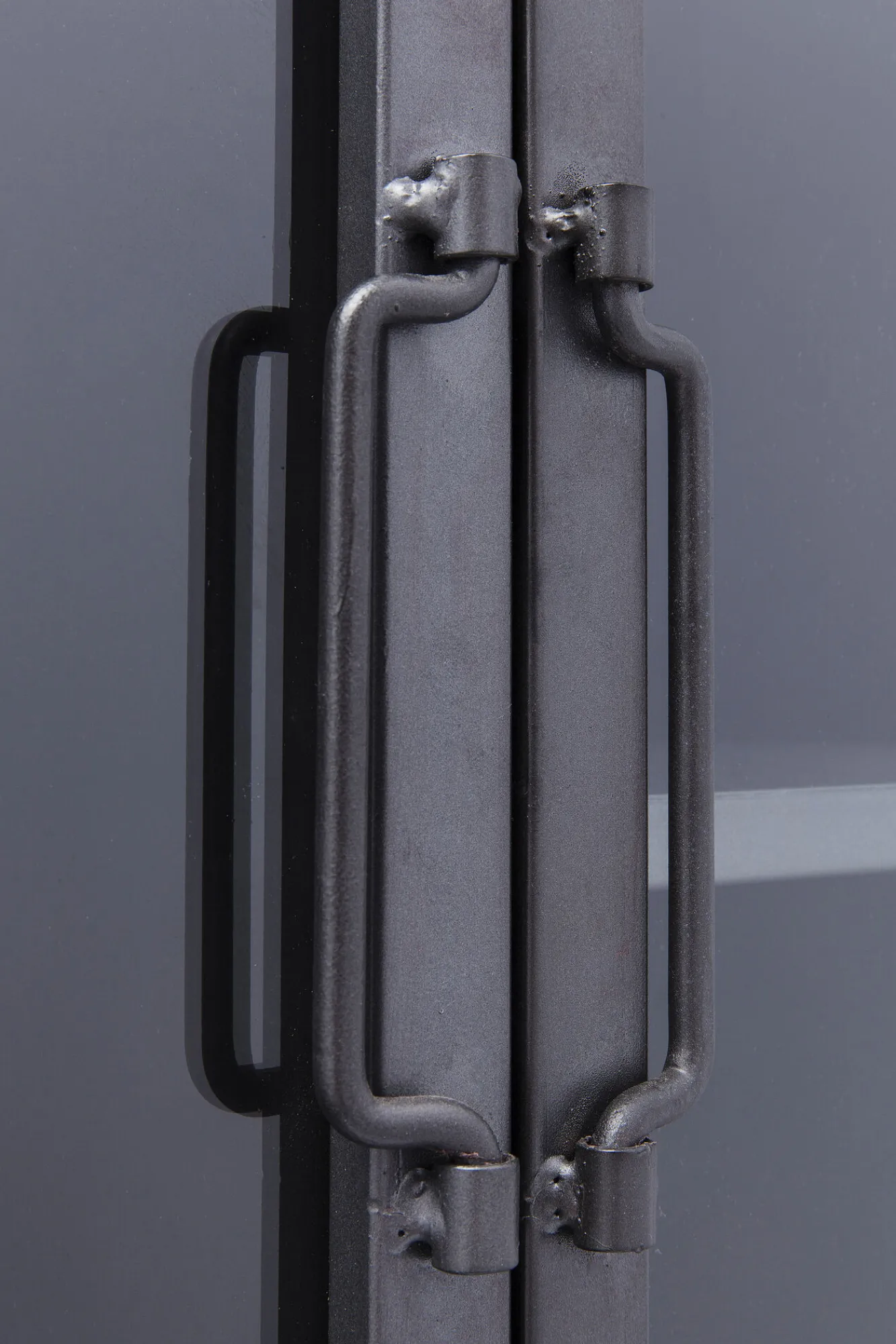 Seria nowoczesnych mebli w stylu industrialnym Refugio obejmuje kilka propozycji – tutaj szara witryna drewniana ze szklanymi drzwiczkami.
