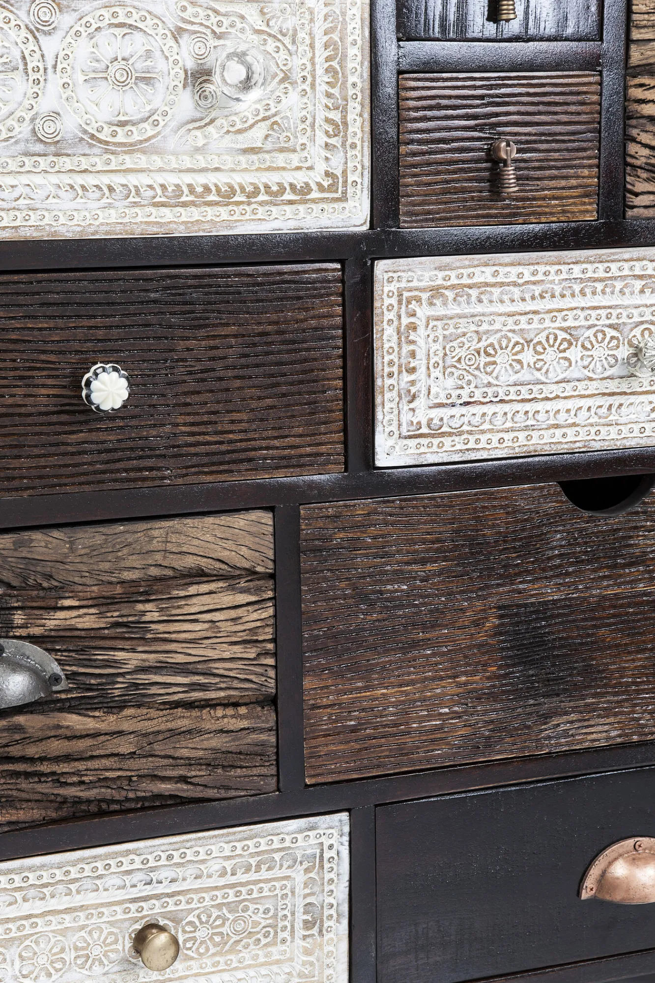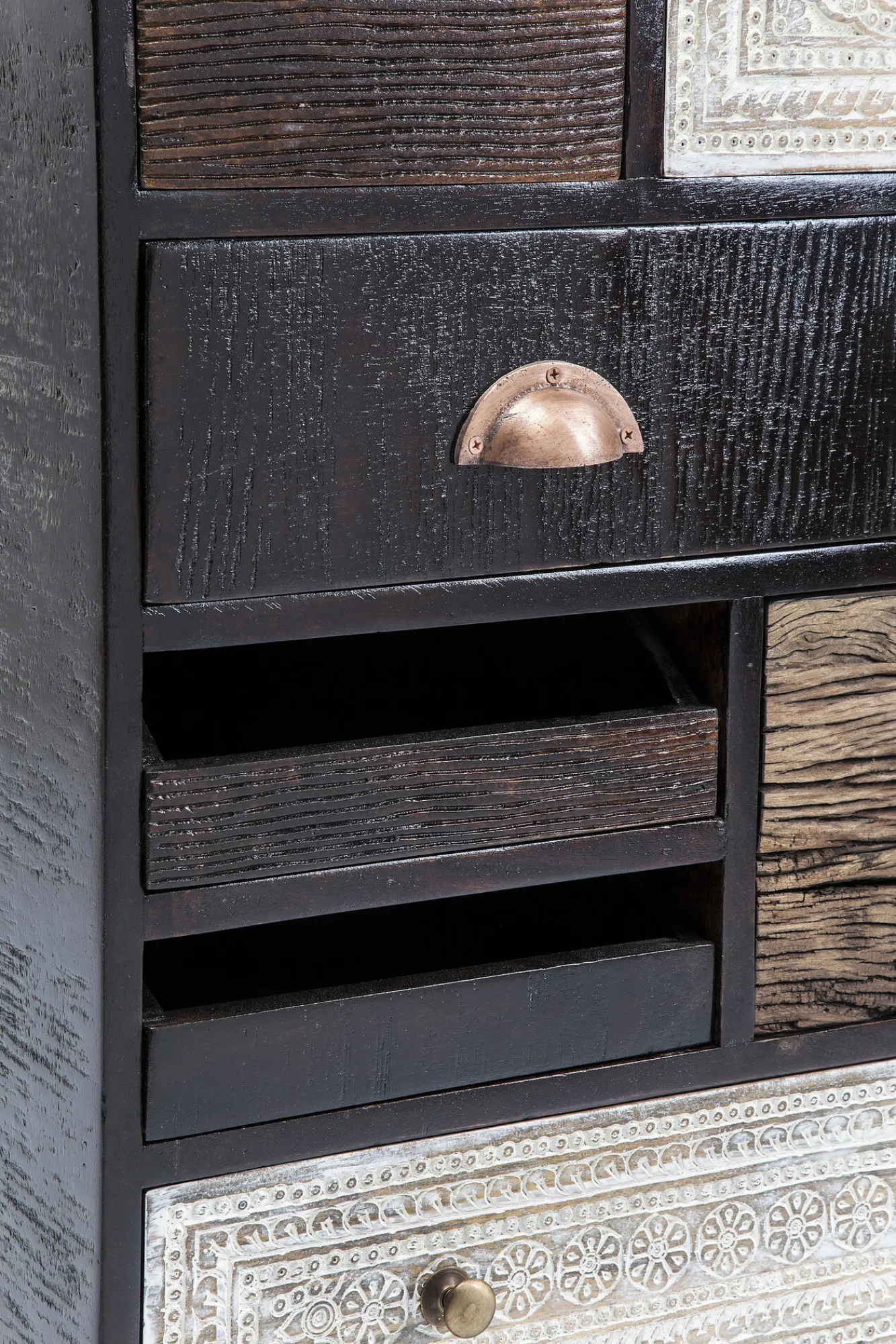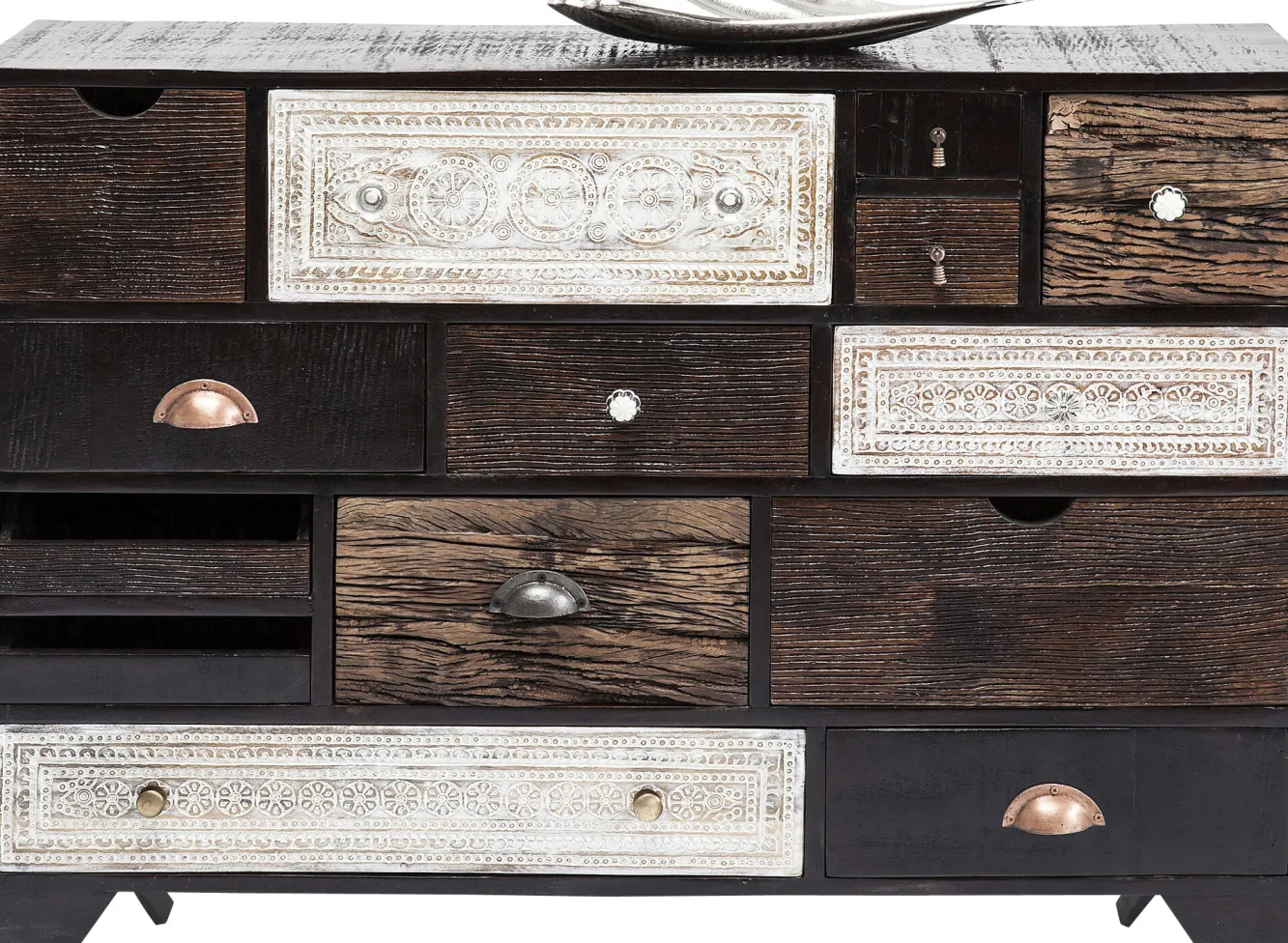 Ciemnobrązowa komoda drewniana w stylu industrialnym Finca jest jednocześnie nowoczesna i romantyczna. Do naszej oferty wkracza za pośrednictwem wizjonerskiej firmy KARE, słynącej z niepodrabialnego designu. Niemiecka marka powołuje się na rozmaite inspiracje, nie lubi się powtarzać i mówi stanowcze NIE bylejakości oraz przeciętności. W tym przypadku producent odsłania przed Wami mebel, który spełni Wasze zarówno estetyczne, jak i praktyczne wymogi i pozwoli na nowo tchnąć życie w Wasz wystrój wnętrza. Prezentowana komoda ciemnobrązowa charakteryzuje się dekoracyjnymi frontami inspirowanymi wschodnią ornamentyką. Finezyjne, niebanalne wzornictwo idzie tutaj w parze z wysoką funkcjonalnością. Unikatowa oraz pełna harmonii komoda drewniana odpowiada licznym współczesnym rozwiązaniom we wnętrzarstwie.