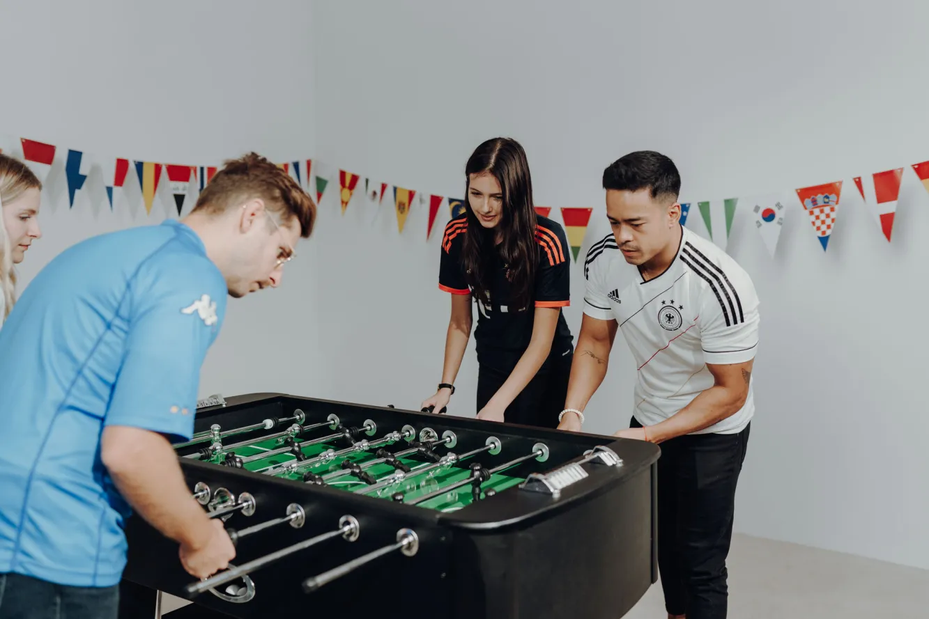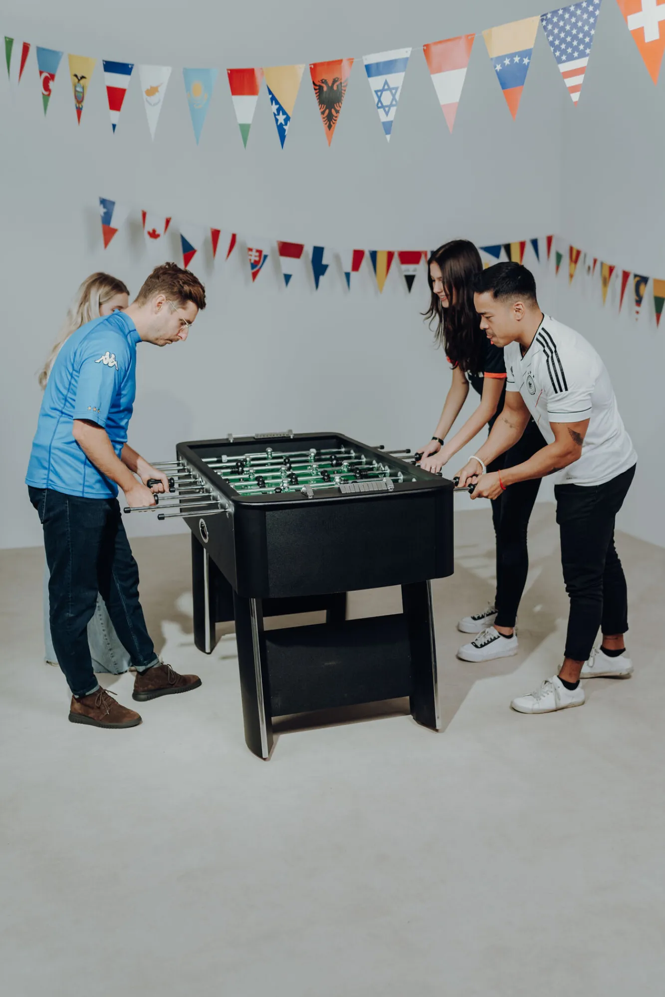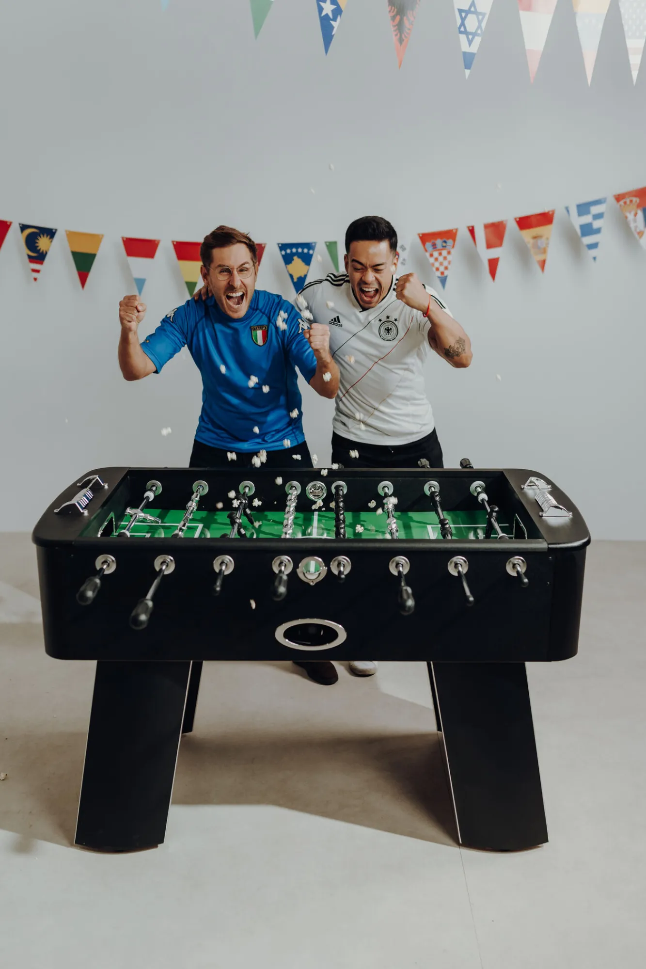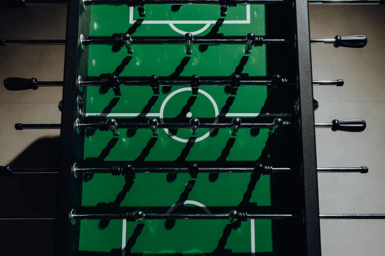 Stół do gry w piłkarzyki w kolorze czarnym z zielonym boiskiem i kolorowymi piłkarzykami marki Kare Design. Szerokość 145.4 cm. Wysokość 88.3cm. Głębokość 76.2cm. Stół do gry w piłkarzyki w kolorze czarnym z zielonym boiskiem i kolorowymi piłkarzykami marki Kare Design. Szerokość 145.4 cm. Wysokość 88.3cm. Głębokość 76.2cm.