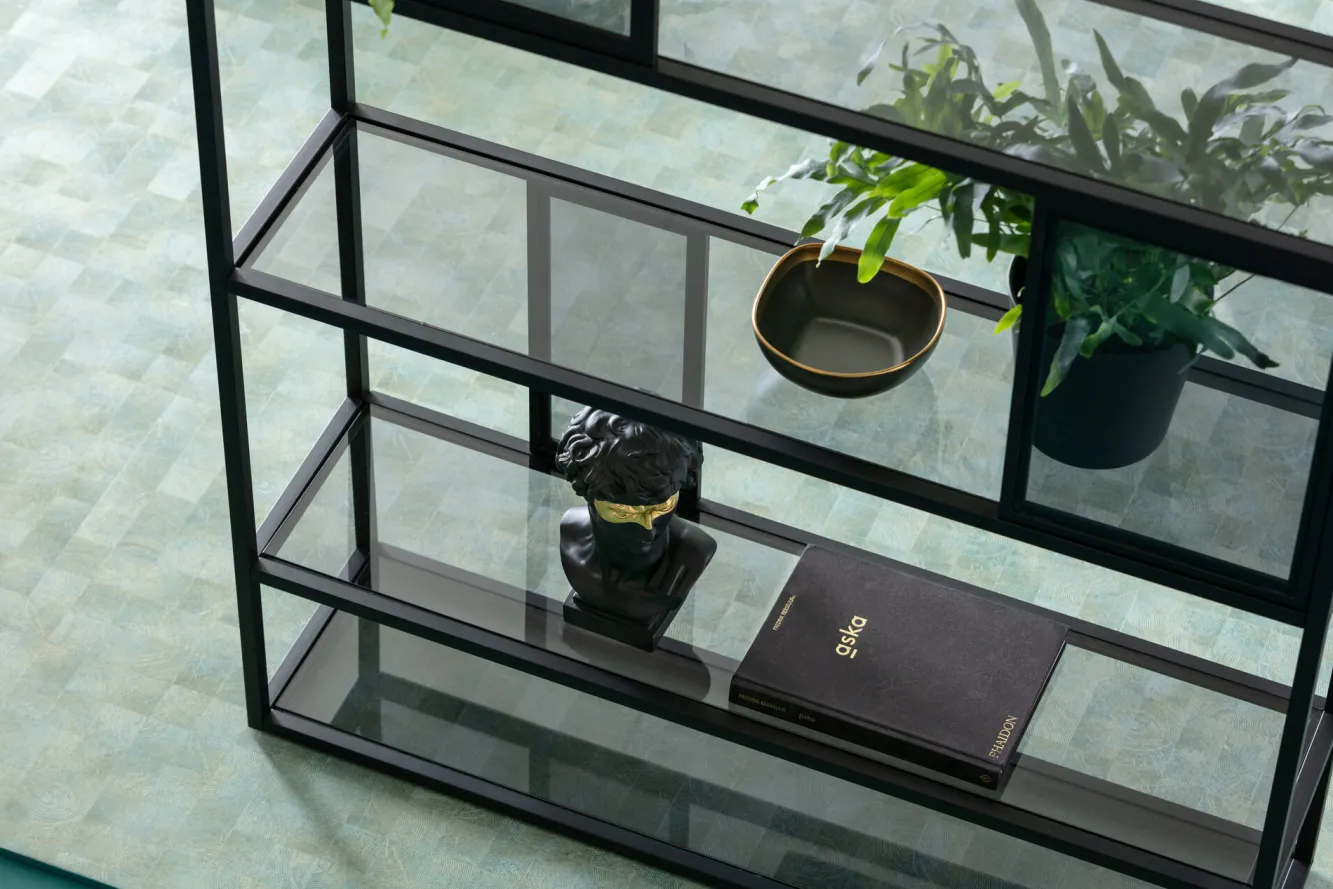 Regał stojący półki szklane przydymione rama czarna stalowa 115×195 cm Półki: szkło hartowane, bezpieczne.Rama, n…