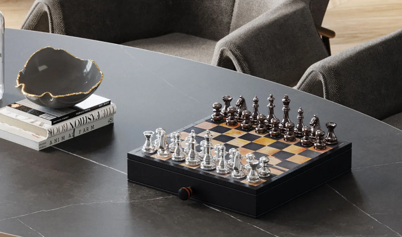 Szachy Antique 36×33 cm Materiały: MDF, róg bydlęcy, aluminium niklowane.Ręczne wykonanie. Każdy egzemplarz jest ni…