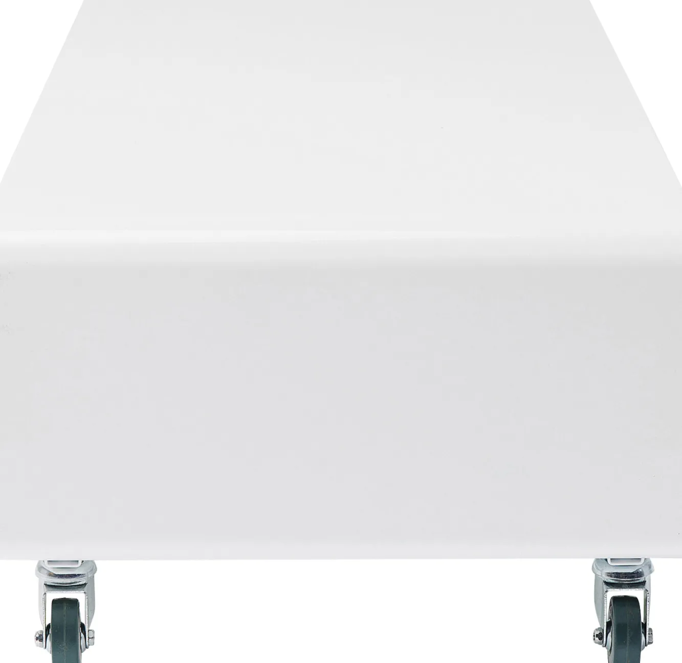 Nowoczesna szafka pod telewizor na wysoki połysk posiada bardzo prostą konstrukcję składającą się z blatu i dwóch otwartych półek. Lekkich i oszczędnych w wyrazie kształtów dopełniają tutaj kółka w podstawie, które z powodzeniem zastępują klasyczne nóżki. Dzięki nim mebel jest mobilny, a to zaleta, która pozwala na dopasowanie go do indywidulanych potrzeb i częste zmiany aranżacji. Dużym atutami z pewnością są tutaj także praktyczne rozwiązania konstrukcyjne i ponadczasowa kolorystyka.