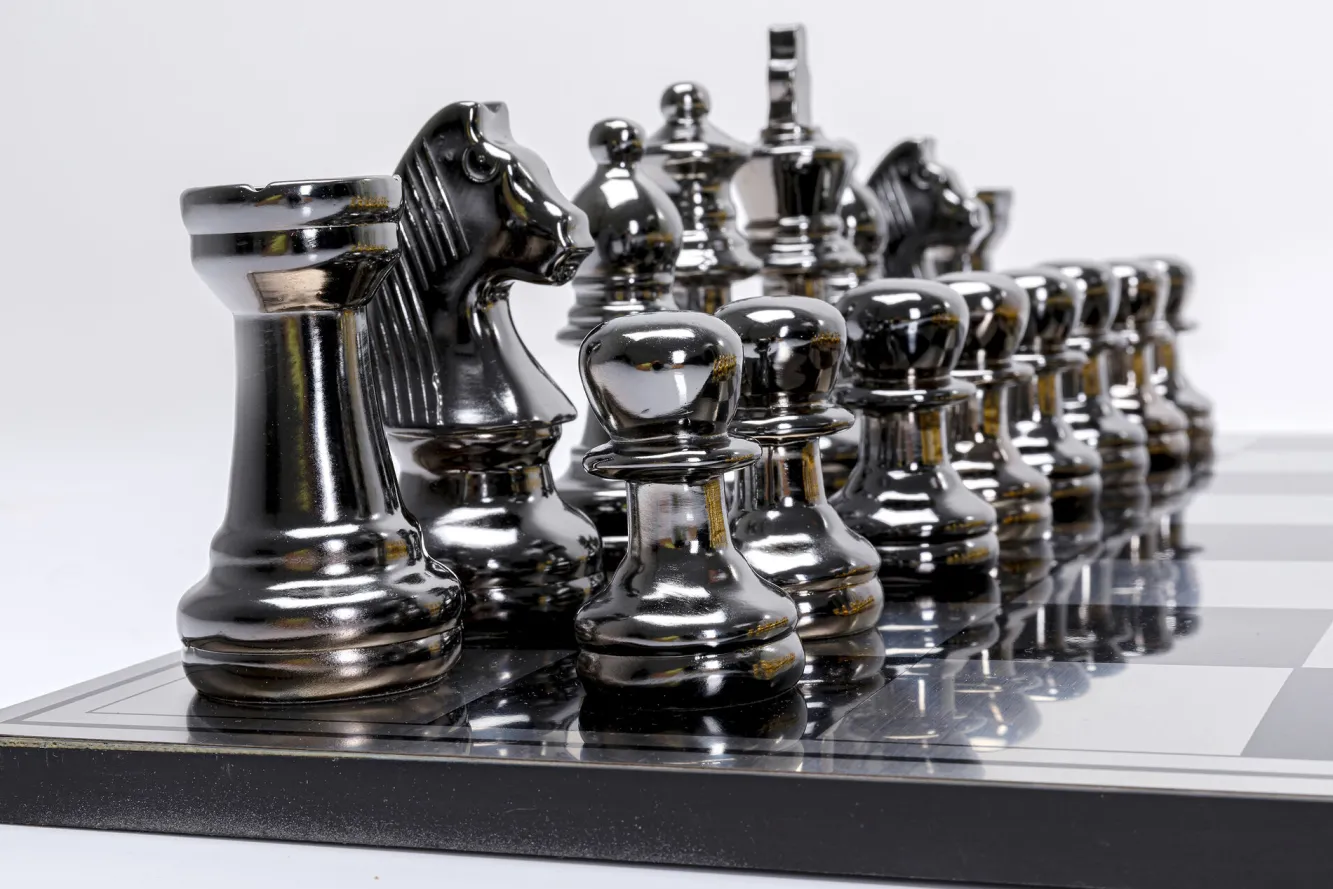 Szachownica: stal nierdzewna, płyta MDF lakierowana.