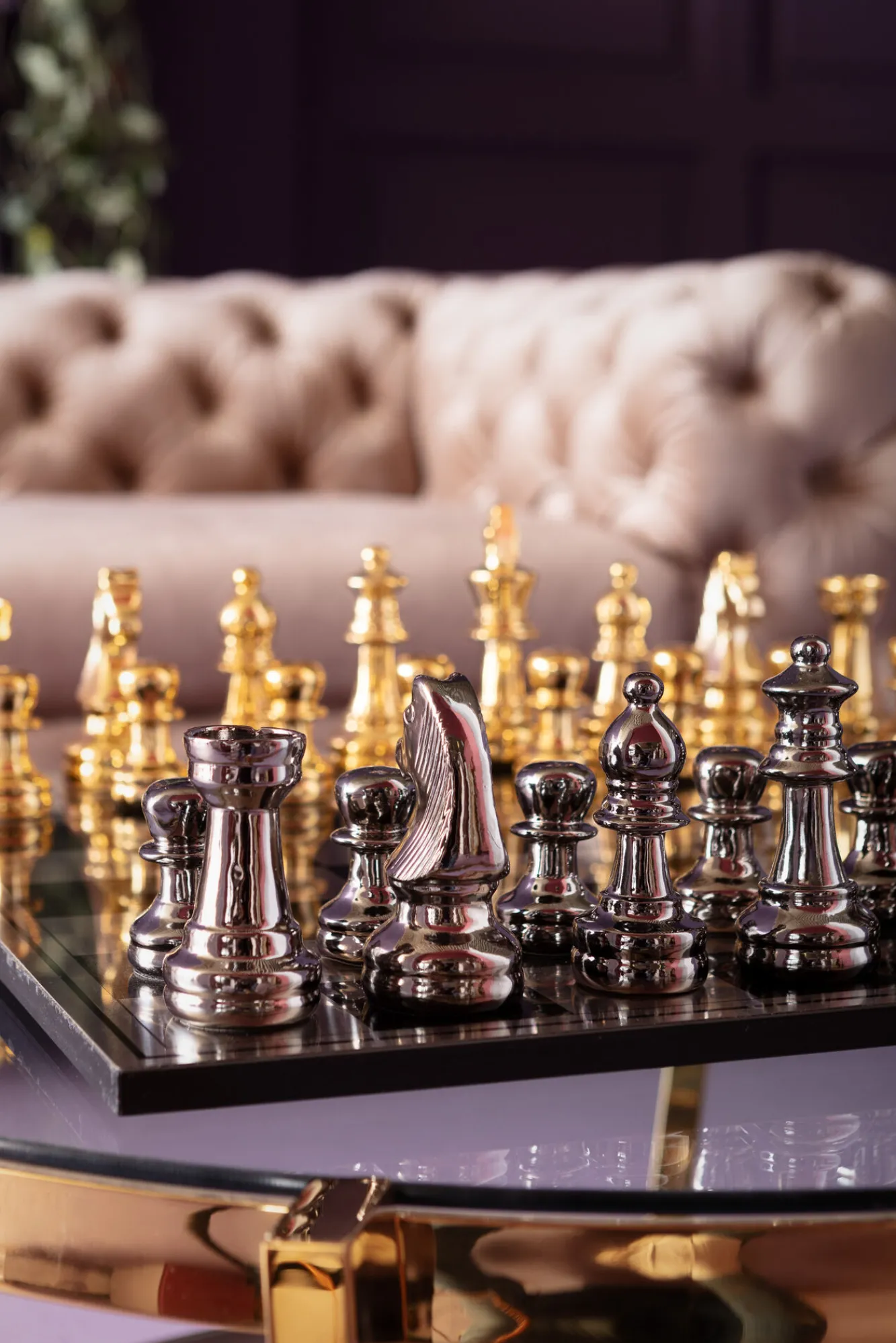 Dekoracja Chess 60×60 cm Figury szachowe mają wysokość od 7 cm (pionek) do 14 cm (król).Szachownica: stal nierdzewna…