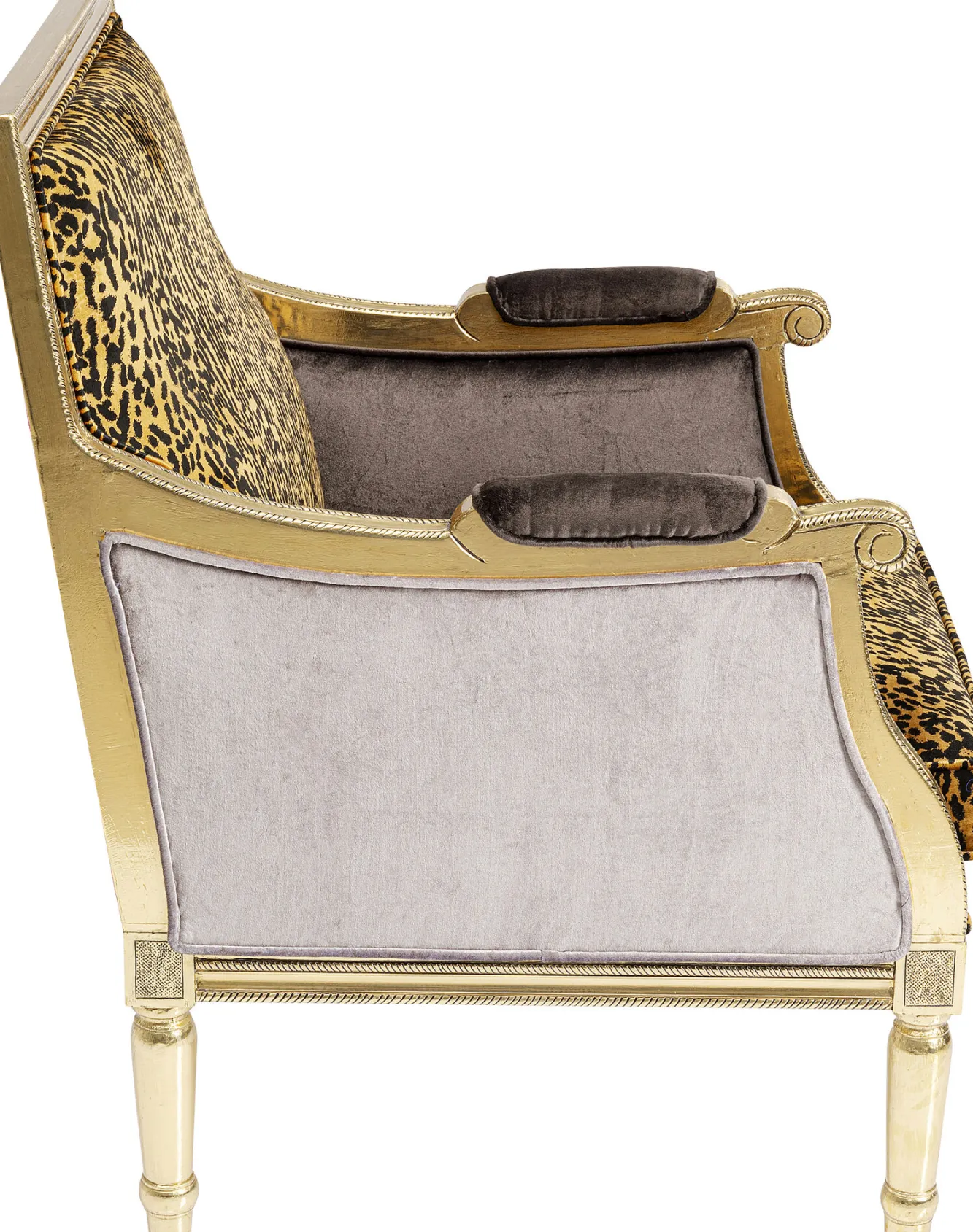 Fotel glamour do salonu panterka rama złota 70×98 cm Konstrukcja: drewno mango lakierowane, stal mosiężna, taśmy tap…
