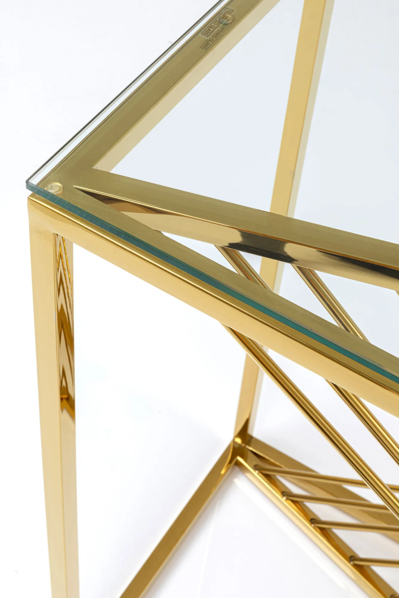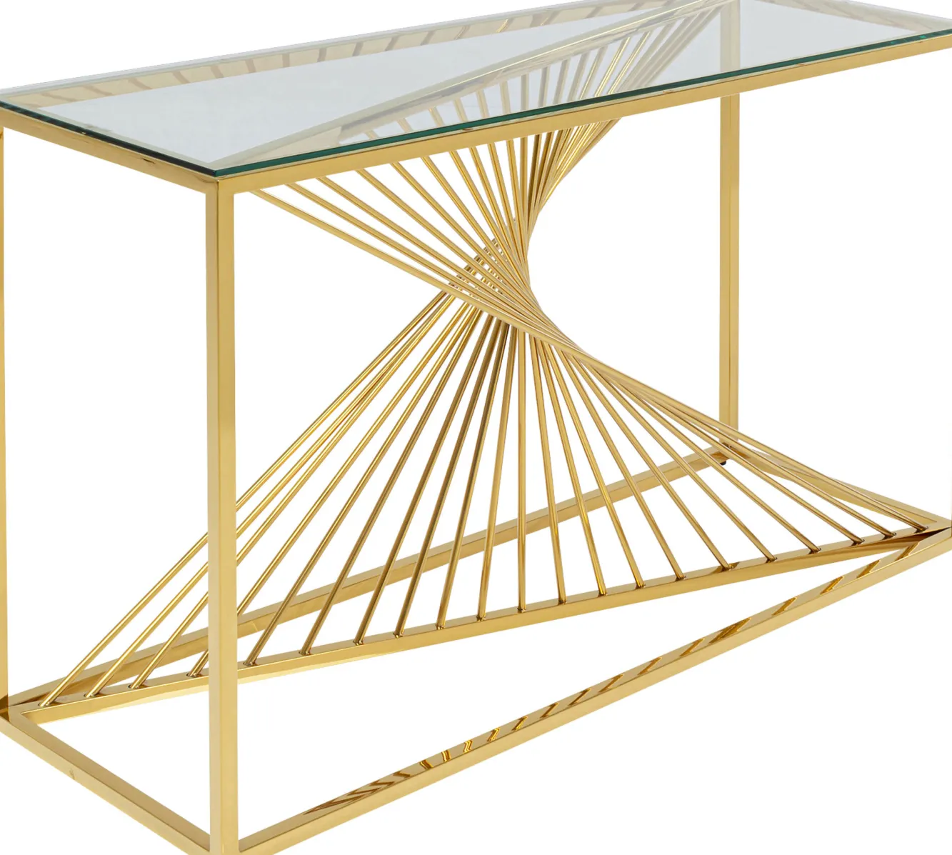 Konsola Laser 120×40 cm złota Rama: stal nierdzewna, polerowanaBlat: szkła hartowaneGrubość blatu: 8 mmMax. obciąż…