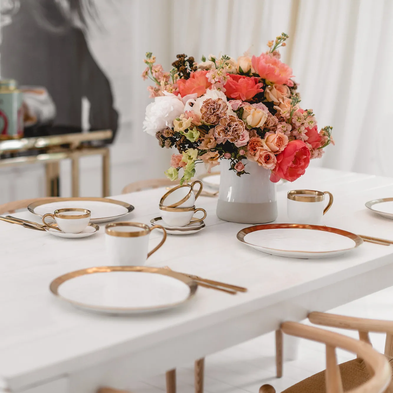 Bell to seria elementów zastawy stołowej, która z pewnością zwróci uwagę miłośników eleganckiej estetyki. Wchodzące w skład tej kolekcji akcesoria jadalniane to przede wszystkim miski, kubki, filiżanki z podstawkami i talerze, wśród których można znaleźć zarówno talerze deserowe, jak i te przeznaczone do serwowania owoców i ciast. Zastosowanie biało – złotej kolorystyki w połączeniu z jednolitym motywem wzorniczym i lekko falistymi brzegami sprawia, że tego typu zastawa może być z powodzeniem użytkowana na co dzień, jak i dopełniać wystroju stołu jadalnianego podczas bardziej uroczystych okazji.