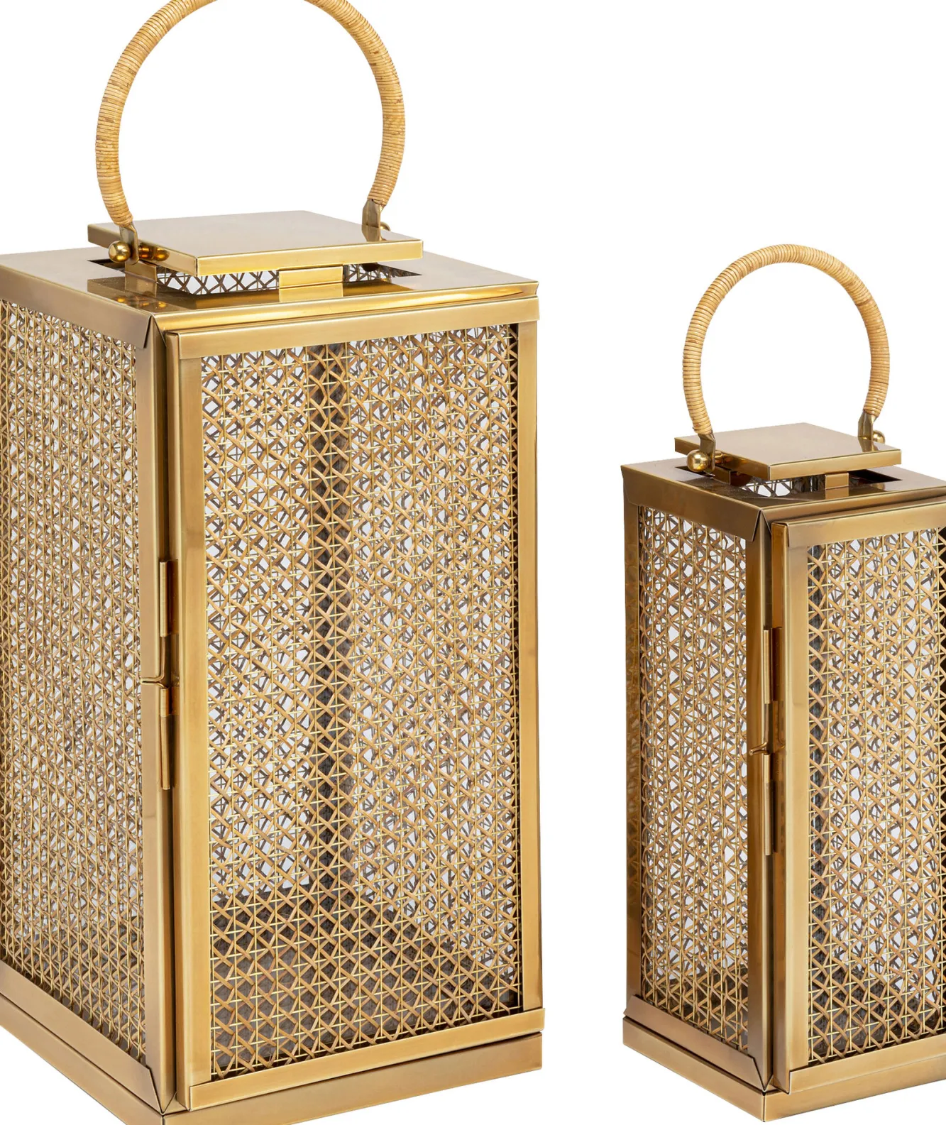 Zestaw 2 dużych latarenek złotych ze stali nierdzewnej i trawy morskiej
