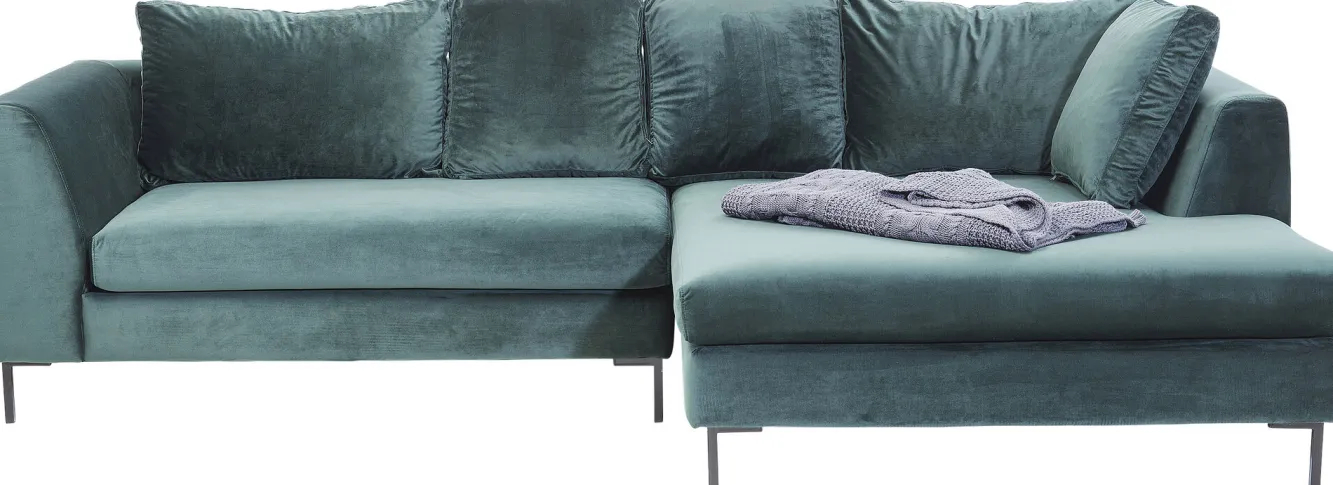 Nowoczesne tapicerowane narożniki prawostronne Gianna w stylu glamour oferują szeroki wybór kolorystyczny – tutaj zielony narożnik tapicerowany o prawostronnej orientacji.