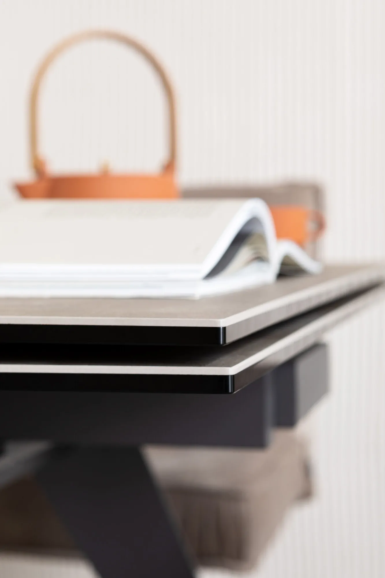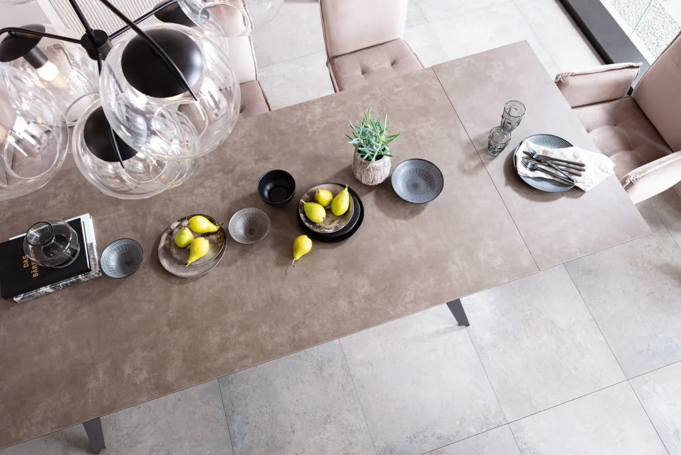 Nowoczesne prostokątne stoły rozkładane Amsterdam oferują kilka wariantów kolorystycznych – tutaj stalowy szary stół ze szklanym blatem rozkładany.