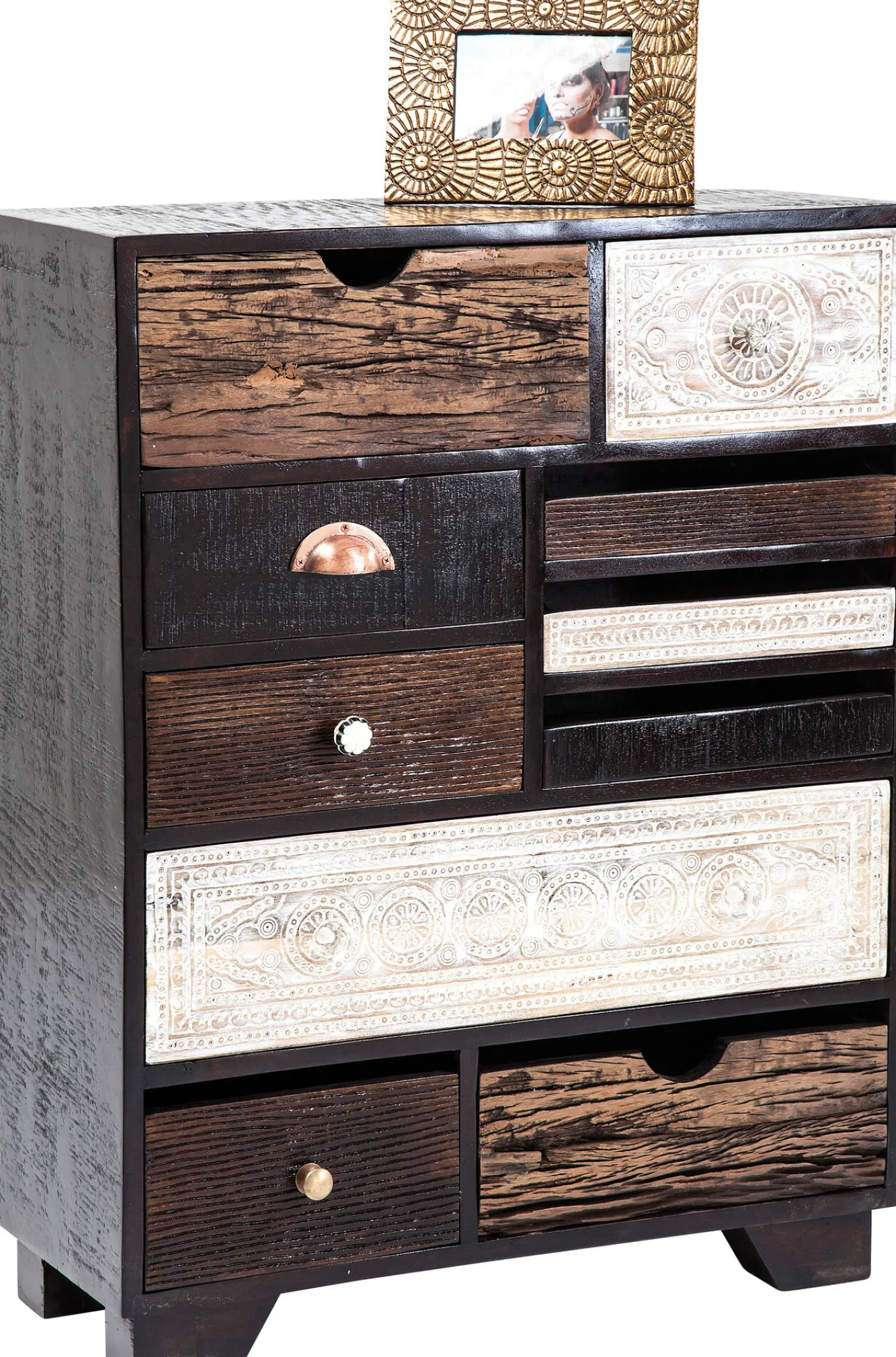 Ciemnobrązowa komoda drewniana w stylu industrialnym Finca jest jednocześnie nowoczesna i romantyczna. Do naszej oferty wkracza za pośrednictwem wizjonerskiej firmy KARE, słynącej z niepodrabialnego designu. Niemiecka marka powołuje się na rozmaite inspiracje, nie lubi się powtarzać i mówi stanowcze NIE bylejakości oraz przeciętności. W tym przypadku producent odsłania przed Wami mebel, który spełni Wasze zarówno estetyczne, jak i praktyczne wymogi i pozwoli na nowo tchnąć życie w Wasz wystrój wnętrza. Prezentowana komoda ciemnobrązowa charakteryzuje się dekoracyjnymi frontami inspirowanymi wschodnią ornamentyką. Finezyjne, niebanalne wzornictwo idzie tutaj w parze z wysoką funkcjonalnością. Unikatowa oraz pełna harmonii komoda drewniana odpowiada licznym współczesnym rozwiązaniom we wnętrzarstwie.