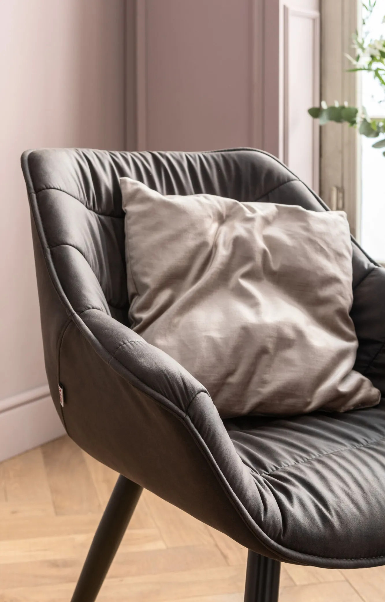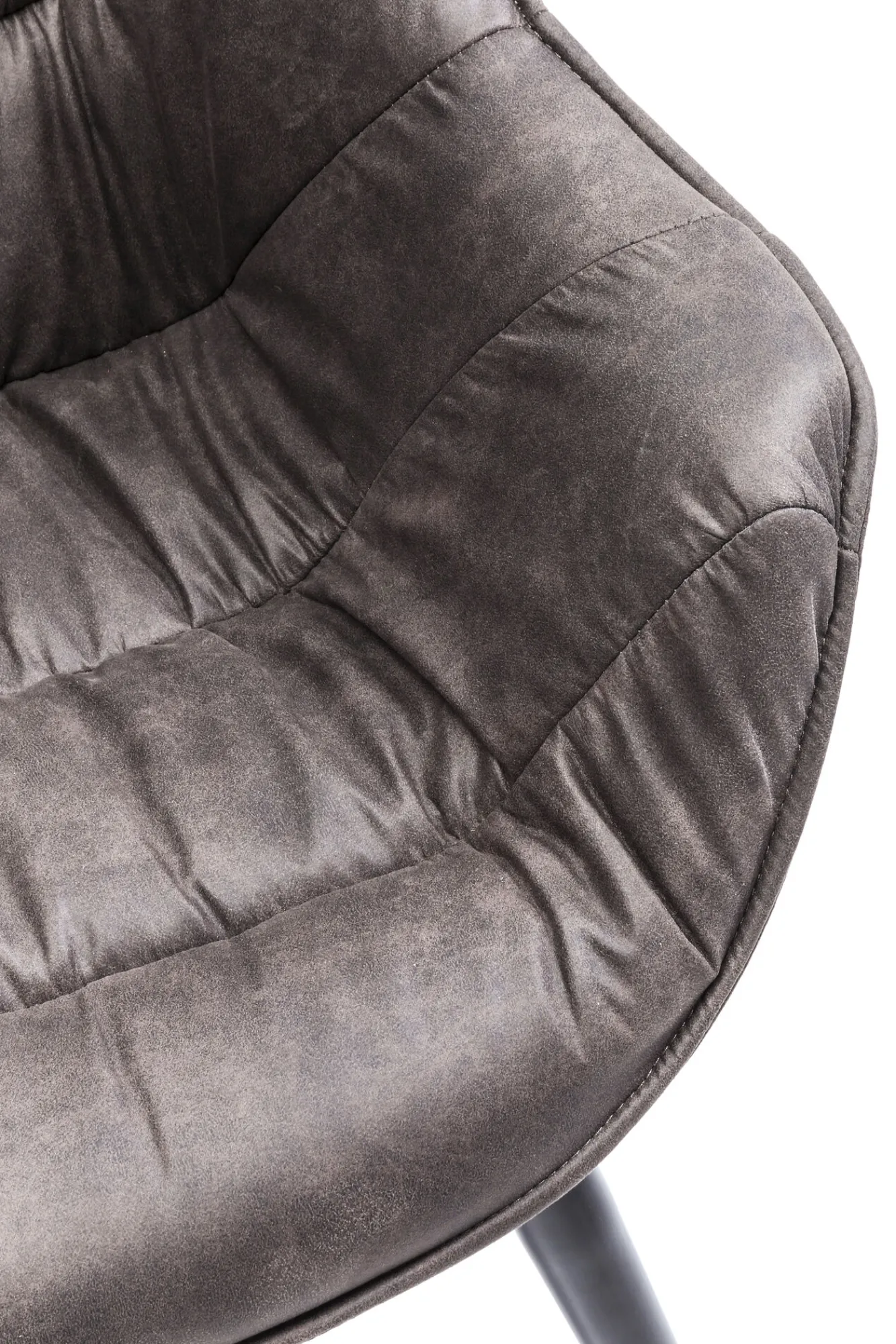 Przyciągająca wzrok siedzisko tapicerowane szarą ekoskórą i charakterystyczne podłokietniki oraz metalowe, czarne nogi ożywią każde wnętrze.