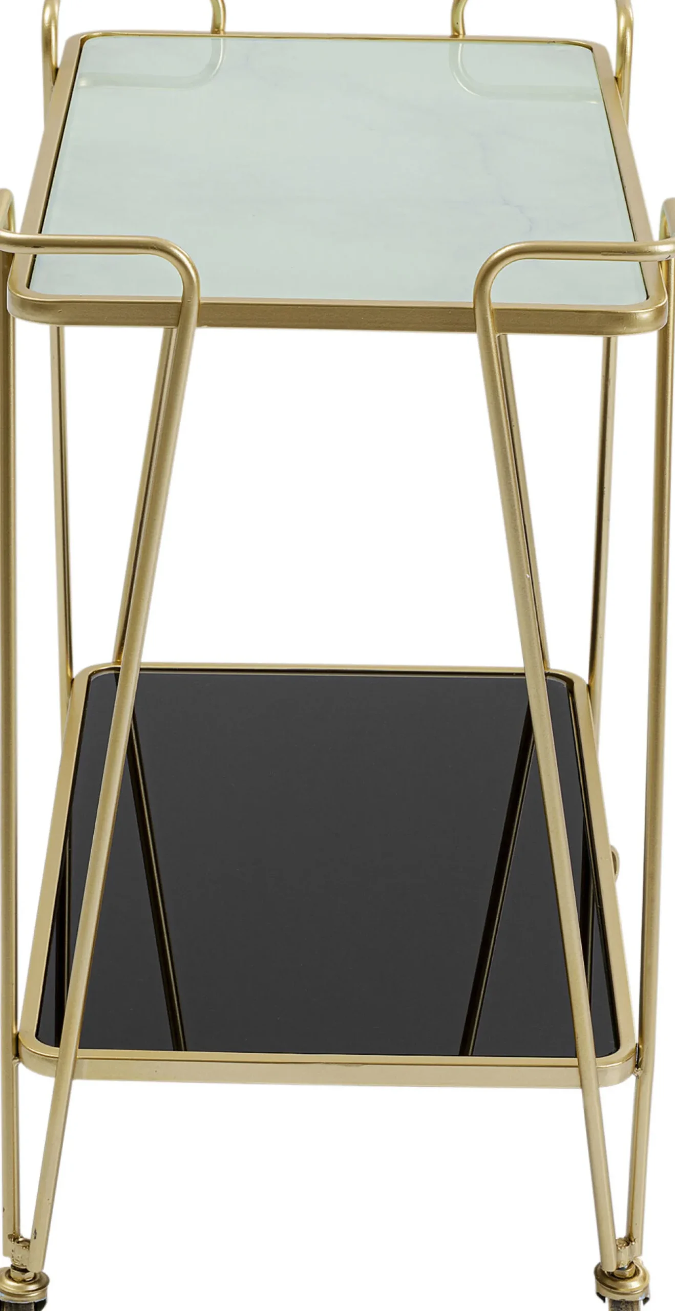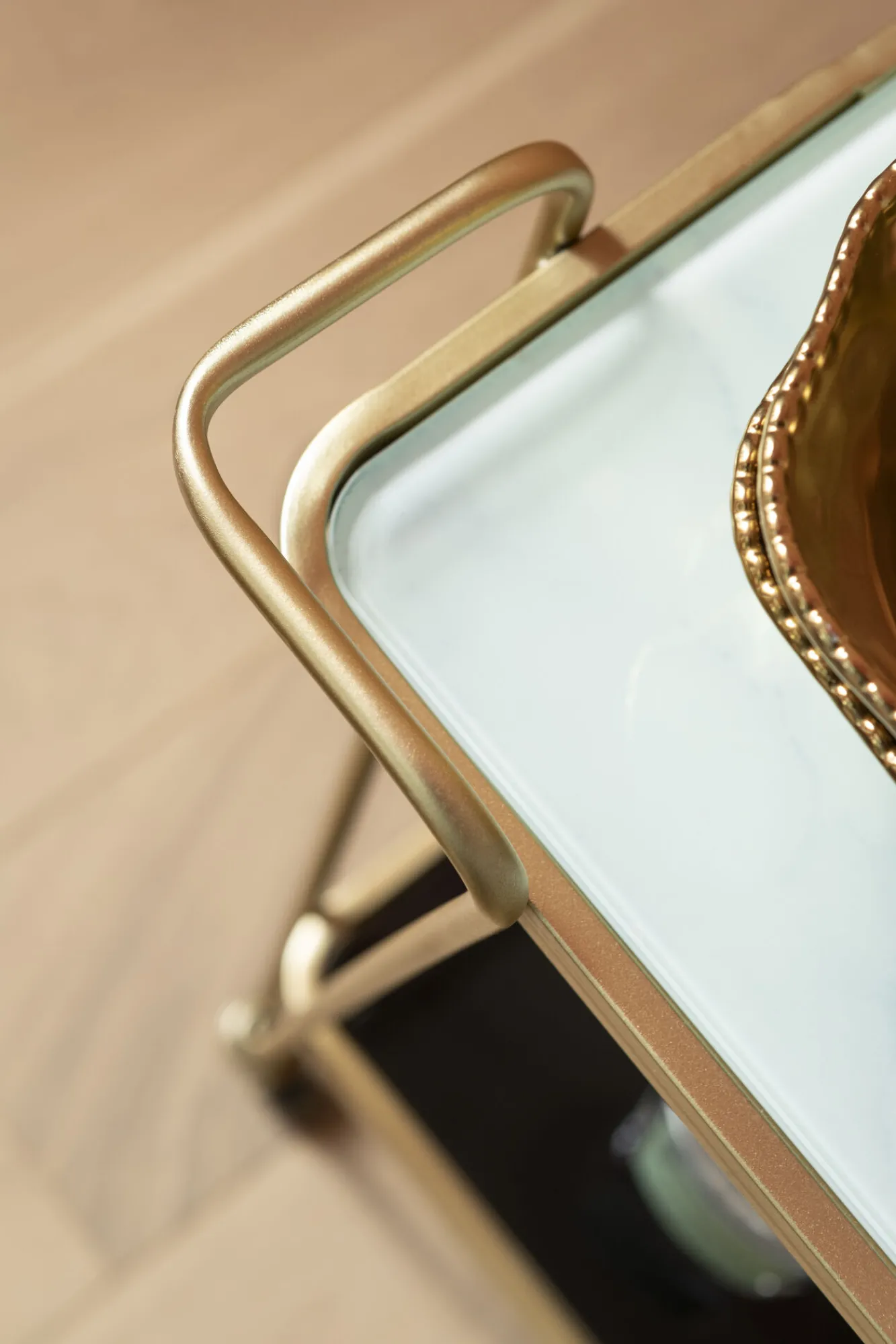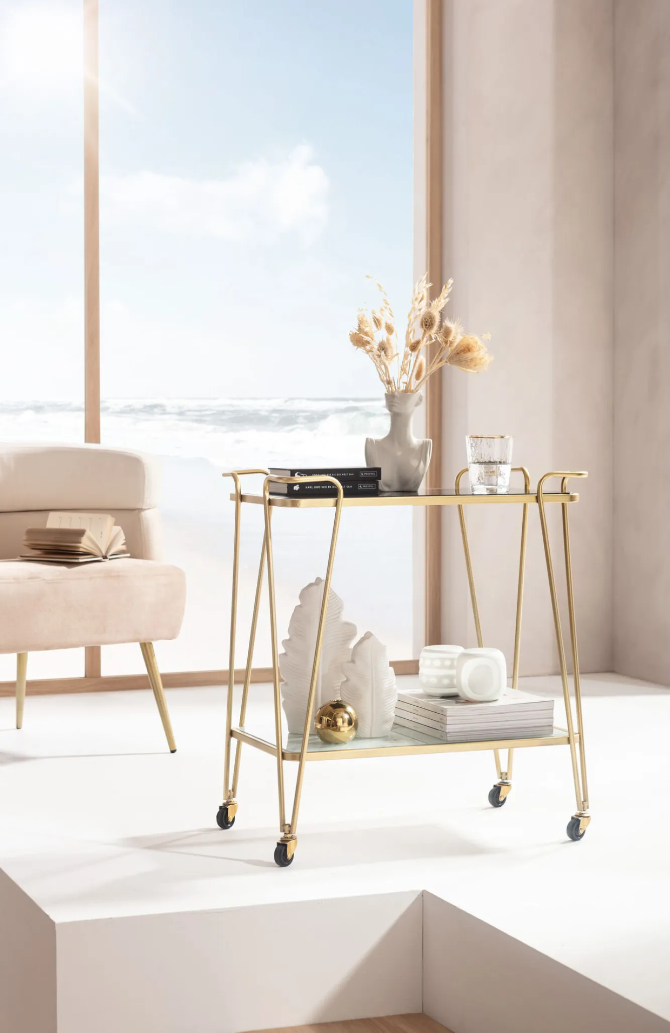 Jeśli zaliczacie się do fanów wyrafinowanego wzornictwa o luksusowym charakterze, ten nowoczesny złoty barek w stylu glamour ma spore szanse przyciągnąć Waszą uwagę. Za jego projektem skrywa się, znana z ekskluzywnego designu, wiodąca firma KARE. Wizjonerska niemiecka marka już od przeszło trzech dekad uwodzi swoimi wysmakowanymi wizualnie projektami i pozwala spełniać marzenia o pięknym i niebanalnym wystroju wnętrz. Tutaj dostajemy dużą dawkę wytworności przejawiającej się w połyskliwych materiałach użytych do wykonania tego modelu: stali w złotym wykończeniu oraz szkła. Prezentowany barek złoty łączy w sobie zjawiskową estetykę z wysokimi standardami funkcjonalnymi – wyposażony został w kółka umożliwiające łatwe przemieszczanie, dodatkową półkę, a rogi górnego blatu zabezpieczono podniesionymi krawędziami, żeby uchronić odkładane tam naczynia czy trunki przed łatwym upadkiem. Z takim zapleczem jak ten barek na kółkach nie musicie obawiać się o swoją pozycję gospodarza wystawnych przyjęć.