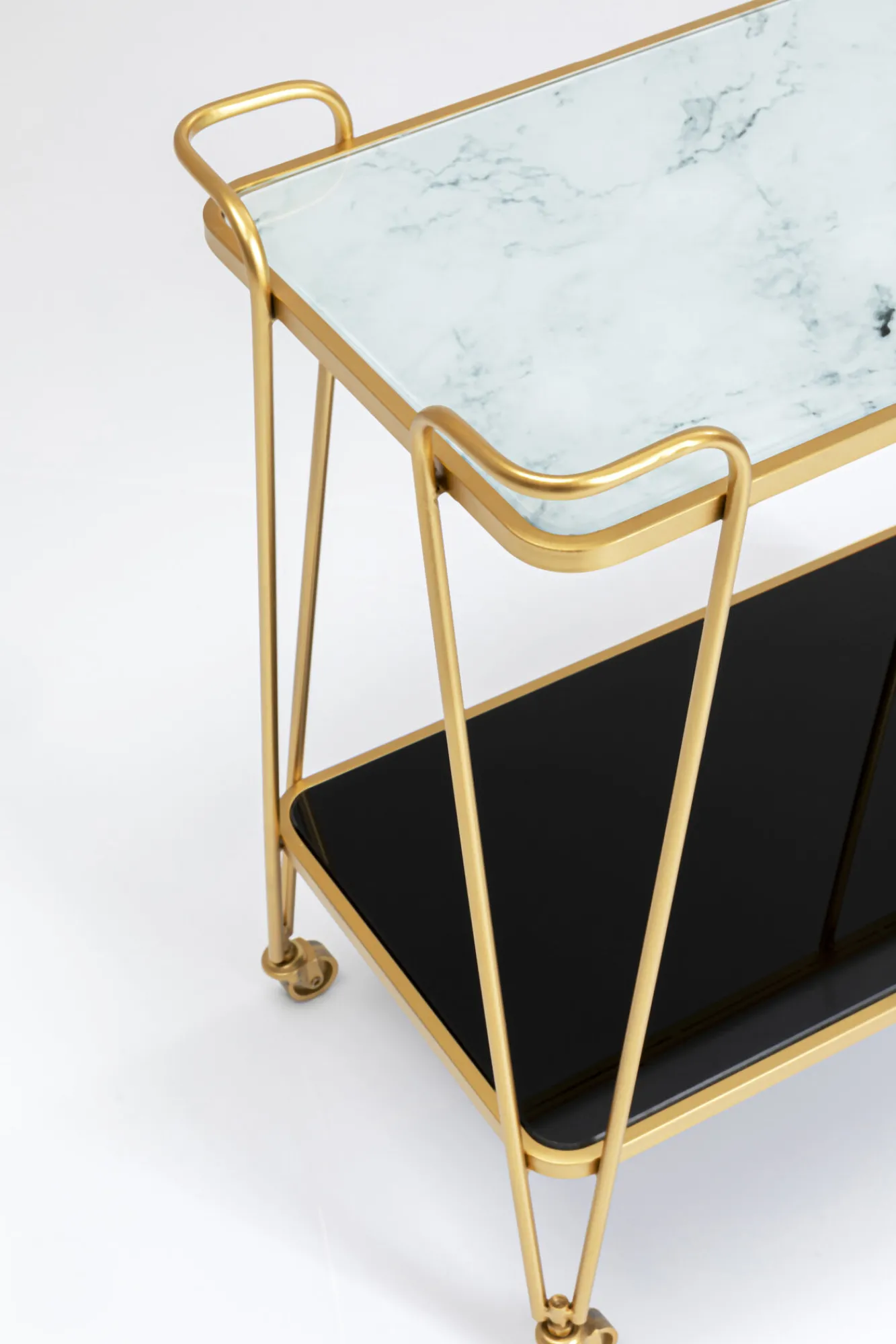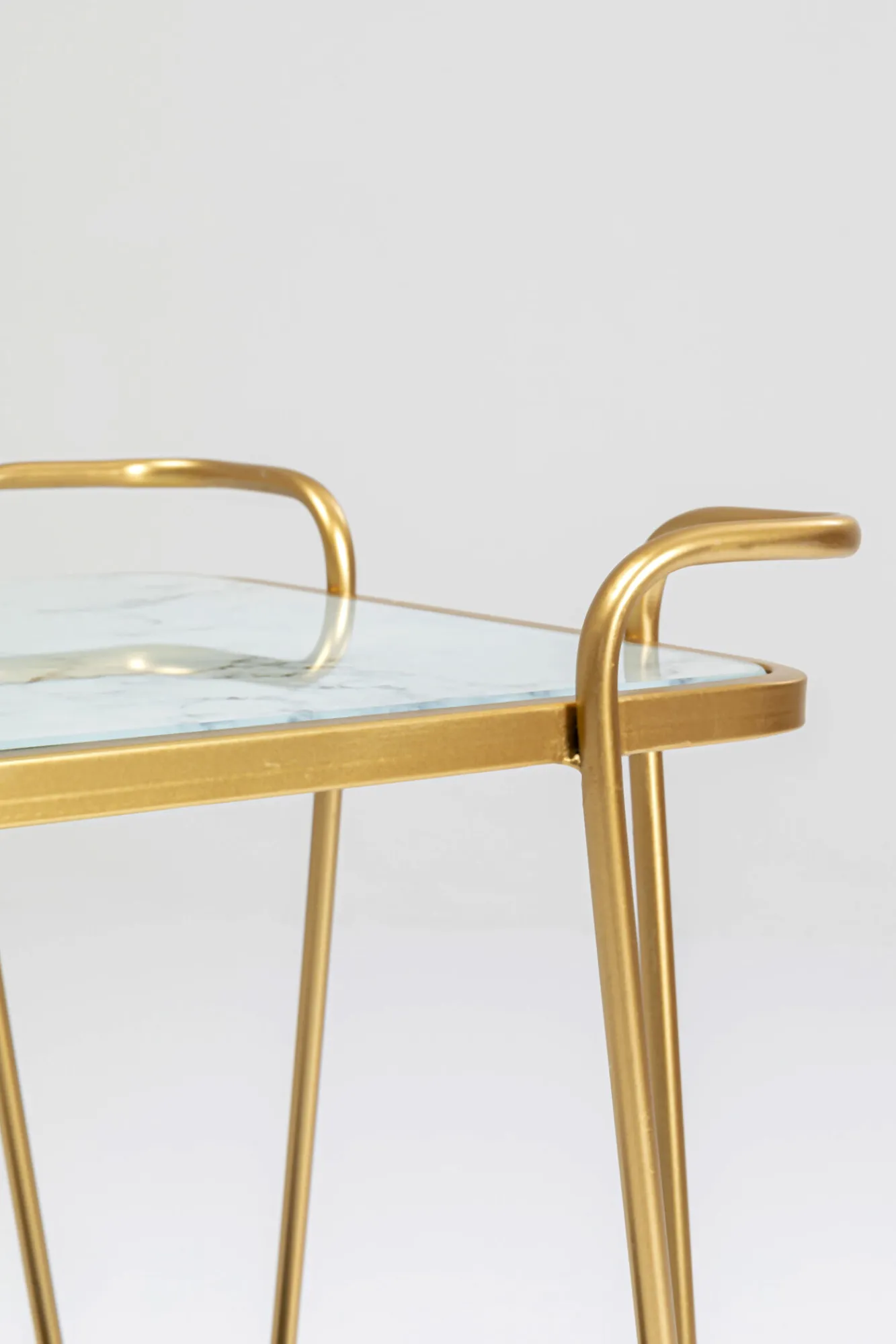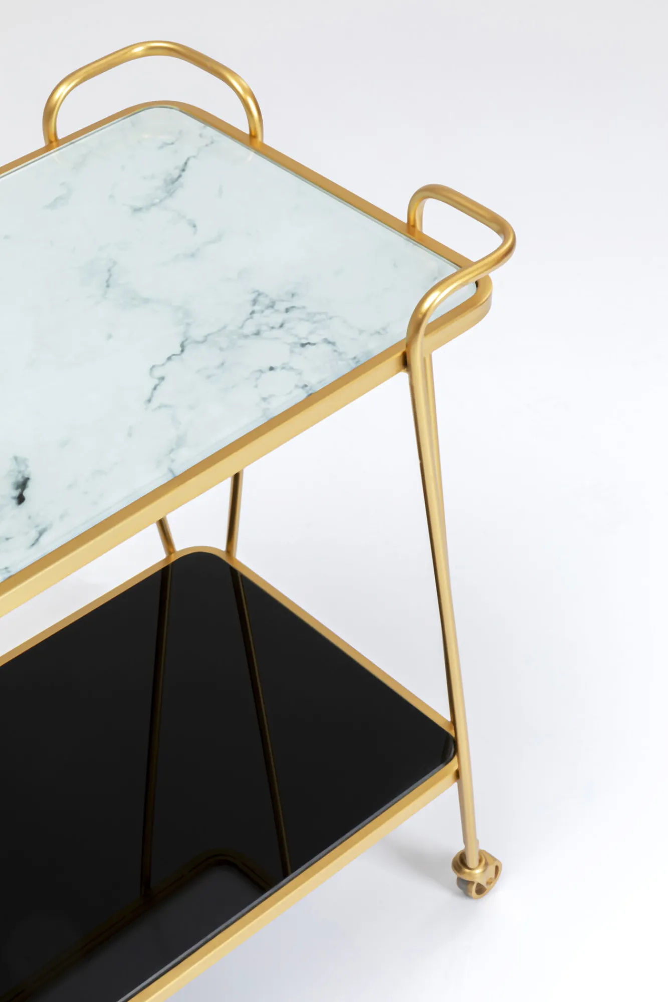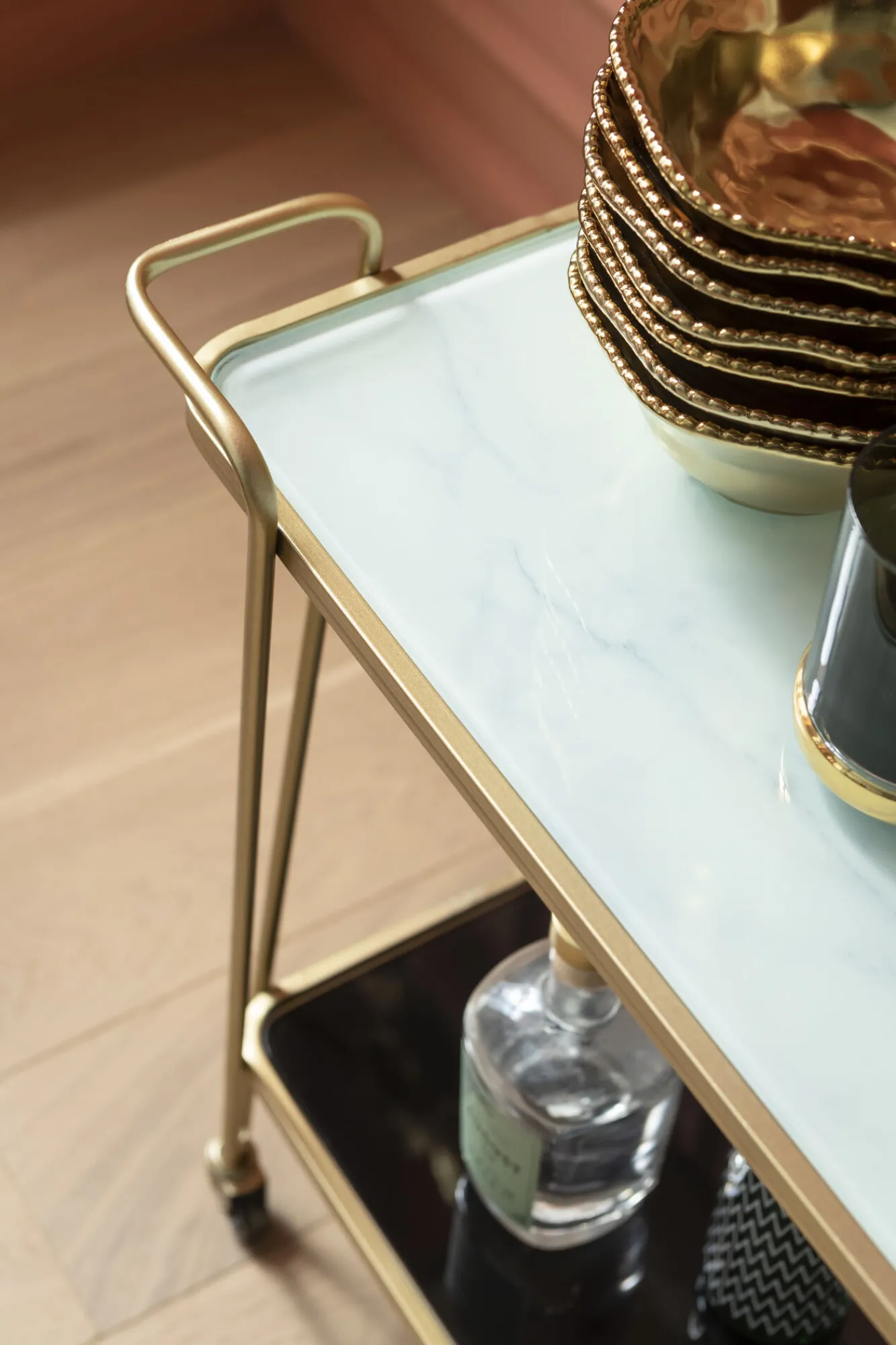 Jeśli zaliczacie się do fanów wyrafinowanego wzornictwa o luksusowym charakterze, ten nowoczesny złoty barek w stylu glamour ma spore szanse przyciągnąć Waszą uwagę. Za jego projektem skrywa się, znana z ekskluzywnego designu, wiodąca firma KARE. Wizjonerska niemiecka marka już od przeszło trzech dekad uwodzi swoimi wysmakowanymi wizualnie projektami i pozwala spełniać marzenia o pięknym i niebanalnym wystroju wnętrz. Tutaj dostajemy dużą dawkę wytworności przejawiającej się w połyskliwych materiałach użytych do wykonania tego modelu: stali w złotym wykończeniu oraz szkła. Prezentowany barek złoty łączy w sobie zjawiskową estetykę z wysokimi standardami funkcjonalnymi – wyposażony został w kółka umożliwiające łatwe przemieszczanie, dodatkową półkę, a rogi górnego blatu zabezpieczono podniesionymi krawędziami, żeby uchronić odkładane tam naczynia czy trunki przed łatwym upadkiem. Z takim zapleczem jak ten barek na kółkach nie musicie obawiać się o swoją pozycję gospodarza wystawnych przyjęć.