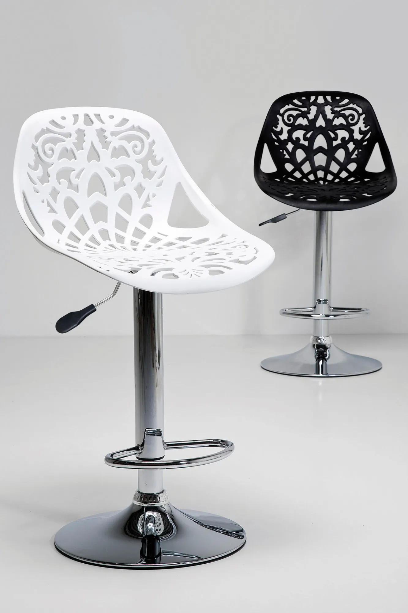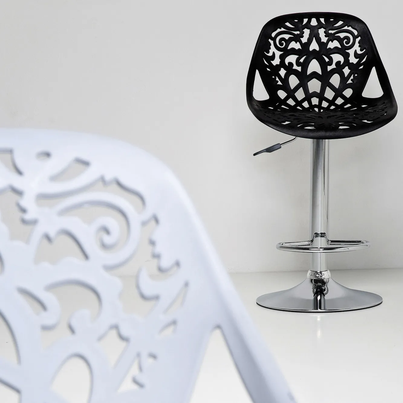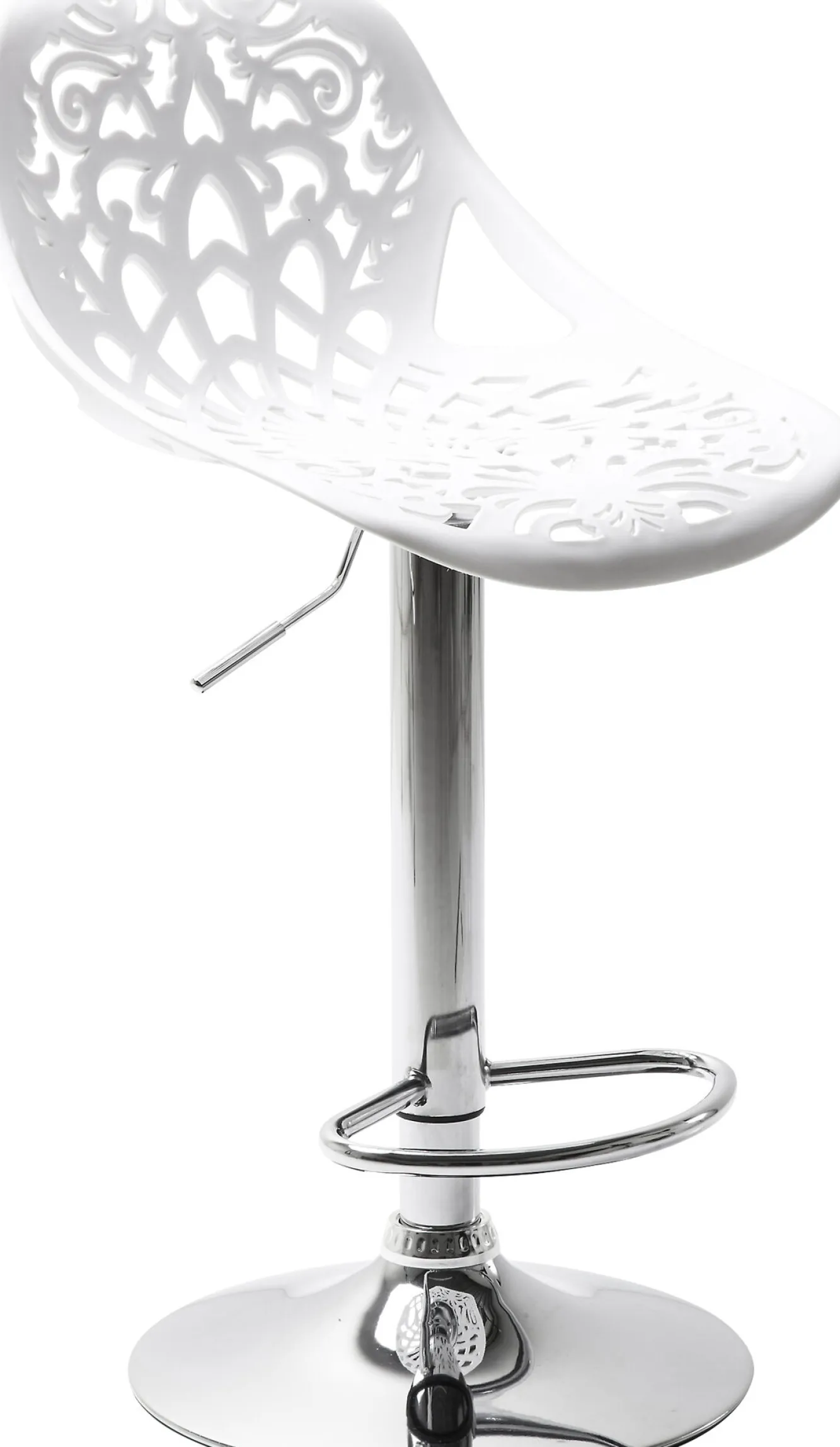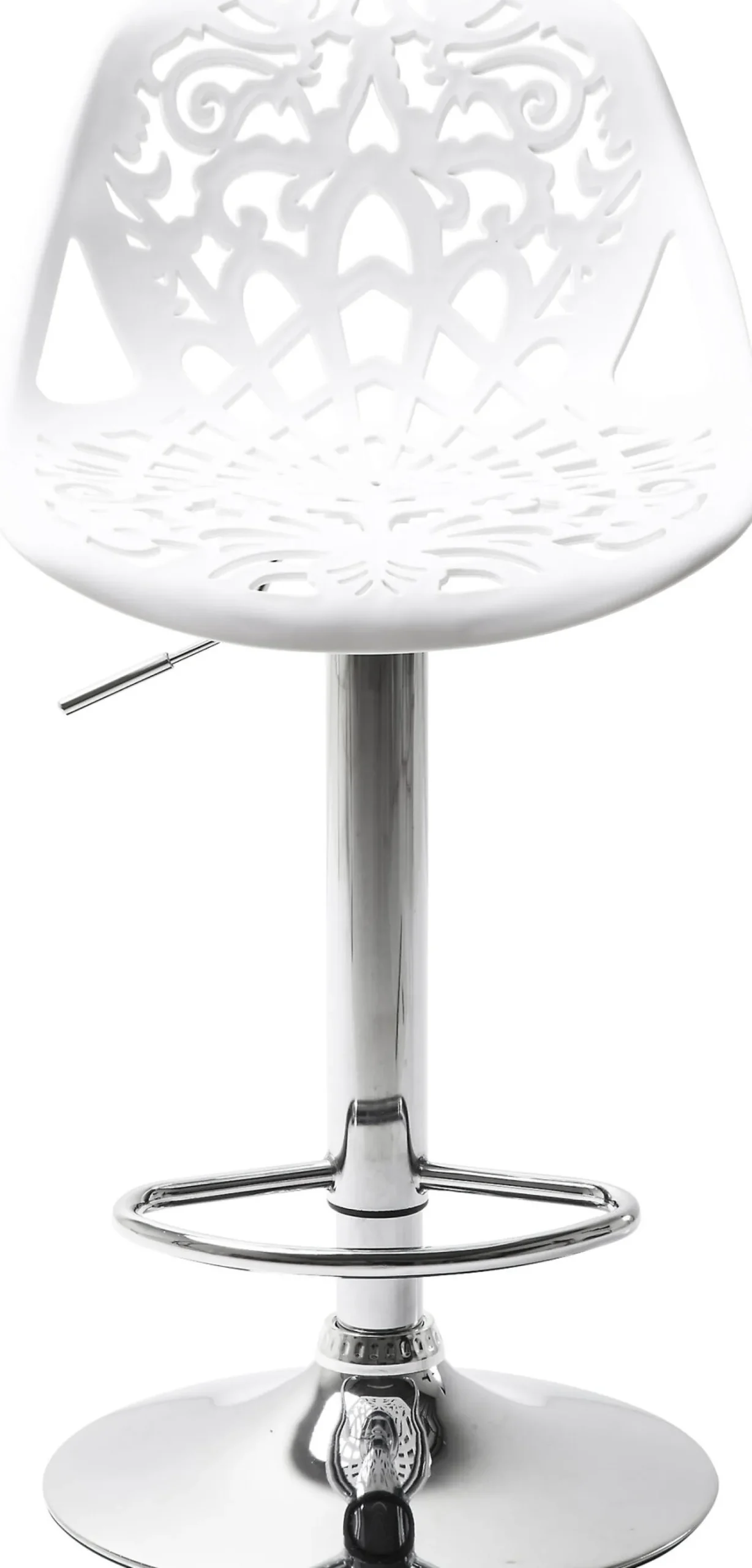 Hoker ornament, marki Kare design, to kwintesencja stylu i elegancji. Białe siedzisko wykonane jest z wytrzymałego tworzywa sztucznego a subtelne ażury nadają mu wyjątkowej lekkości. Podtrzymuje je pojedyncza stalowa noga z chromową powłoką.
