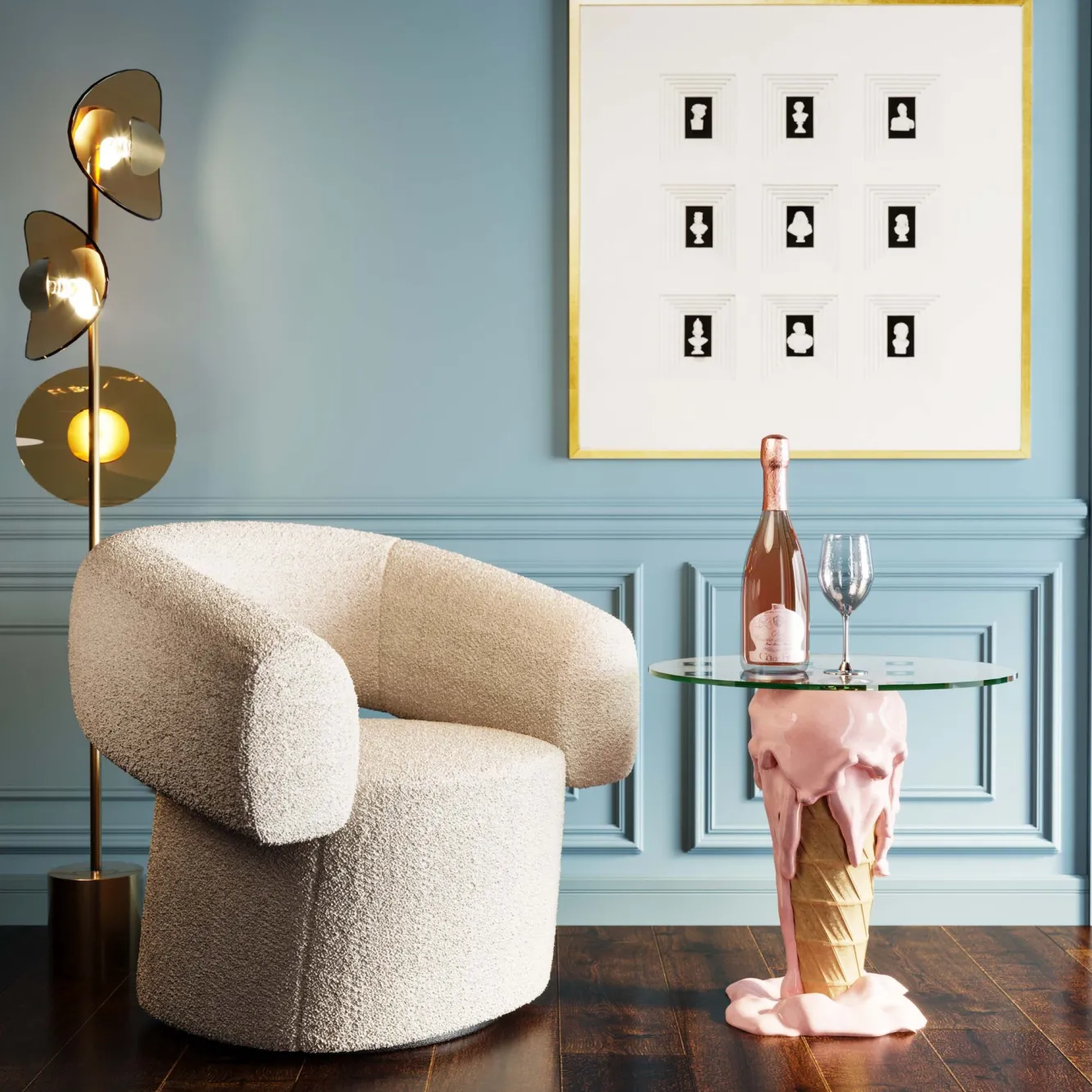 Stolik pomocniczy w kształcie loda blat szklany Ø48 cm Blat: szkło bezpieczne, hartowane 8 mm.Podstawa: polirezyna.
