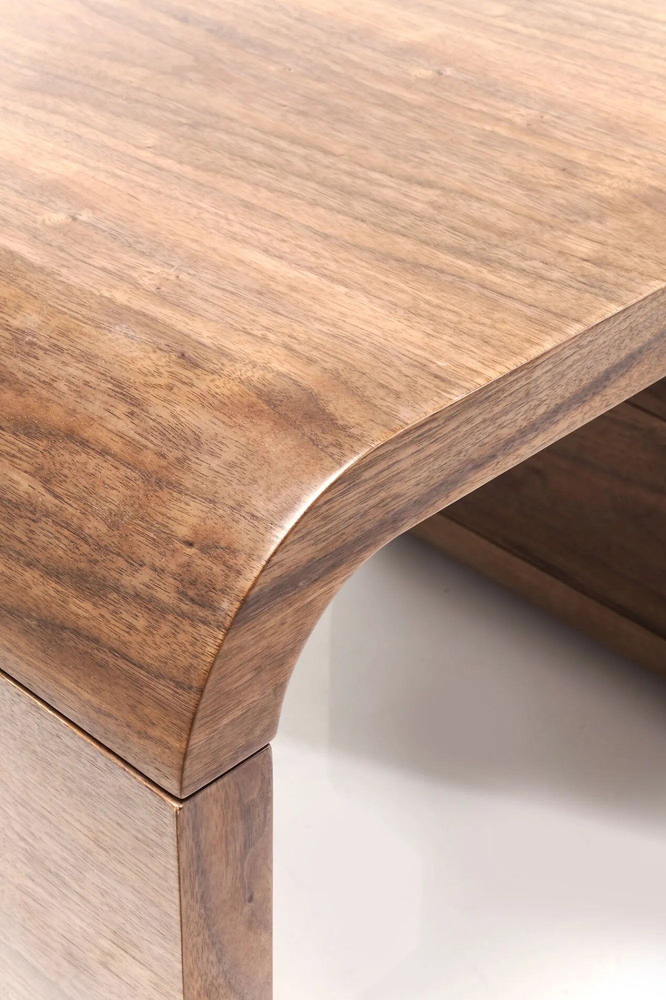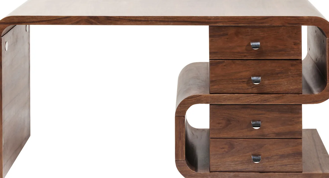 To klasyczne drewniane biurko w stylu vintage sygnowane jest podpisem, skorej do stylistycznych ekstrawagancji, firmy KARE. Wizjonerska niemiecka marka, ikona nowoczesnego designu, znakomicie opanowała trudną sztukę łączenia ekscentryzmu i umiaru. Tutaj łączy szacunek do tradycji ze współczesną funkcjonalnością. Prezentowany model o finezyjnym kształcie wniesie do wnętrza elegancję, harmonię, jak i silnie tchnący nostalgią walor emocjonalny. Ubrany w kolor orzecha włoskiego jawi się szlachetnie i stylowo. Dzięki ponadczasowemu wzornictwu, takie biurko z 4 szufladami doskonale będzie współpracować z rozmaitymi nurtami aranżacyjnymi.