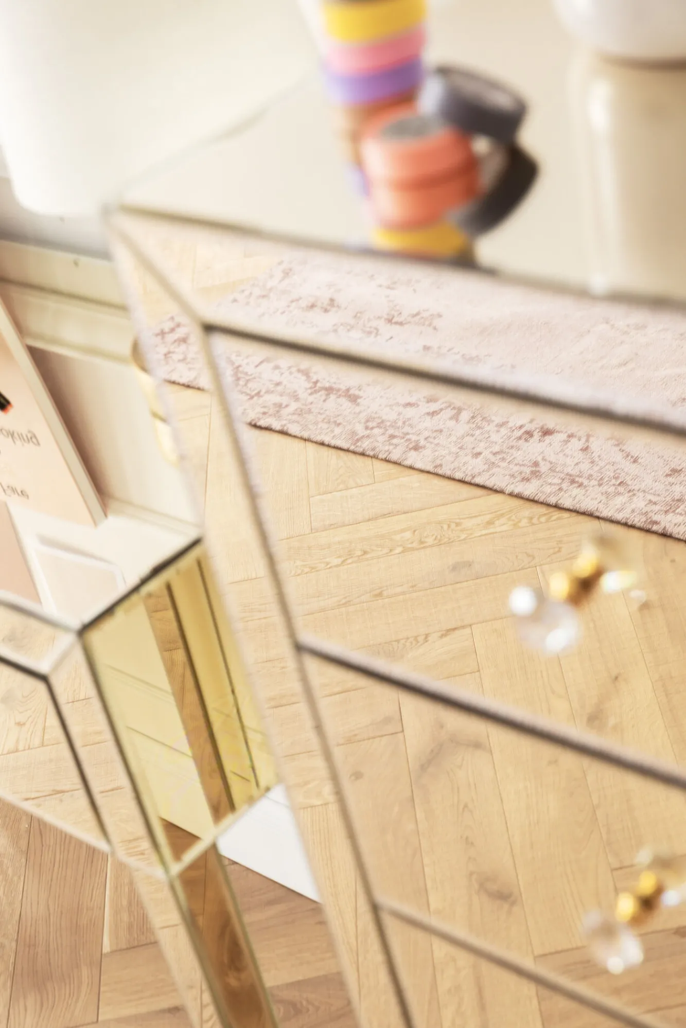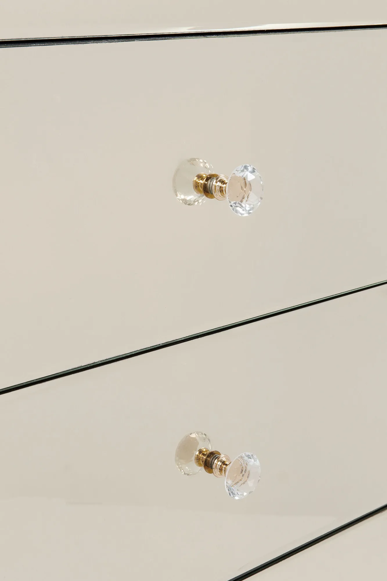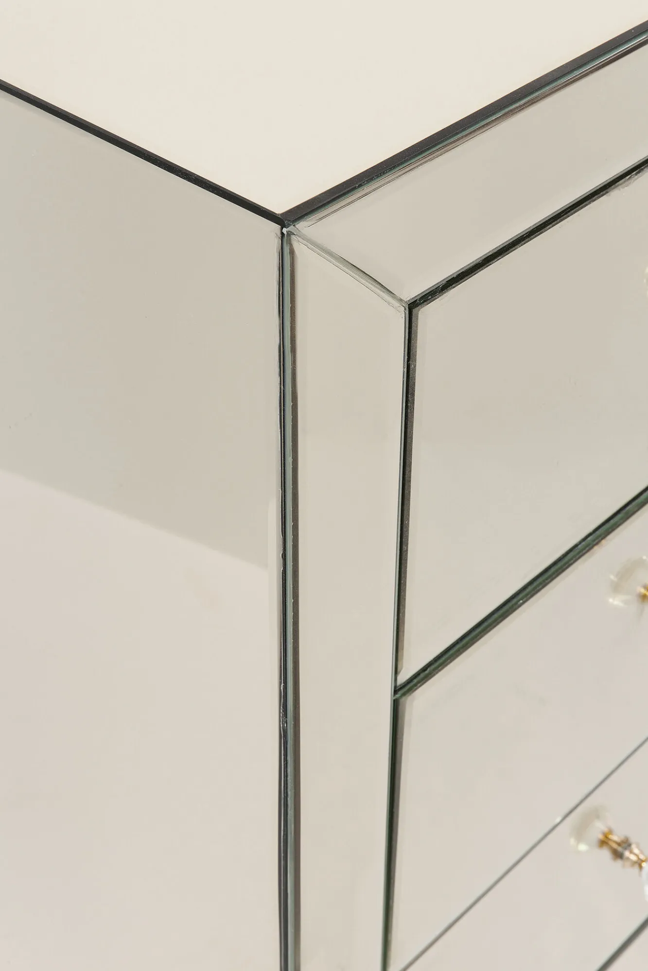 Seria nowoczesnych mebli ze szkła w stylu glamour Luxury Gold oferuje szeroki wybór wyposażenia wnętrz – tutaj lustrzana komoda z 5 szufladami.
