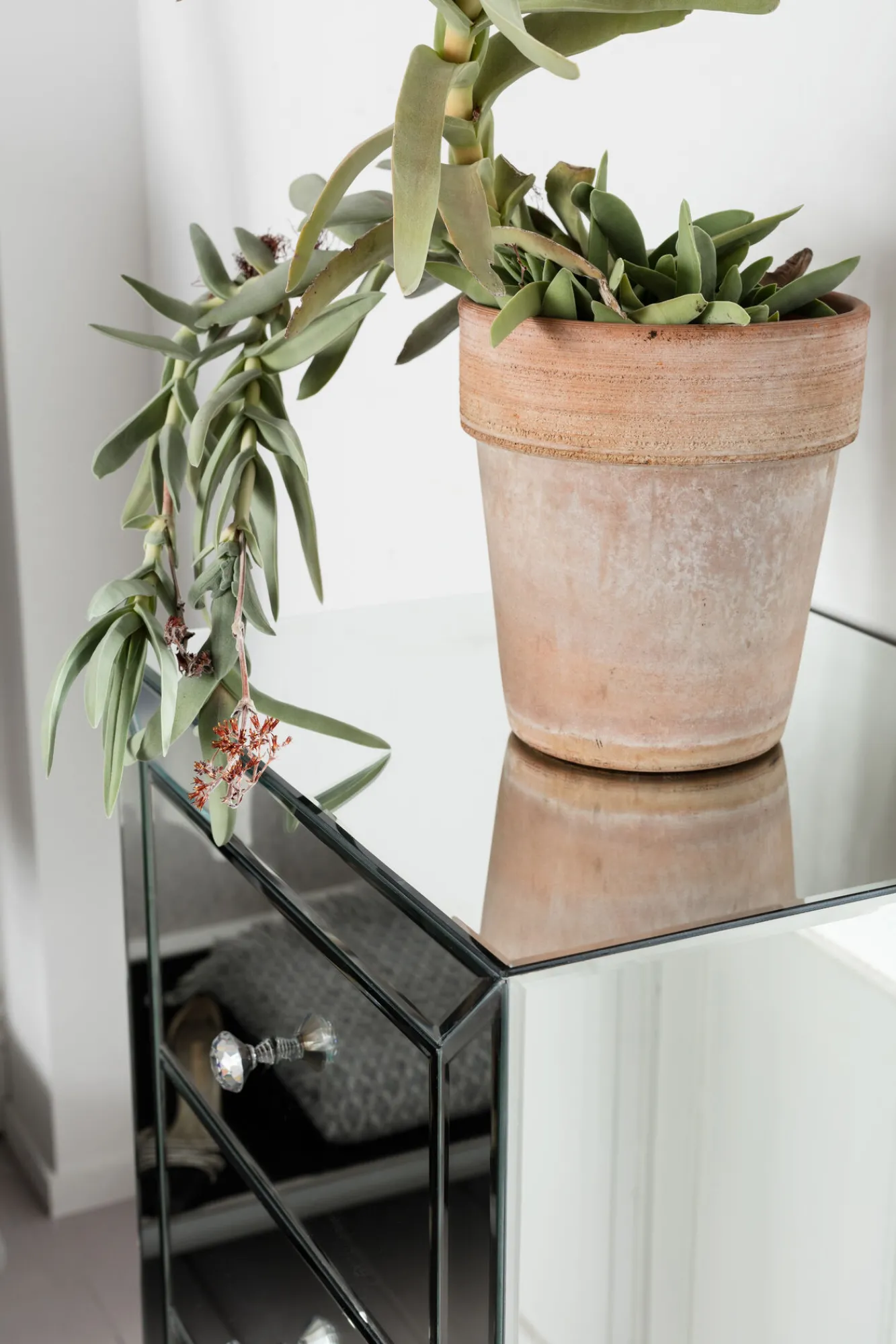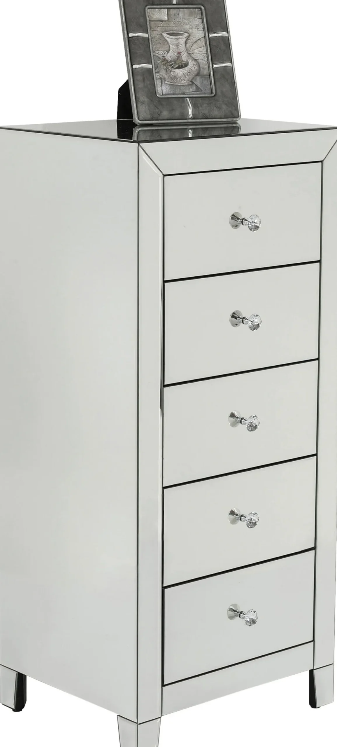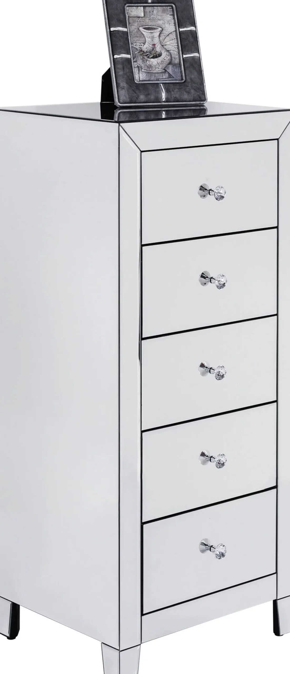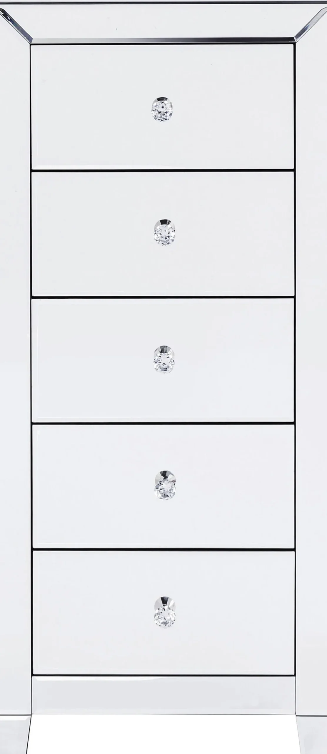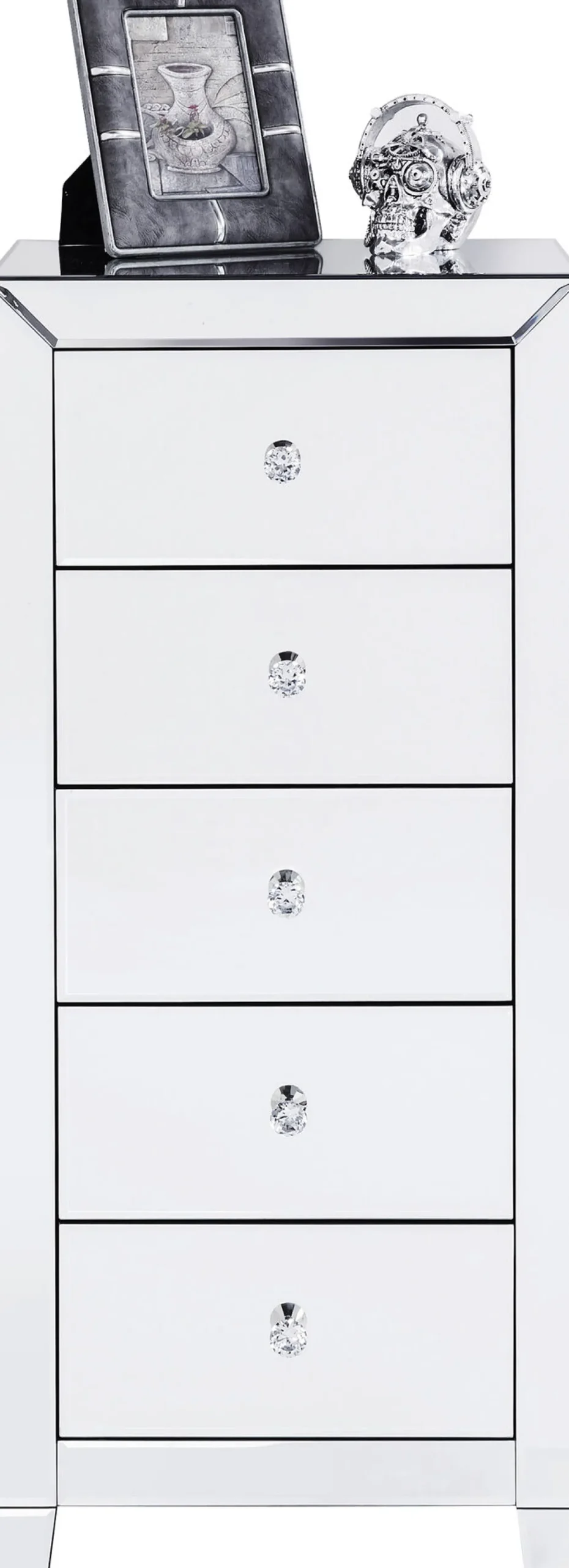 Seria nowoczesnych mebli ze szkła w stylu glamour Luxury oferuje szeroki wybór wyposażenia wnętrz – tutaj lustrzana komoda z 5 szufladami.