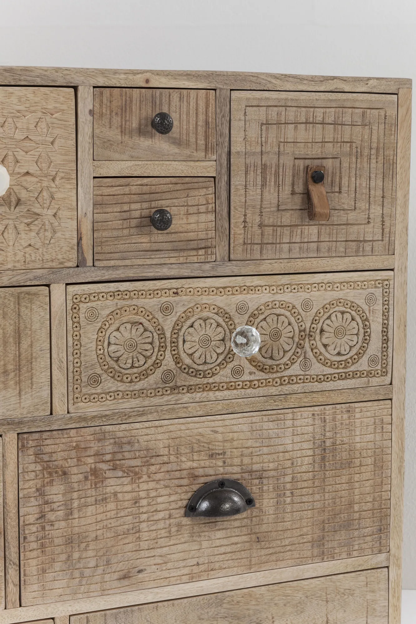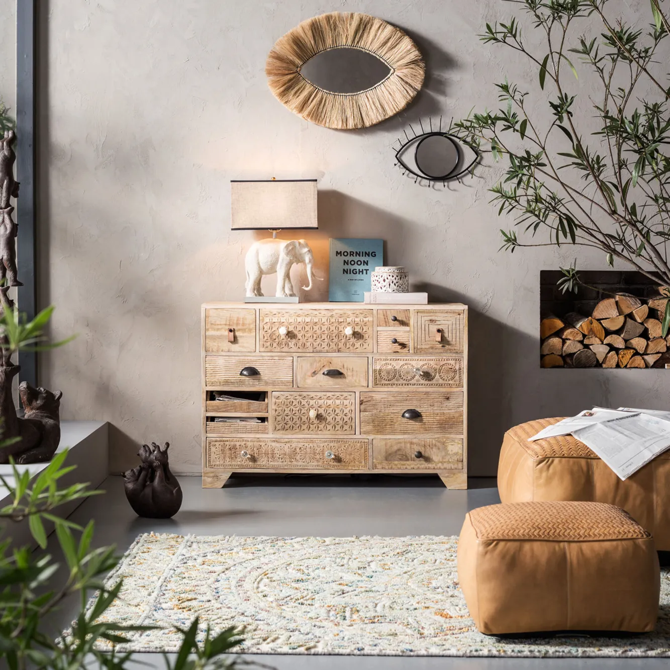 Kolekcja drewnianych mebli w stylu prowansalskim Puro oferuje wybór wielu elementów wyposażenia wnętrz – tutaj komoda drewniana z 14 szufladami.
