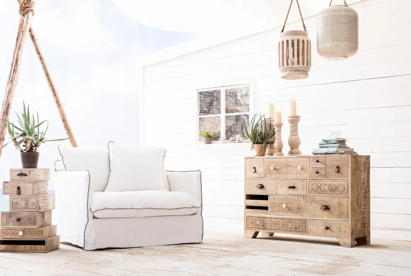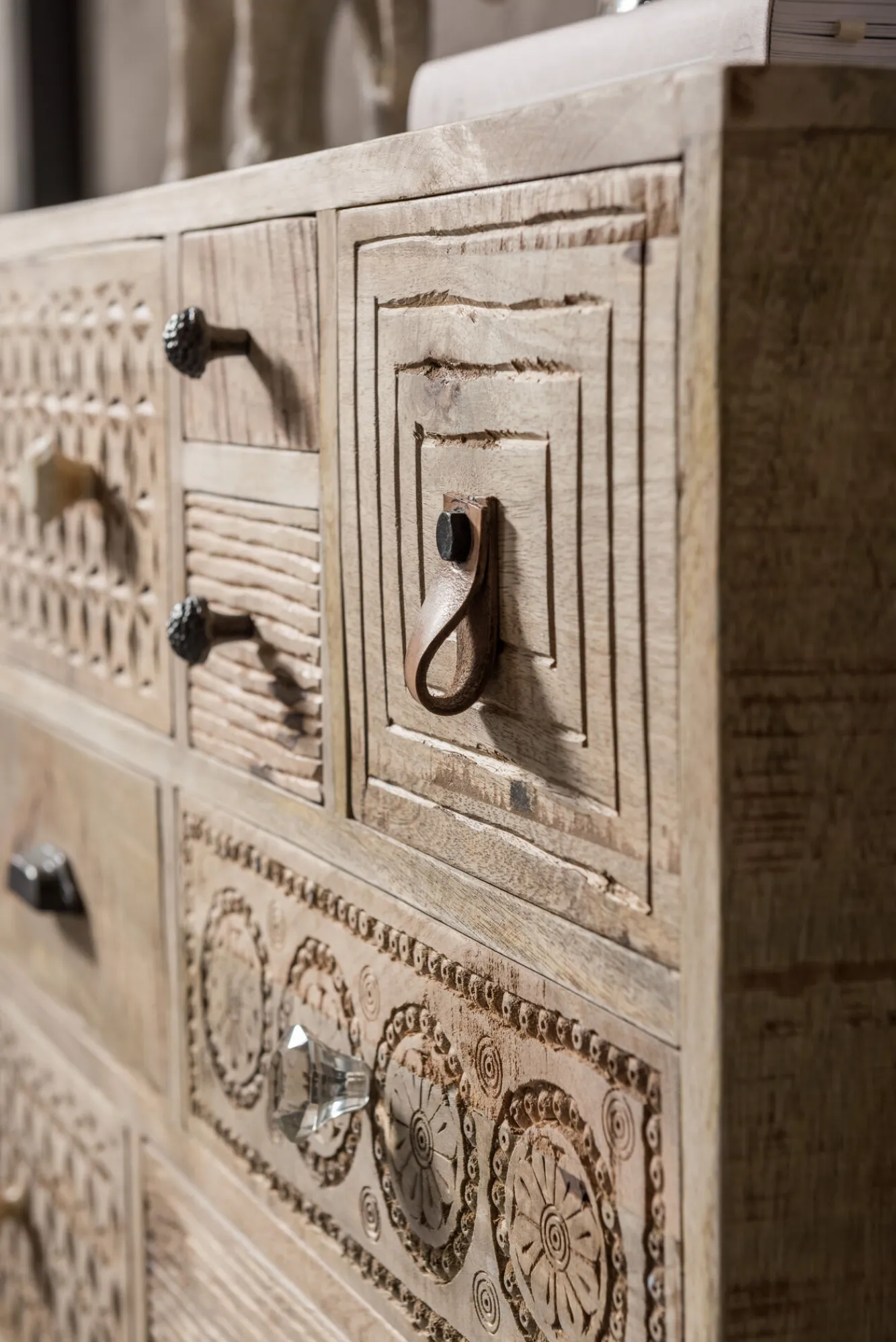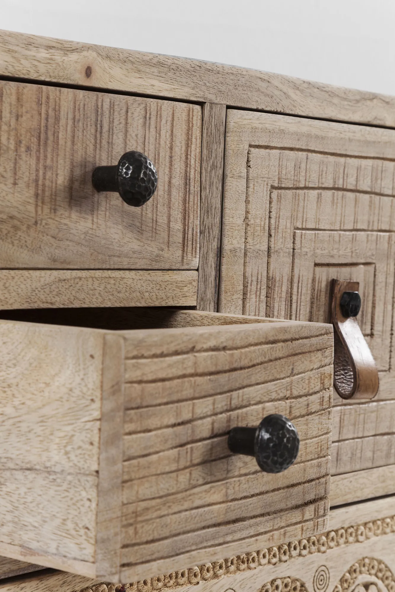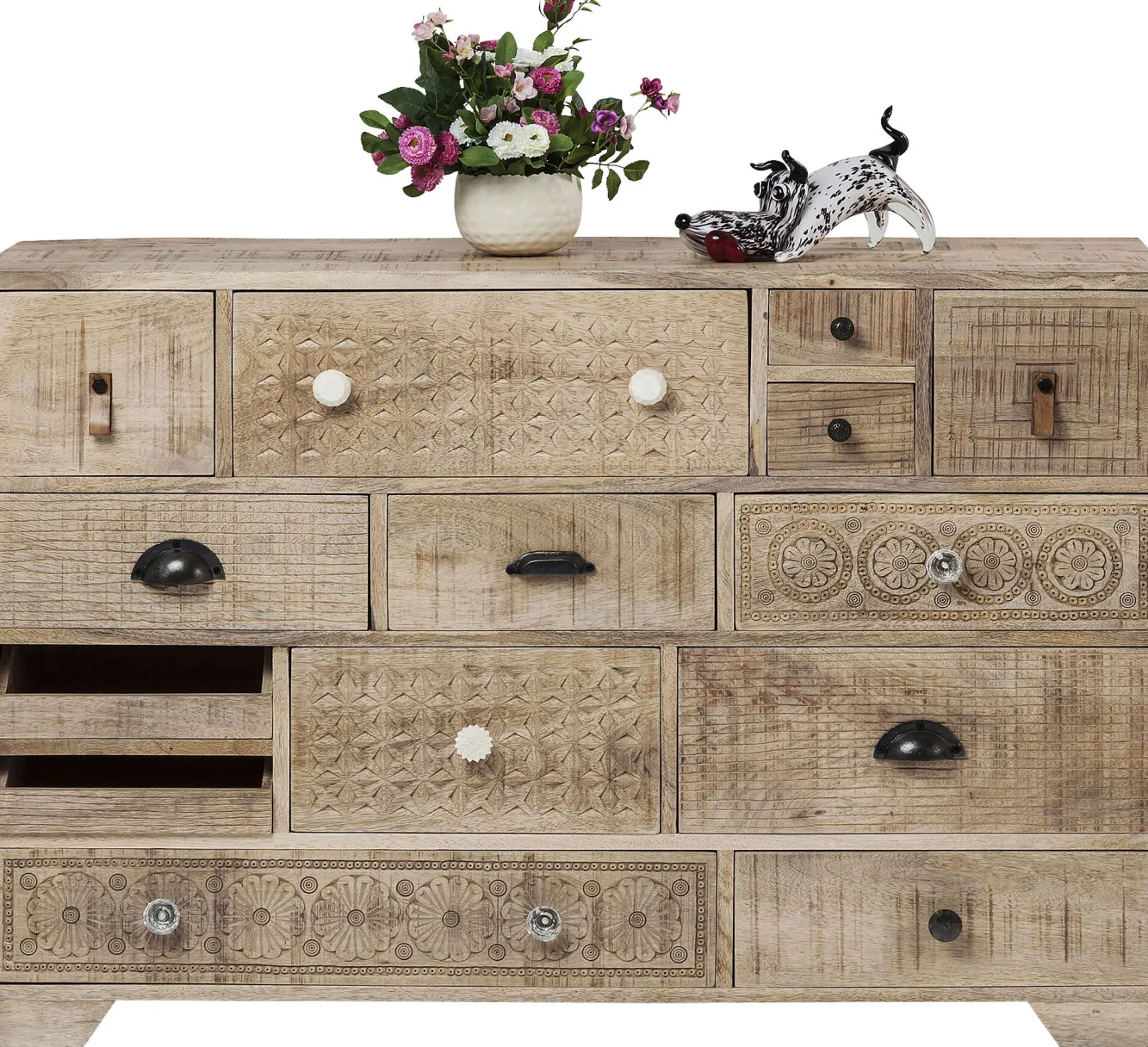 Nowoczesna komoda drewniana w stylu prowansalskim z kolekcji Puro oczaruje Was od pierwszego wejrzenia. Dołącza do naszej oferty za sprawą wizjonerskiej firmy KARE. Niemiecka marka to designerski kameleon – świetnie odnajduje się w każdej wnętrzarskiej estetyce, zarówno przy minimalistycznych, jak i spektakularnych rozwiązaniach aranżacyjnych. Tutaj dostajemy bezpretensjonalny, naturalny design i misterne wzornictwo. Prezentowana komoda z 10 szufladami wykonana została z egzotycznego drewna mango, charakteryzującego się przytulną kolorystyką i wyraźnie zaznaczonym rysunkiem słojów. Stylowe zdobienia, eklektyczne detale i ponadczasowe piękno drewna stanowią dla tej komody kanwę szerokich aranżacyjnych możliwości.