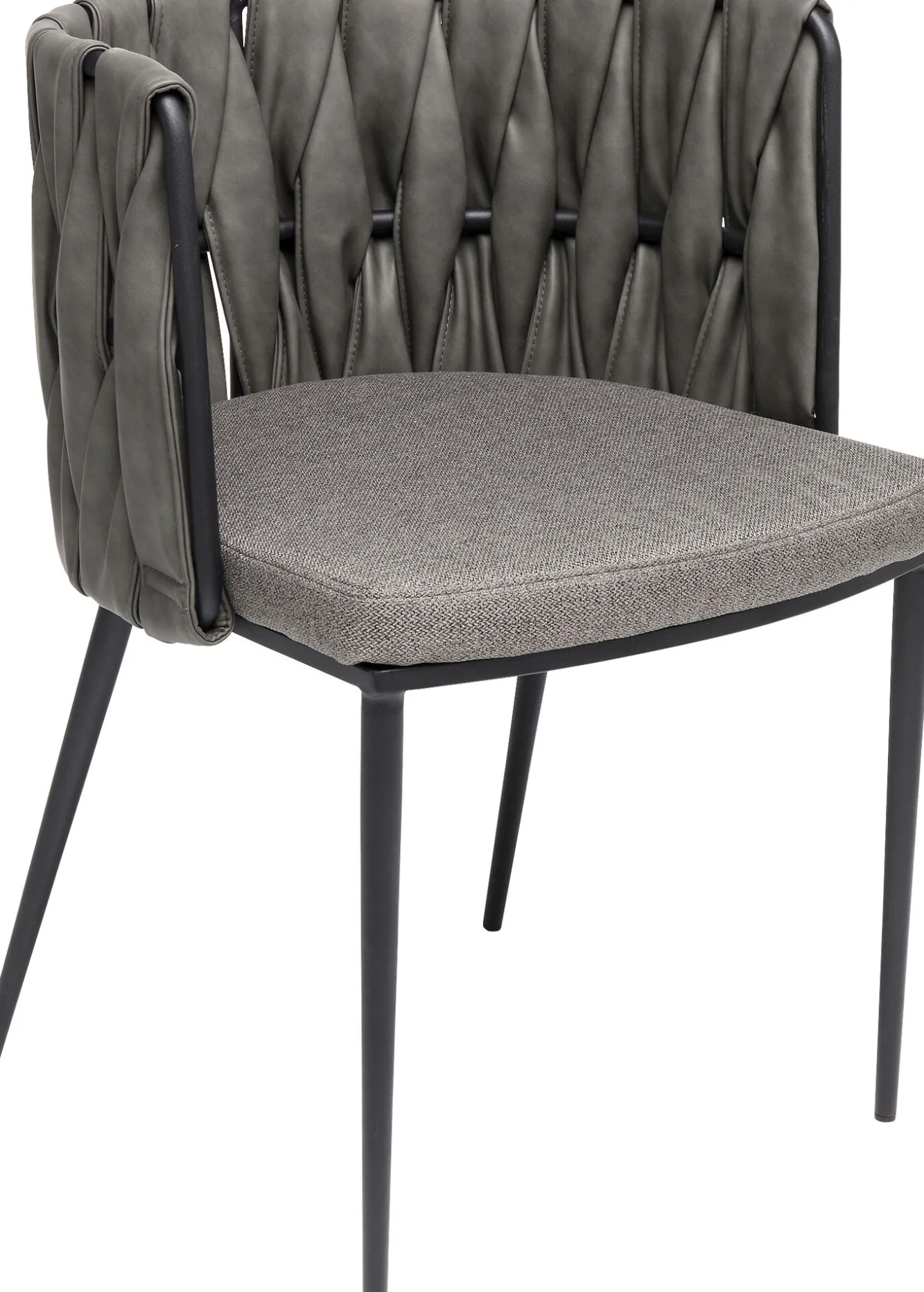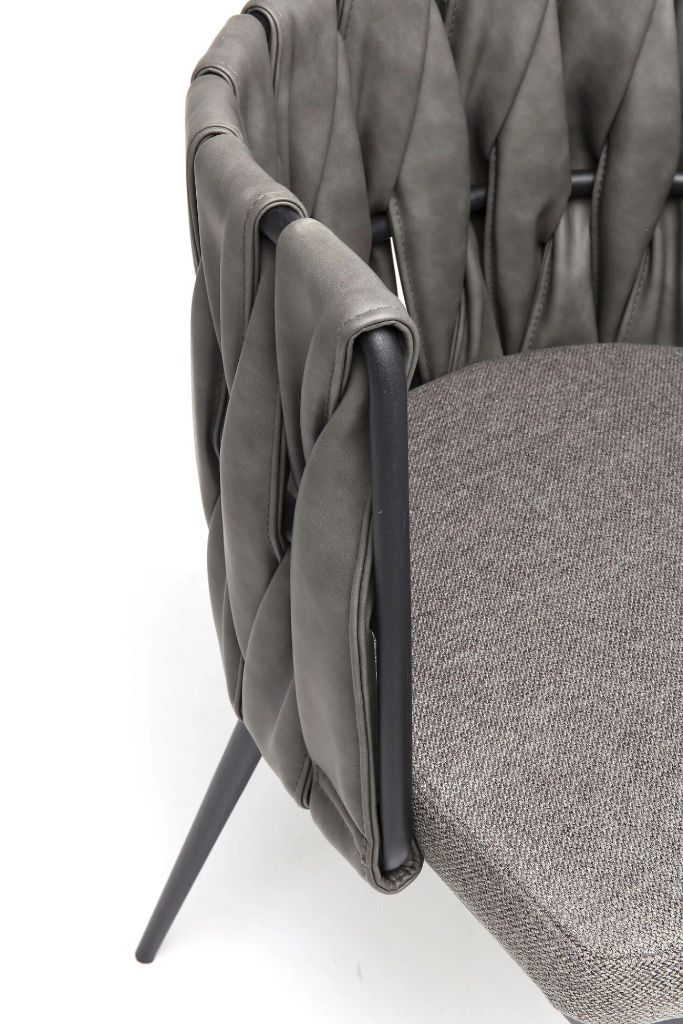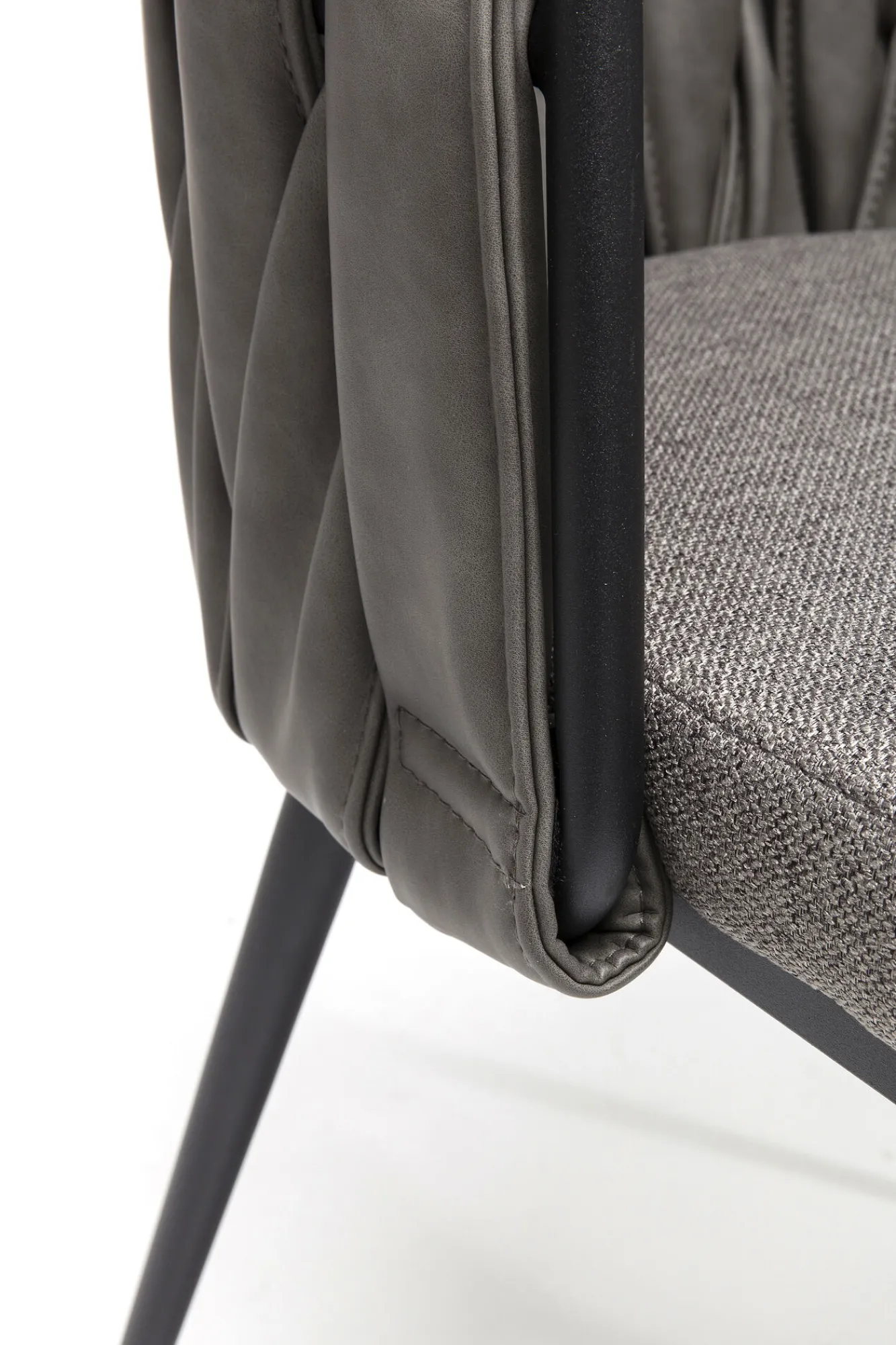 Nowoczesne krzesło z podłokietnikami w stylu industrialnym Cheerio oferuje szeroki wybór wariantów kolorystycznych – tutaj krzesło tapicerowane szare z czarnymi nogami ze stali.