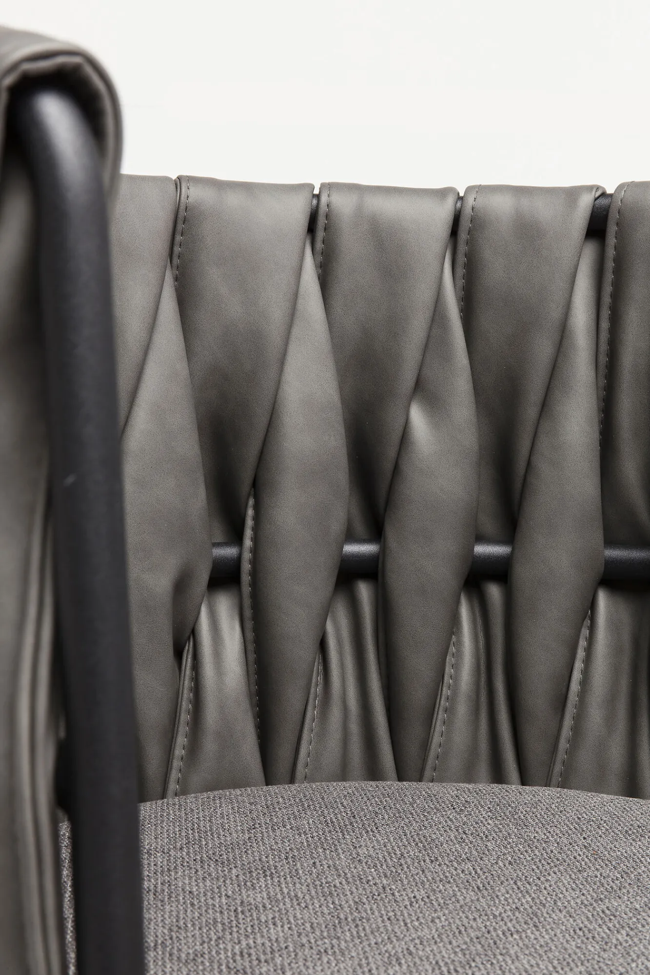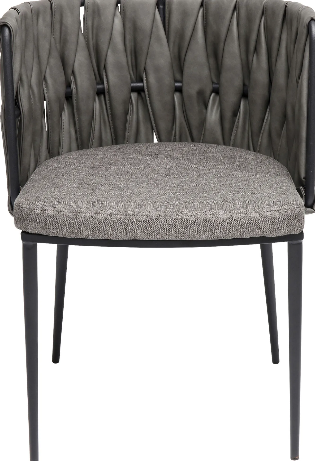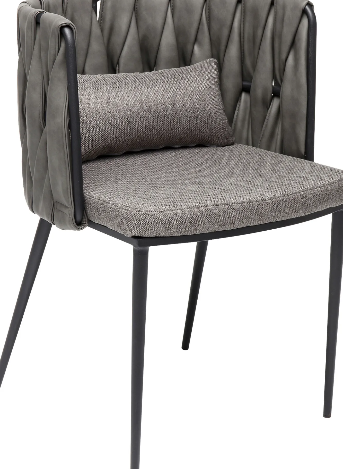 Nowoczesne krzesło z podłokietnikami w stylu industrialnym Cheerio oferuje szeroki wybór wariantów kolorystycznych – tutaj krzesło tapicerowane szare z czarnymi nogami ze stali.