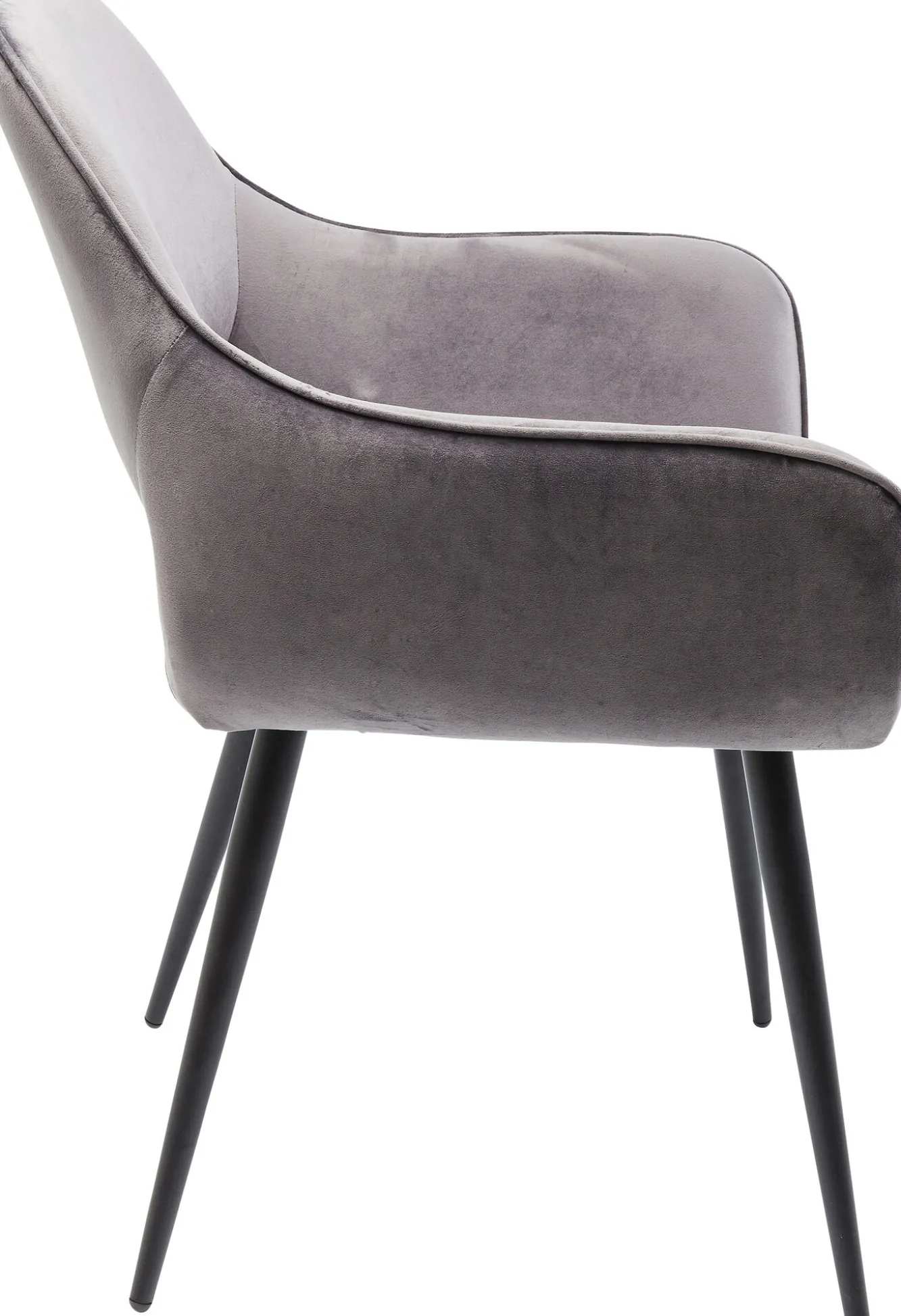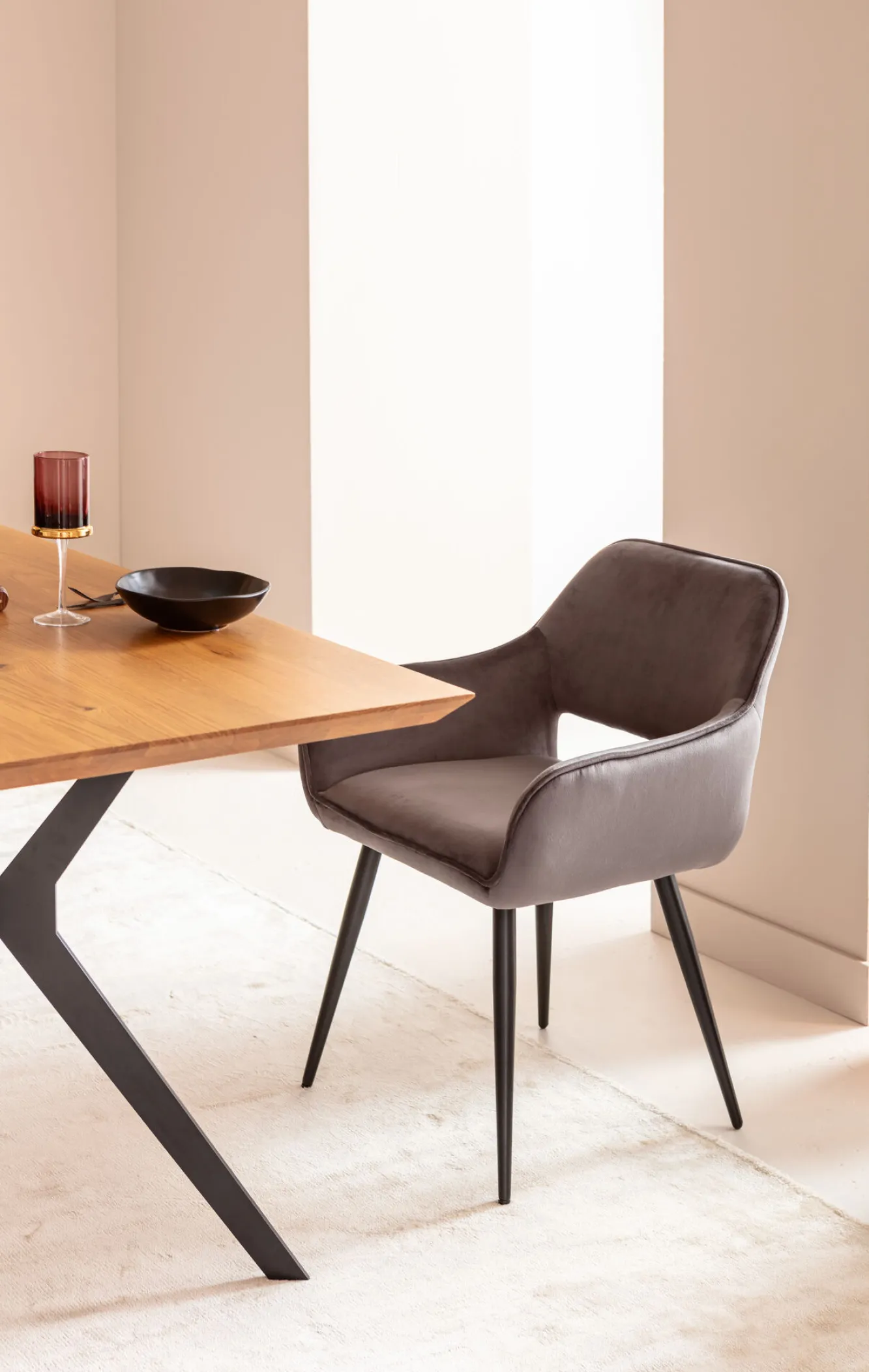 Nowoczesne krzesła z podłokietnikami w stylu skandynawskim San Francisco oferują szeroki wybór wariantów kolorystycznych – tutaj szare krzesło tapicerowane na stalowych czarnych nogach.