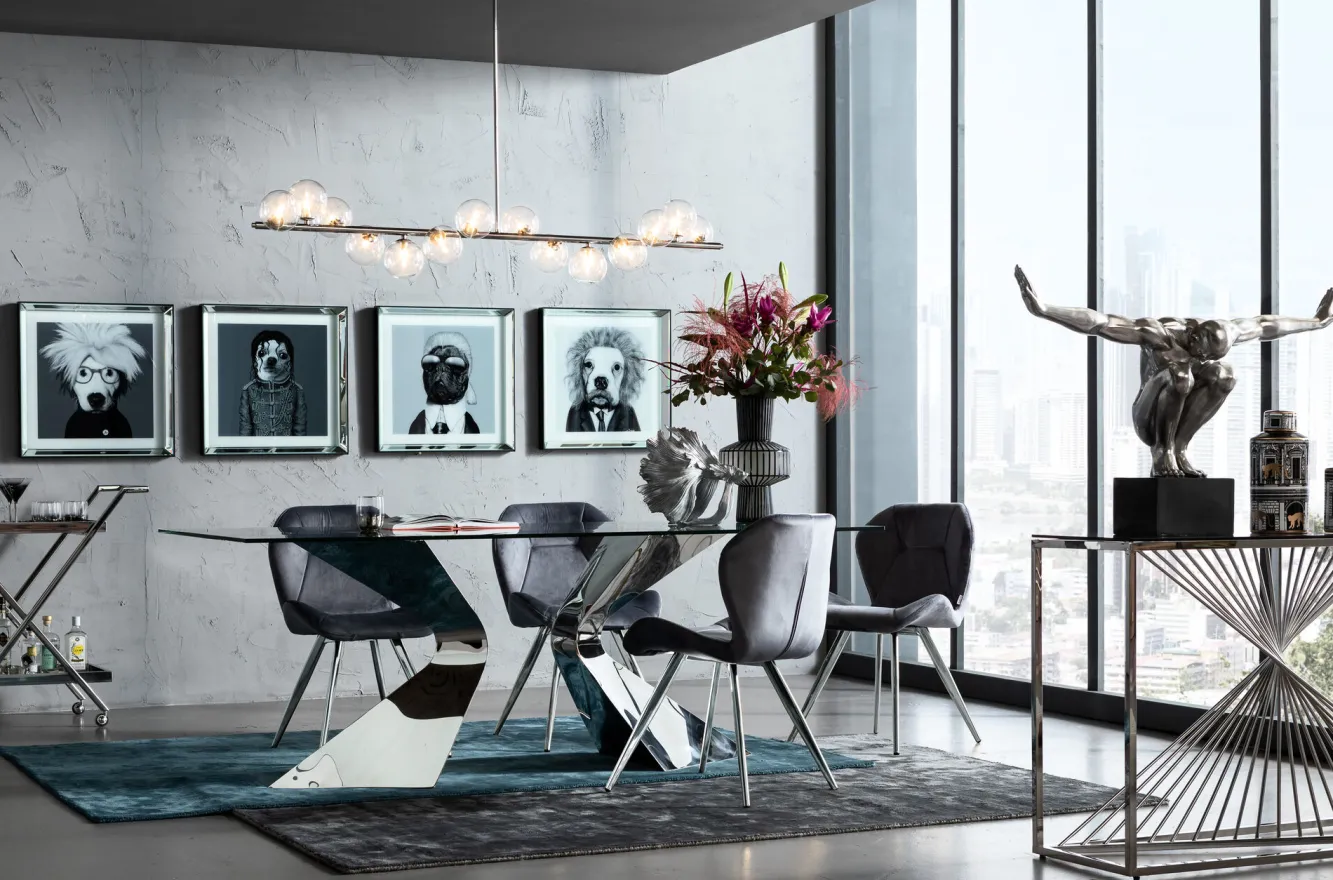 W jakich aranżacjach możesz umieścić krzesła do jadalni Viva Chrome? Eleganckie i uniwersalne połączenie kolorystyczne, w postaci szarości i srebra, pozostawia wiele możliwości. Może to być styl nowoczesny, gdzie powierzchnie współgrające ze światłem, jak te o chromowanym wykończeniu, są zdecydowanie mile widziane. Jeśli marzy ci się luksusowy styl glamour, tam również takie krzesła się sprawdzą. Świetnie będą wyglądały z lekkim optycznie stołem ze szklanym blatem.