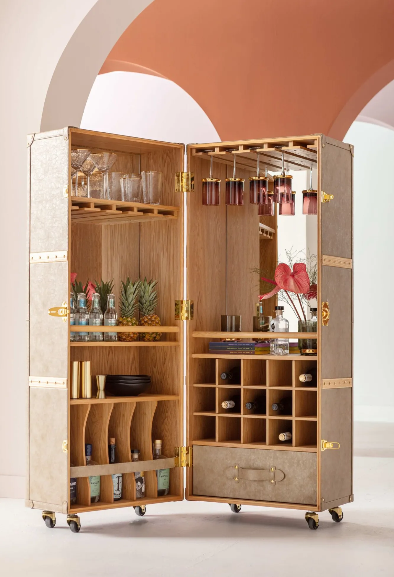 Designerski barek na kółkach z linii West Coast to propozycja niemieckiej marki Kare dla wszystkich fanów oryginalnego wzornictwa, które swe inspiracje czerpie również z przeszłości. Rozkładany model obity skórą ekologiczną i delikatnie ozdobiony lśniącymi zatrzaskami, o subtelnym designie, kryje wewnątrz niesłychany wybór schowków stwarzających możliwość wybornej organizacji. Półki, dzielona wnęka, szuflada, stojak na wino, uchwyty na kieliszki – wszystkie one dadzą dużą frajdę w ich uzupełnianiu, dodatkowo pozwalając na optymalne zorganizowanie i uporządkowywanie domowych zapasów trunków oraz akcesoriów barowych. Prezentowany designerski rozkładany barek na kółkach tapicerowany brązową ekoskórą najlepiej odnajdzie się w klasycznych, tchnących duchem czasu wnętrzach.