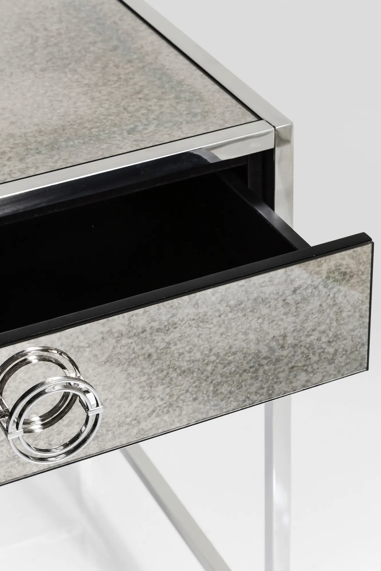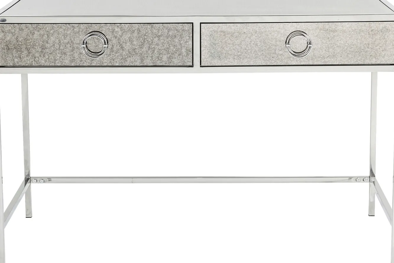 Kolekcja nowoczesnych srebrnych mebli w stylu glamour Moonscape obejmuje kilka elementów wyposażenia wnętrz – tutaj biurko ze szkła z 2 szufladami.