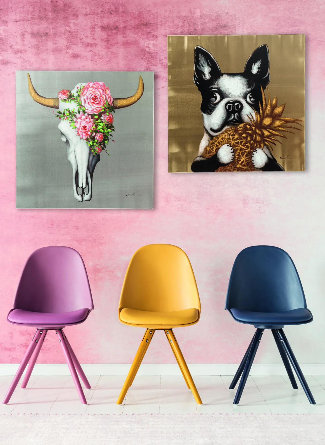 Obraz Touched Dog with Pineapple 80×80 cm Część obrazu została namalowana ręcznie.