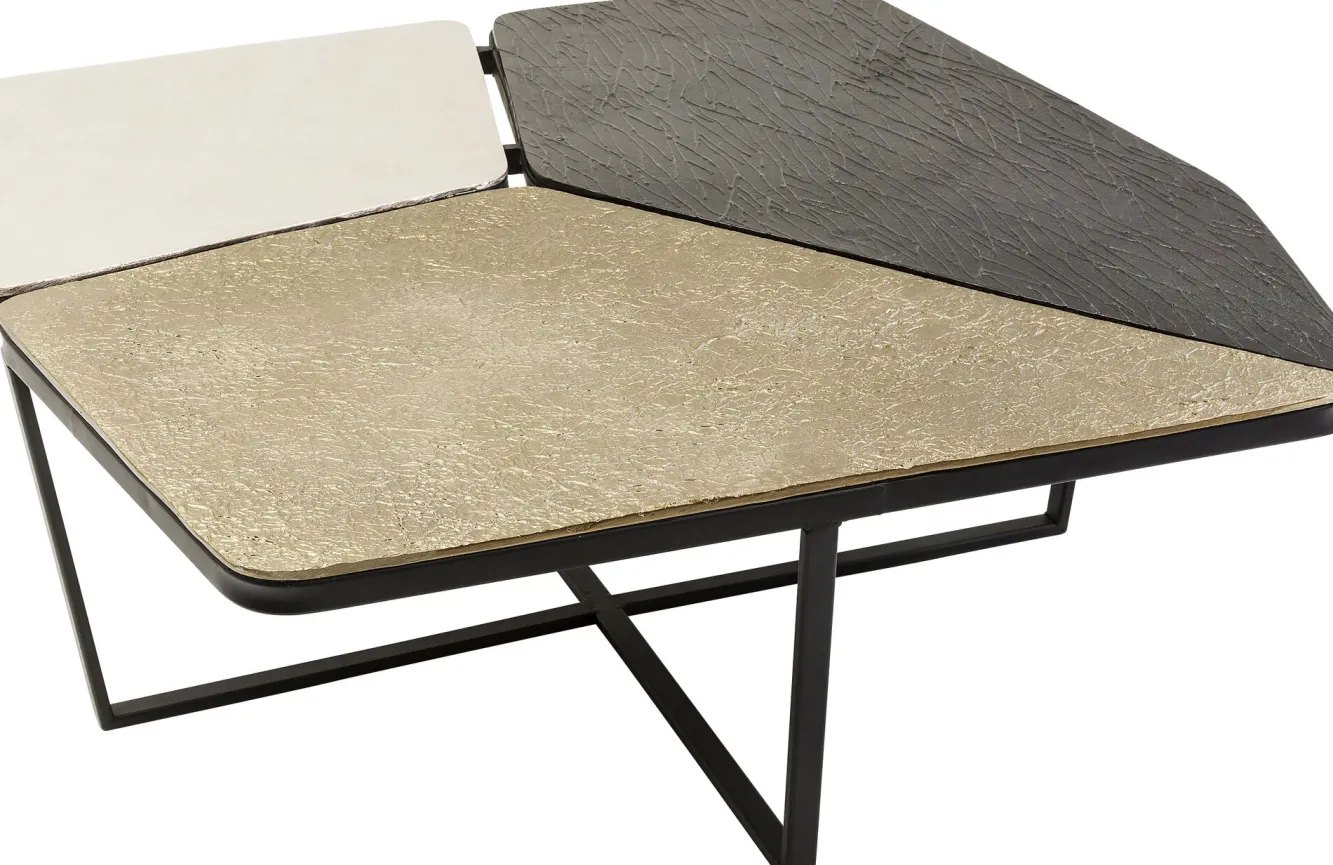 Awangardowy stalowy stolik kawowy w stylu nowoczesnym Patches dostępny jest w kilku wariantach kolorystycznych – tutaj kolorowy stolik kawowy z asymetrycznym blatem.
