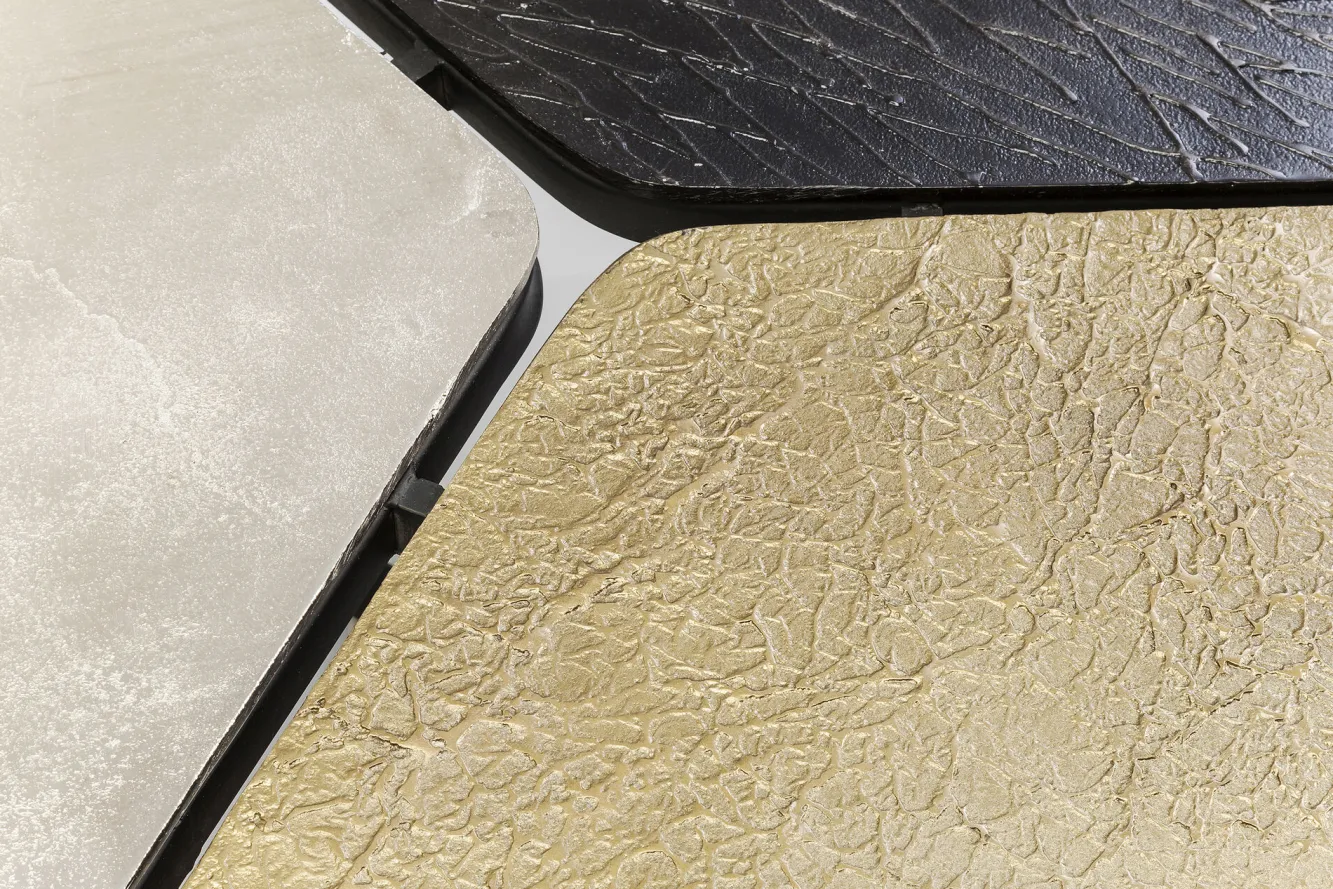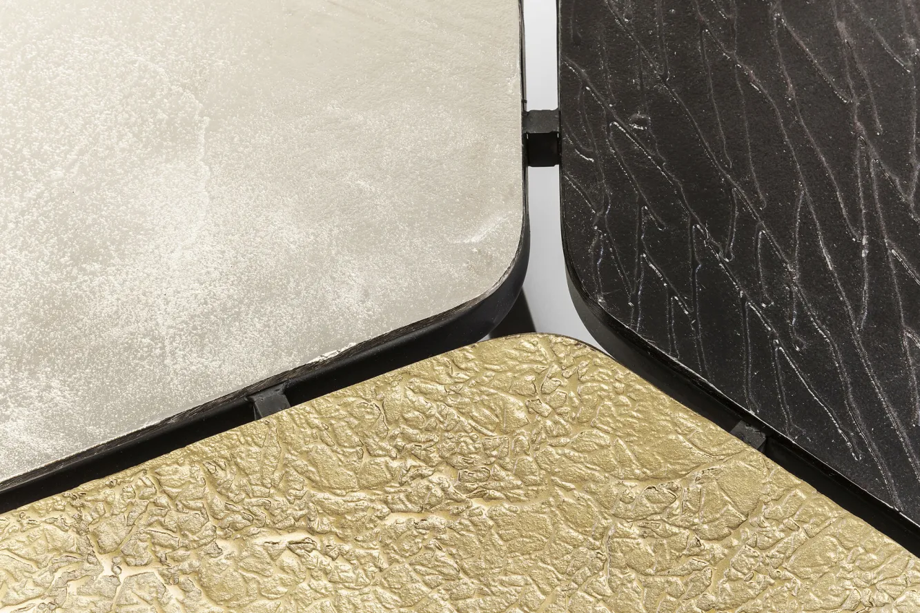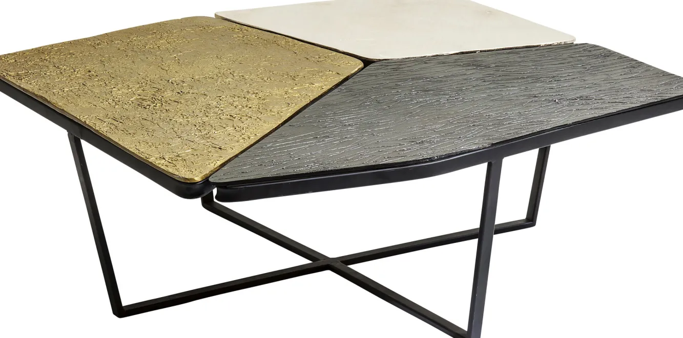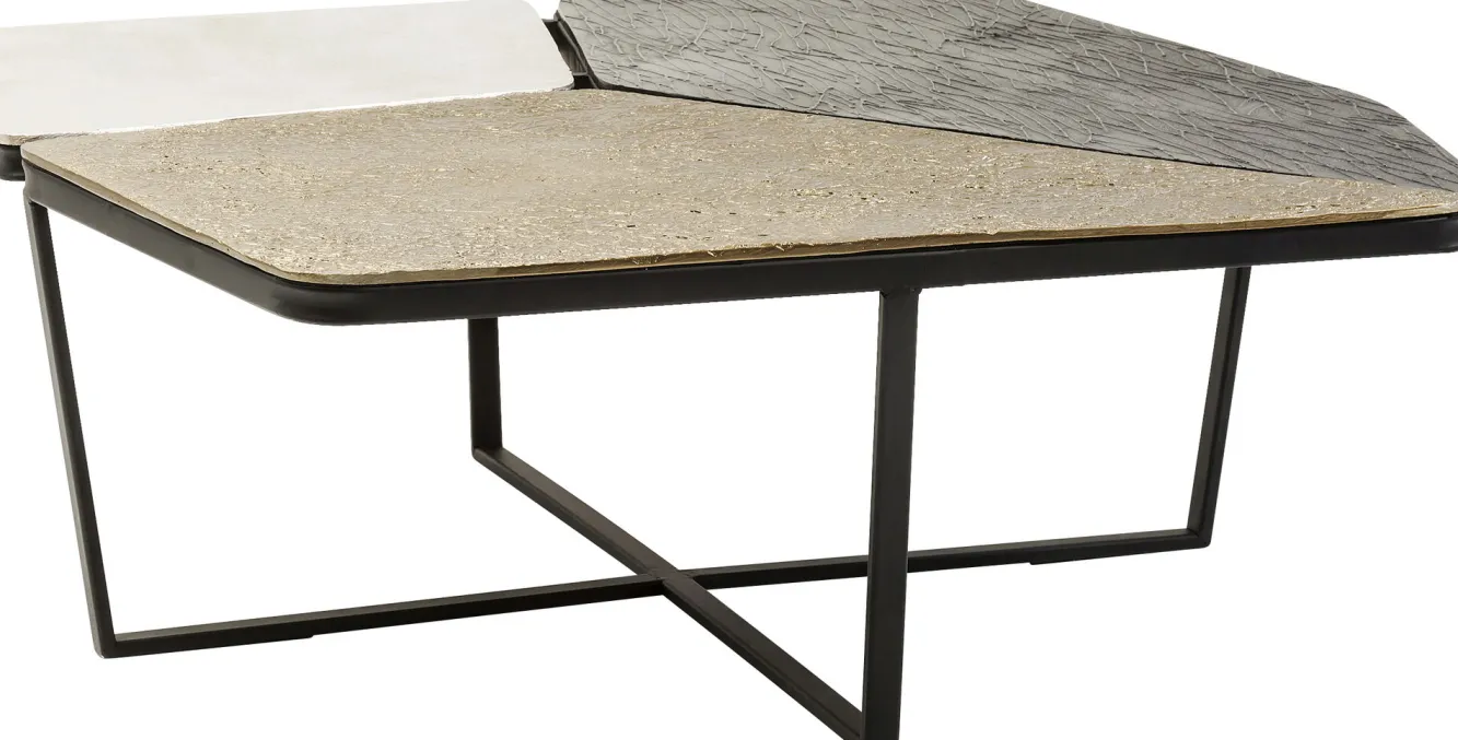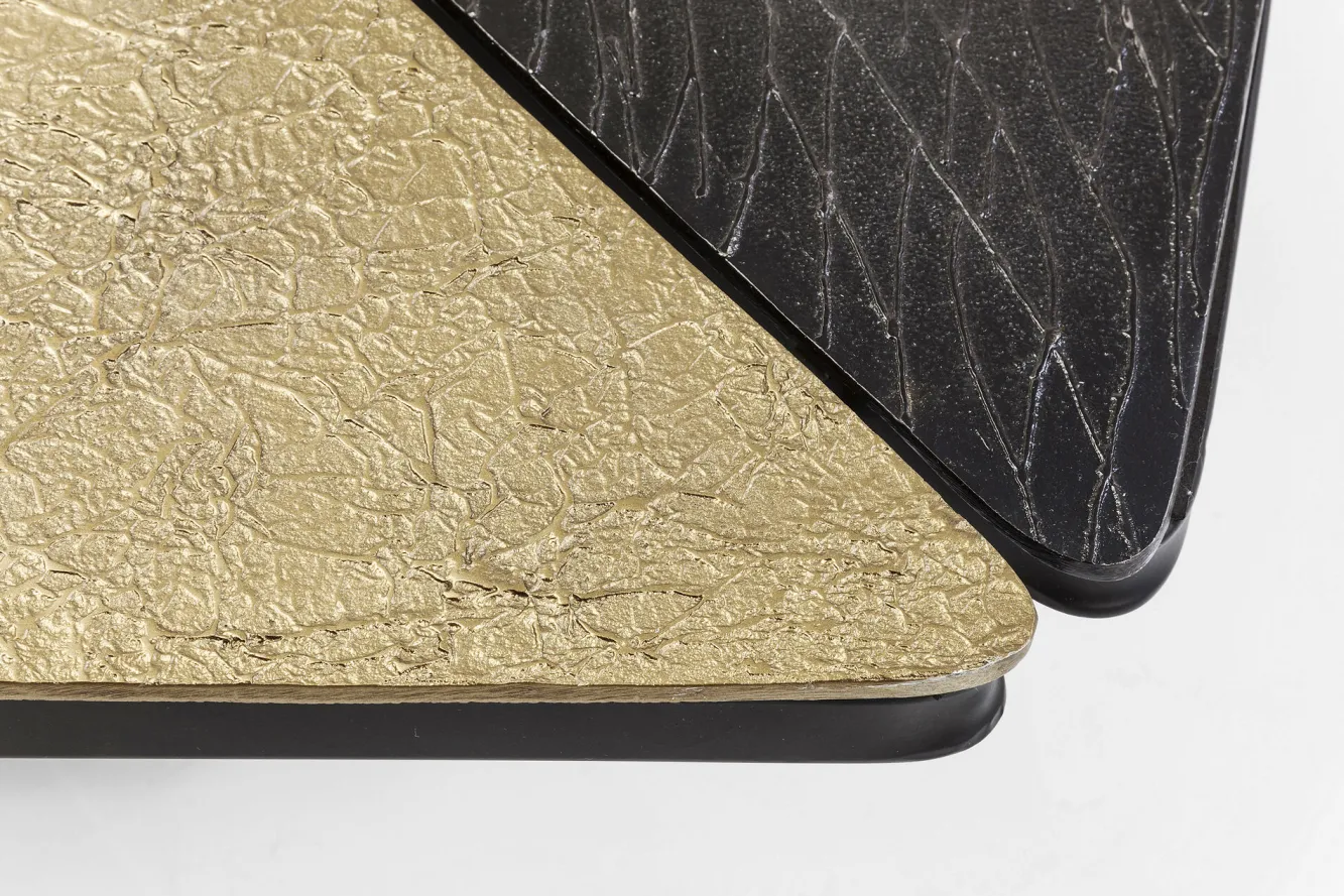 Jeśli jesteście miłośnikami innowacyjnego, nieszablonowego designu, ten awangardowy stalowy stolik kawowy w stylu nowoczesnym Patches bez wątpienia przykuje Waszą uwagę i zapragniecie mieć go w salonie. Za tą propozycją skrywa się, ikona współczesnego wzornictwa, firma KARE. Wizjonerska niemiecka marka, której przewodnikiem po świecie jest wyobraźnia, słynie z bezkompromisowości i trudnej do podrobienia estetyki. Tutaj producent, w efektownej wizualnie odsłonie, oddaje równie praktyczny mebel na stalowych, solidnych nogach typu krzyżak w kolorze czarnym. Łączą się one z asymetrycznym blatem z aluminium, podzielonym na 3 części w różnych kolorach: brązu, niklu oraz mosiądzu. Z tej nietypowej kompozycji wyłania się oryginalny stolik kawowy doskonale odpowiadający nowoczesnym koncepcjom aranżacyjnym