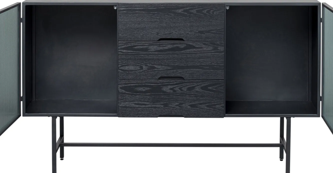 Komoda loft z 3 szufladami czarna stalowa front szkło ryflowane i MDF 150×90 cm Korpus, nogi: stal malowana proszkowo.F…