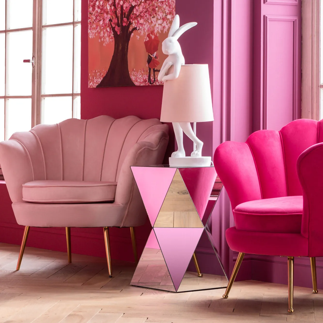 Awangardowa złota lampa stołowa w stylu nowoczesnym Animal Rabbit dostępna jest w kilku wariantach kolorystycznych – tutaj stalowa lampa stołowa biała z różowym lnianym kloszem zasilana 1 żarówką o max. mocy 5 W z gwintem E14.