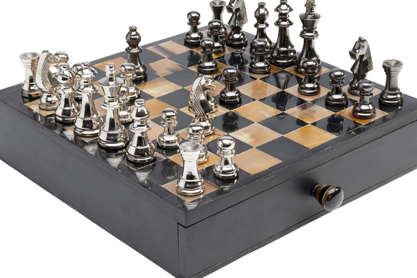 Szachy Antique 36×33 cm Materiały: MDF, róg bydlęcy, aluminium niklowane.Ręczne wykonanie. Każdy egzemplarz jest ni…