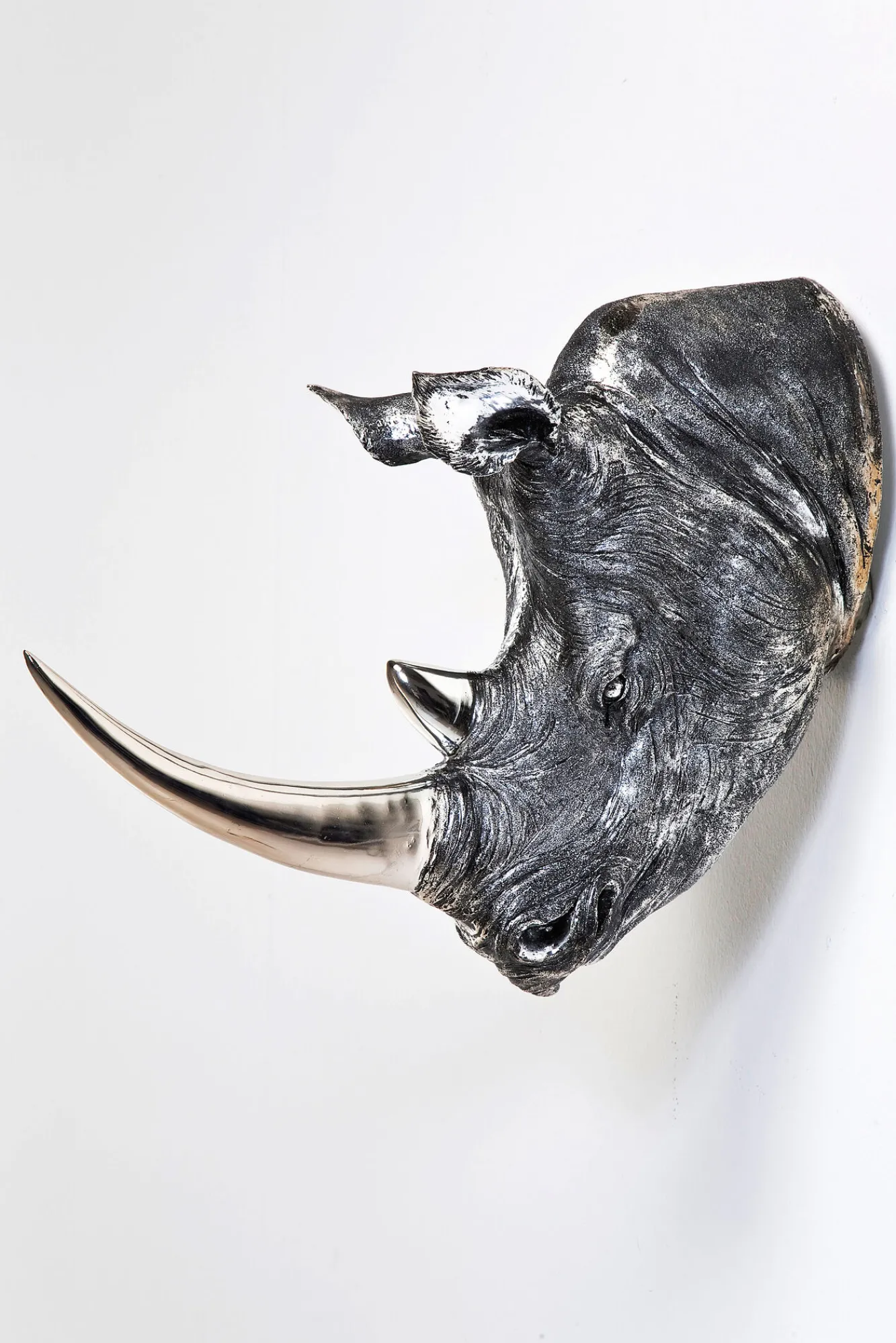 Srebrna dekoracja wisząca Head Rhino Antique marki Kare Design przedstawiająca głowę nosorożca z okazałym rogiem. Nowoczesna dekoracja wykonana z tworzywa sztucznego.